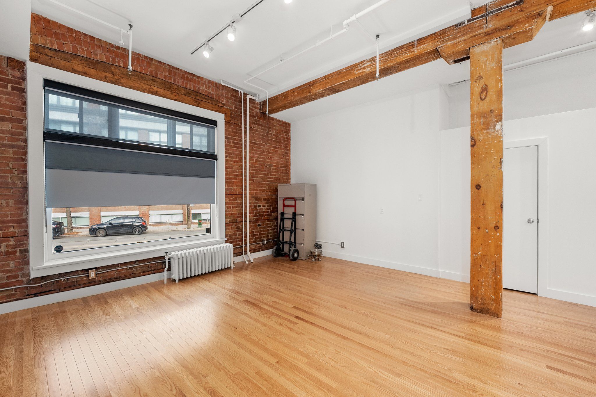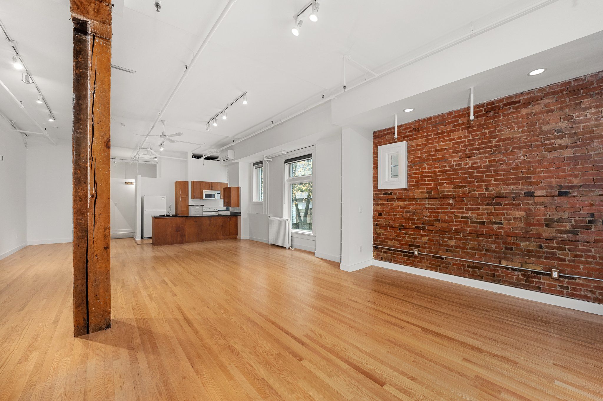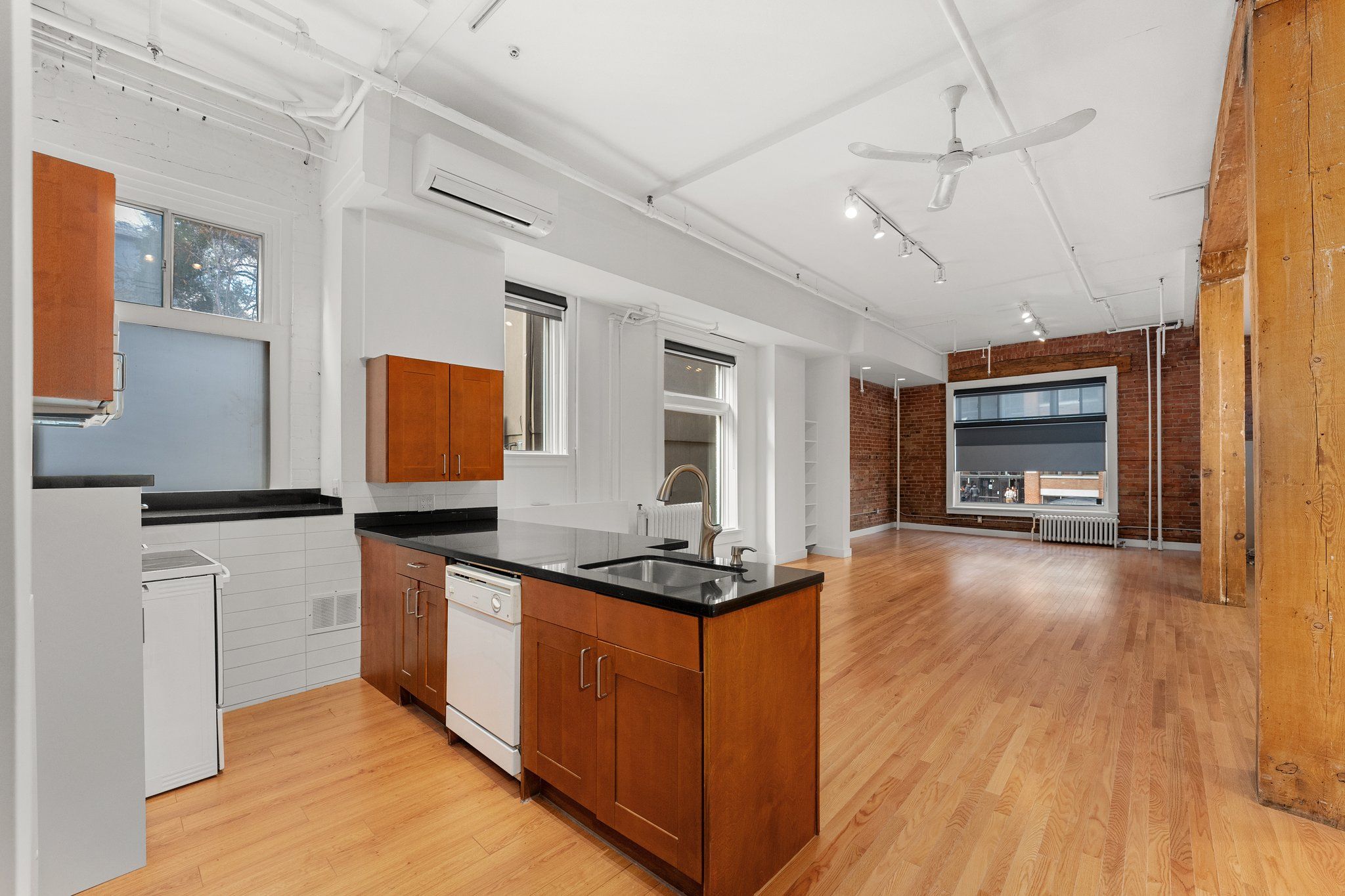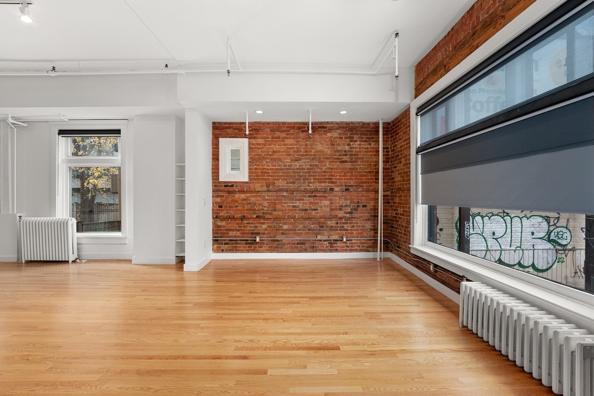 Welcome to this contemporary rare use space with an open-concept layout, boasting 12-foot ceilings and charming exposed brick walls. Sunlight floods the primary space through expansive windows, illuminating the entire area. The kitchenette features stylish wood cabinets, enhancing the aesthetic appeal. Hardwood floors throughout the unit, seamlessly connect the space. Versatility is key with a rear room, providing flexibility to suit your needs. Situated in close proximity to the downtown core, this property offers convenient access to transit and highways, ensuring you're well-connected to the pulse of the city. Embrace the modern charm and functionality of this unique space, perfect for an office or living space. Dual access with private side entrance!