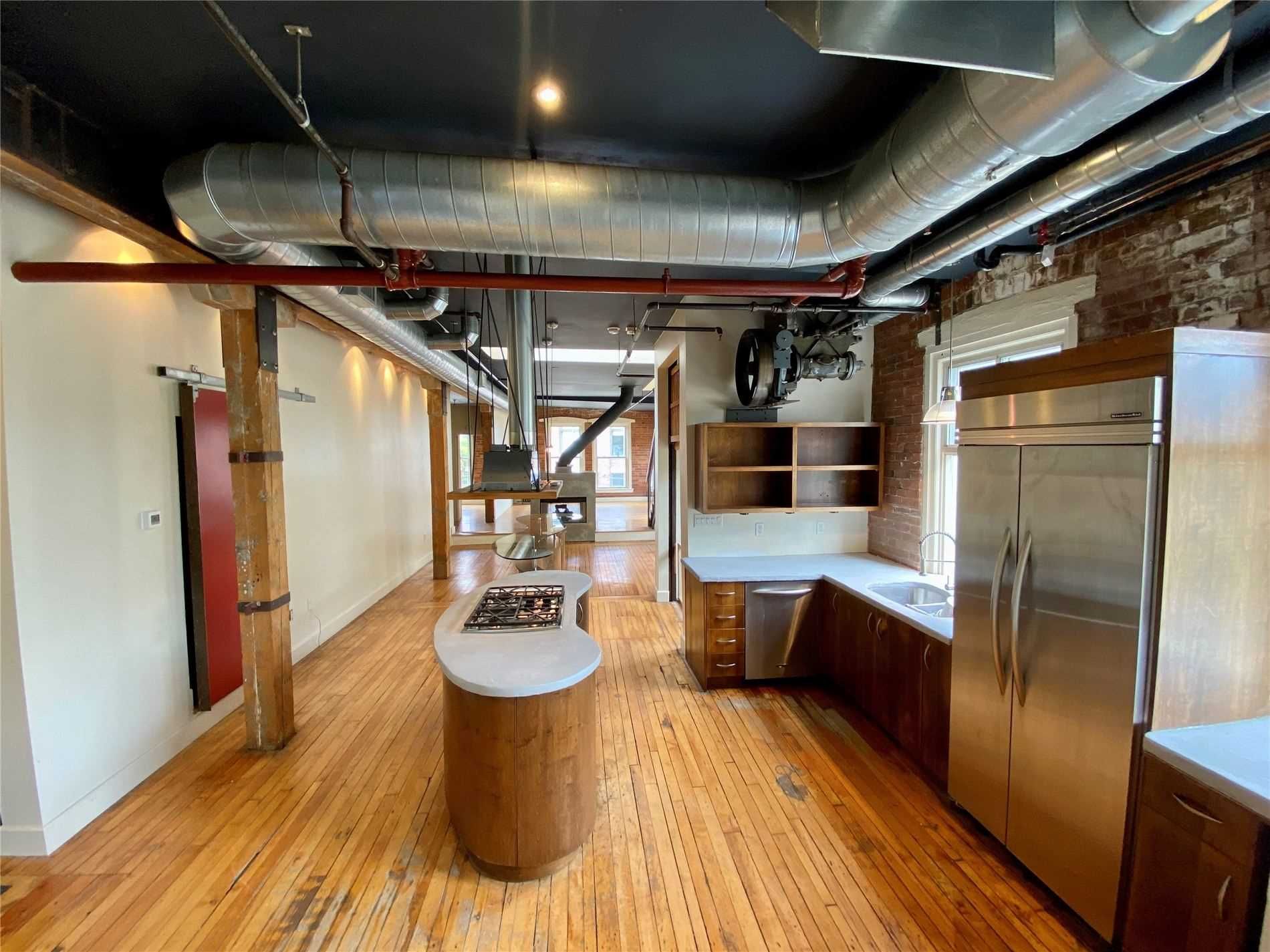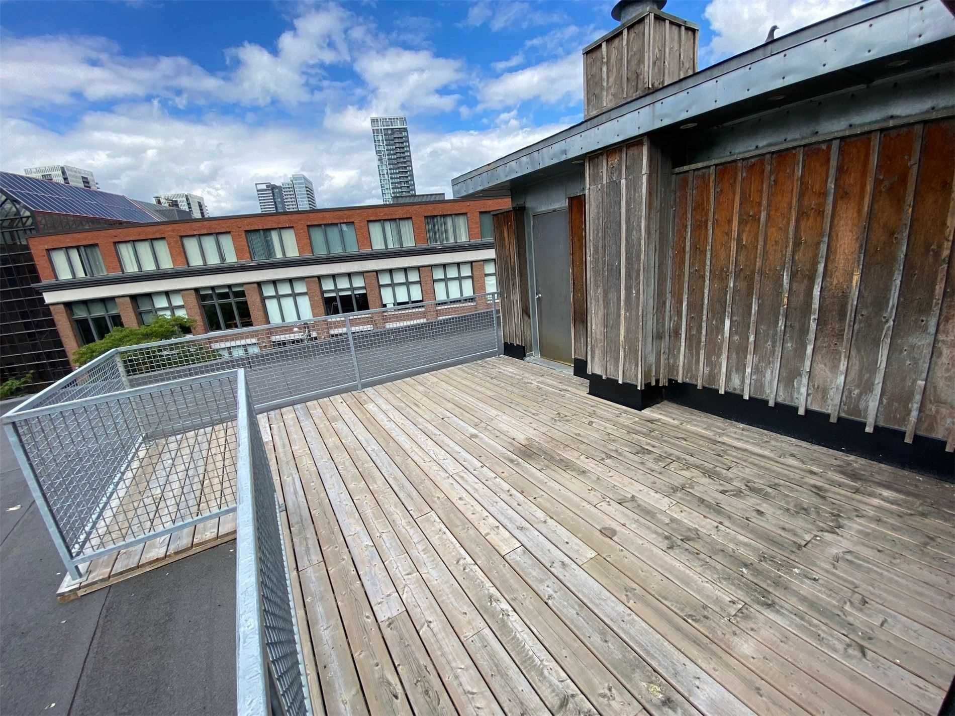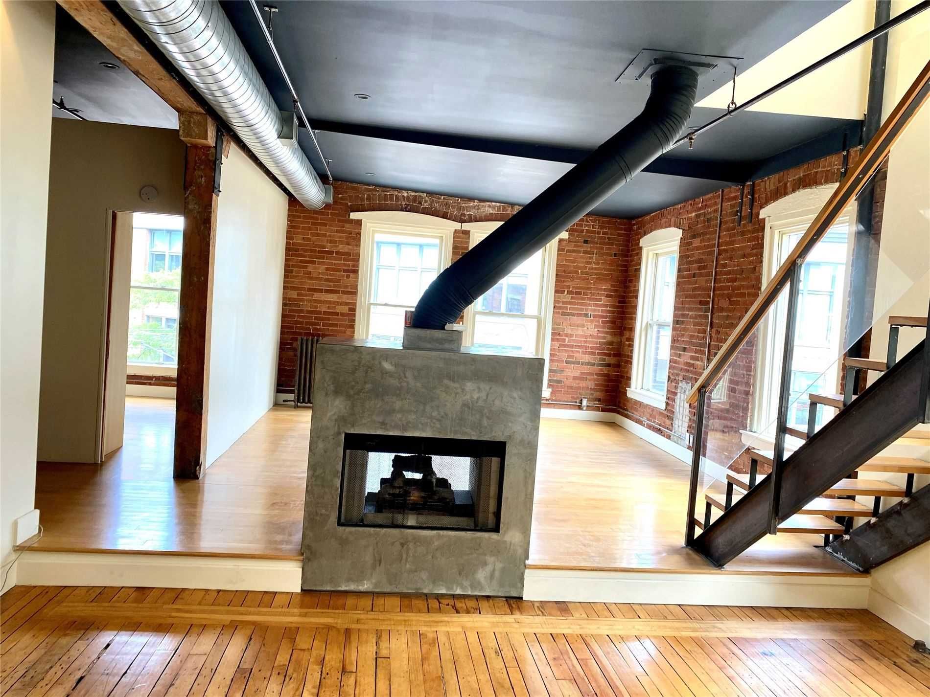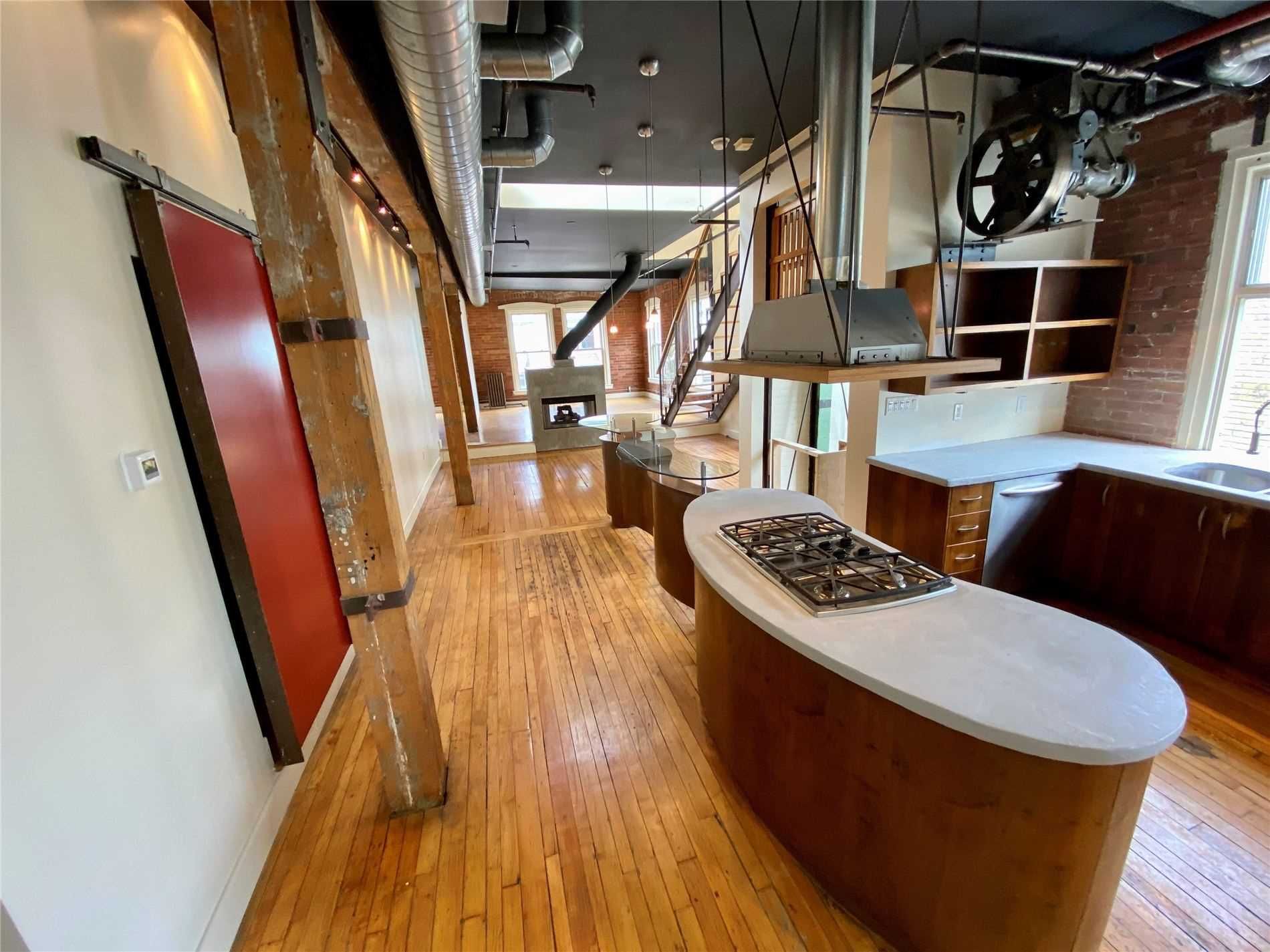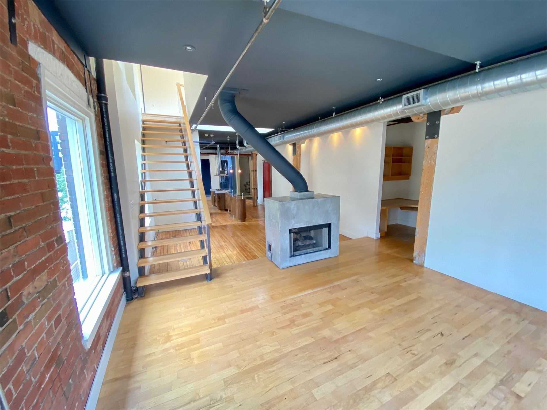 Authentic post-and-beam loft at coveted carhartt lofts! Zoned live/work, this rare offering features approximately 1,500 sq ft of dramatic open-concept space with soaring ceilings, exposed brick, and rich hardwood floors throughout. A stunning corner unit, flooded with natural light through oversized industrial windows, showcases true hard-loft character. The private primary bedroom enjoys a direct walk-out to an expansive ~400 sq ft terrace-an exceptional outdoor retreat perfect for entertaining or quiet city evenings. A unique blend of history, scale, and style, this is true loft living in one of toronto's most iconic boutique buildings. Absolutely one of a kind.