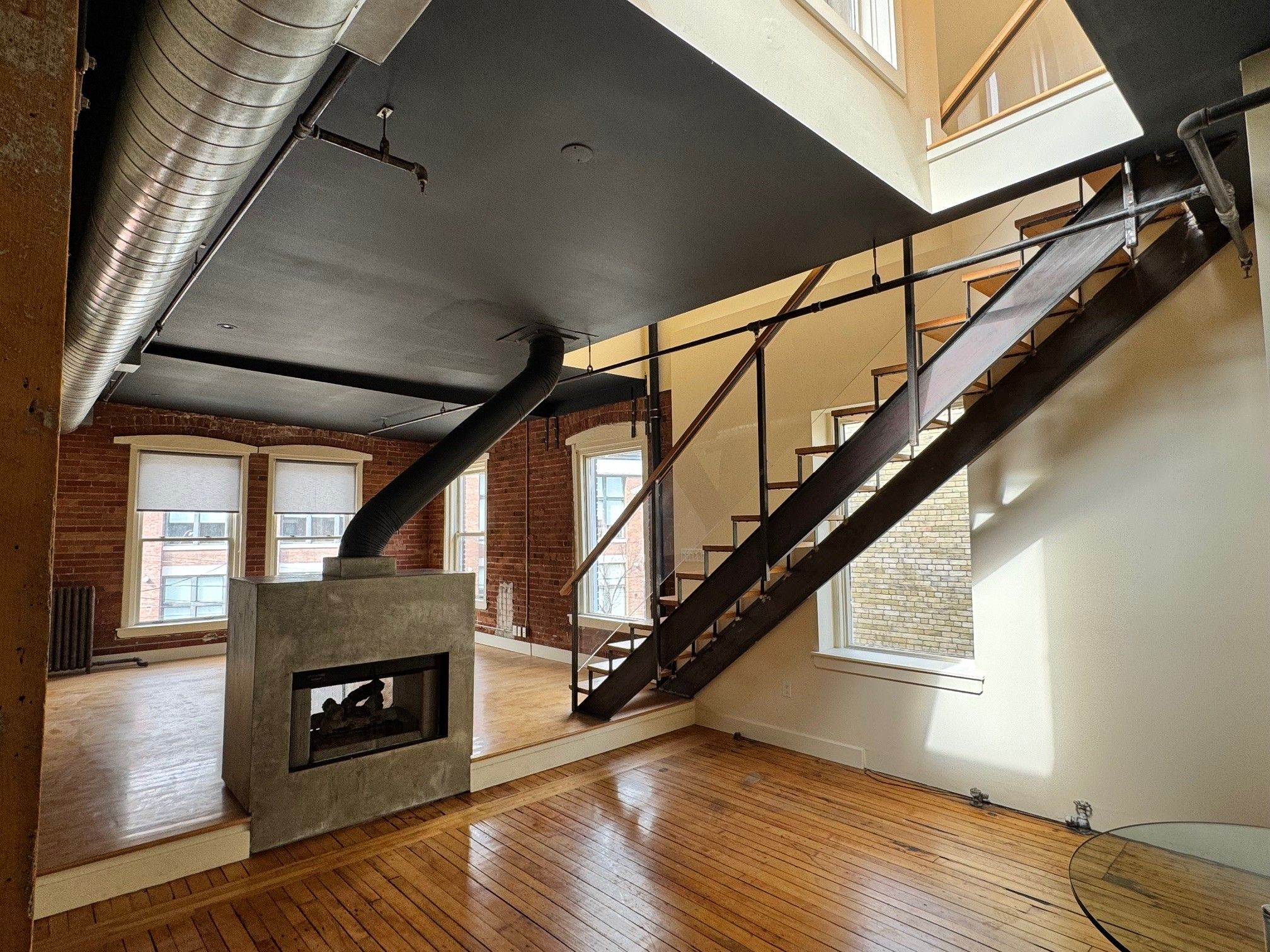 • Natural light floods in through oversized industrial windows.