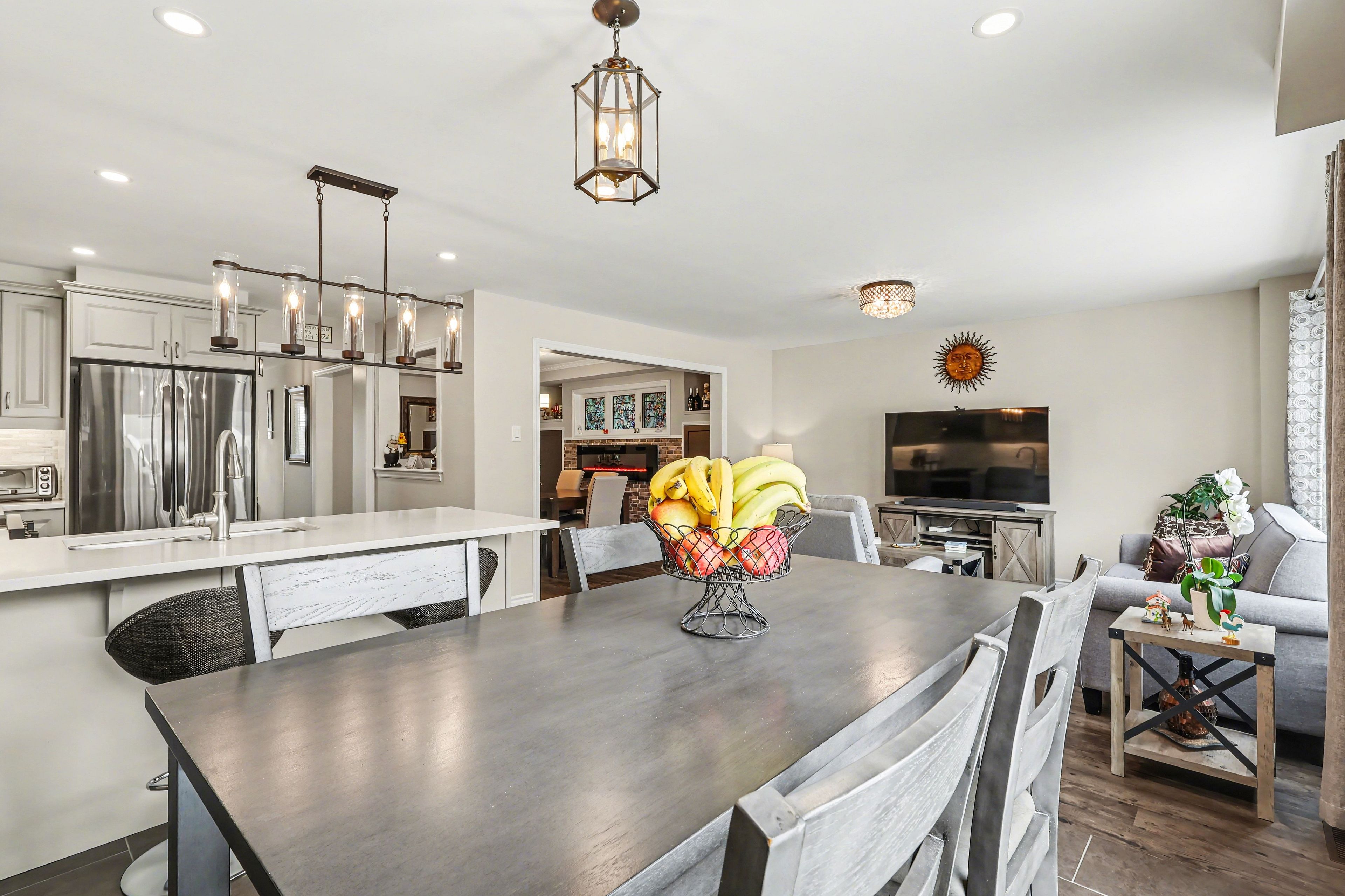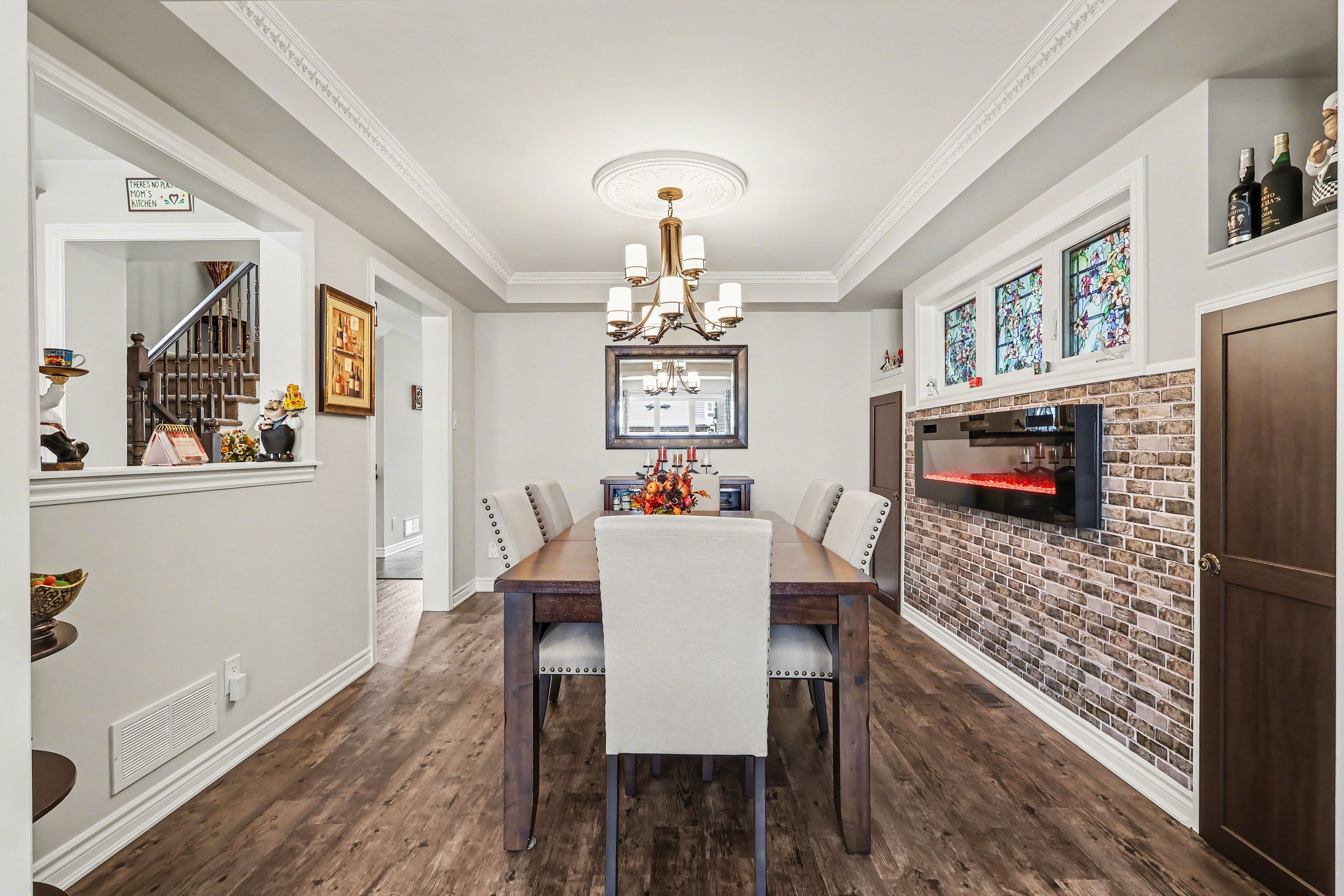 • Bright open-concept layout connects living and dining areas with electric fireplace.