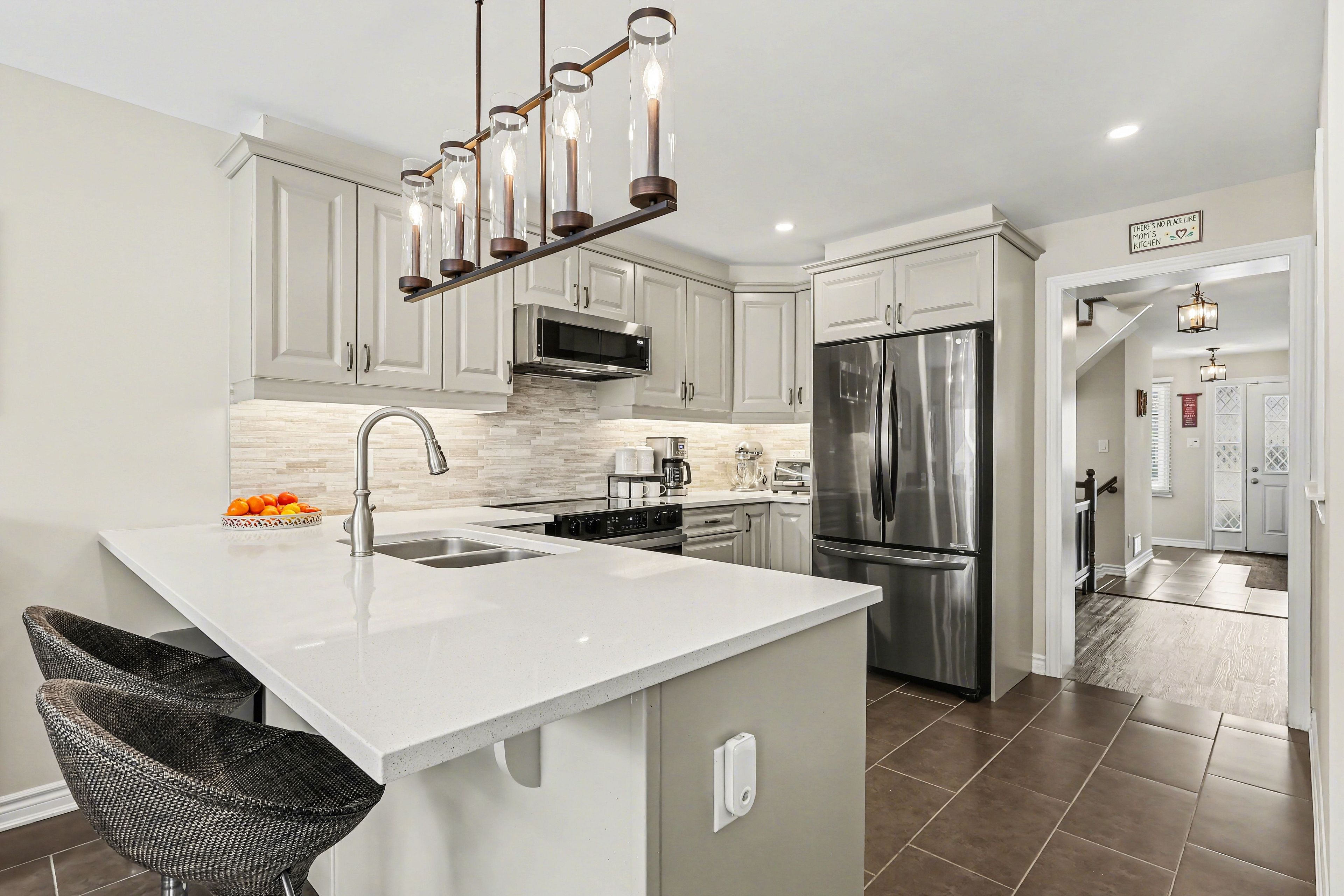 • Elegant hardwood floors and designer kitchen with quartz countertops.