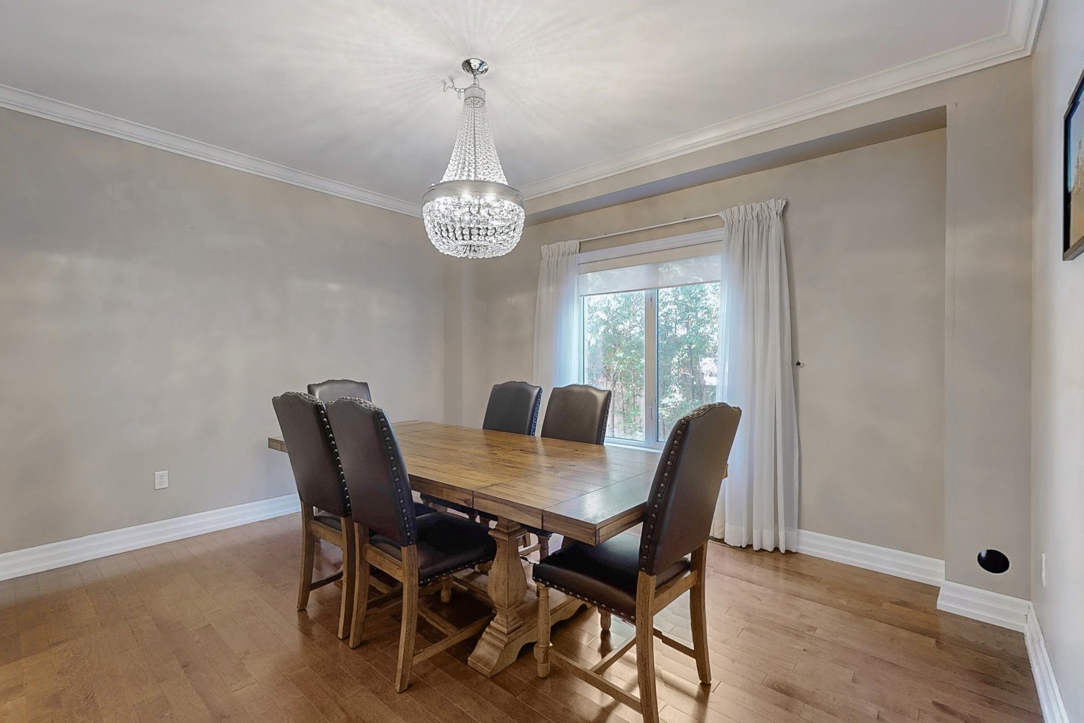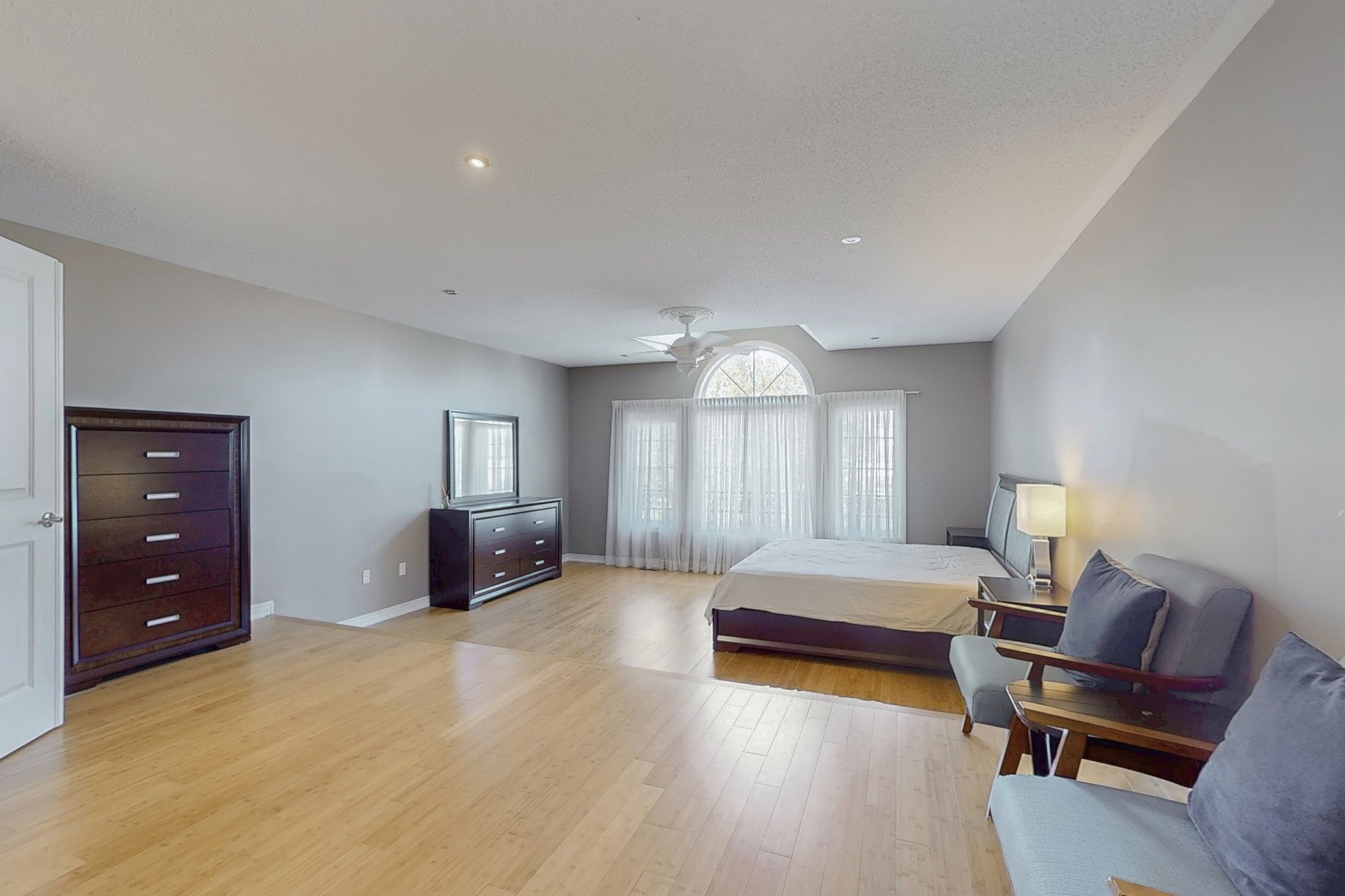 • Spacious living room with high ceilings and hardwood floors.
