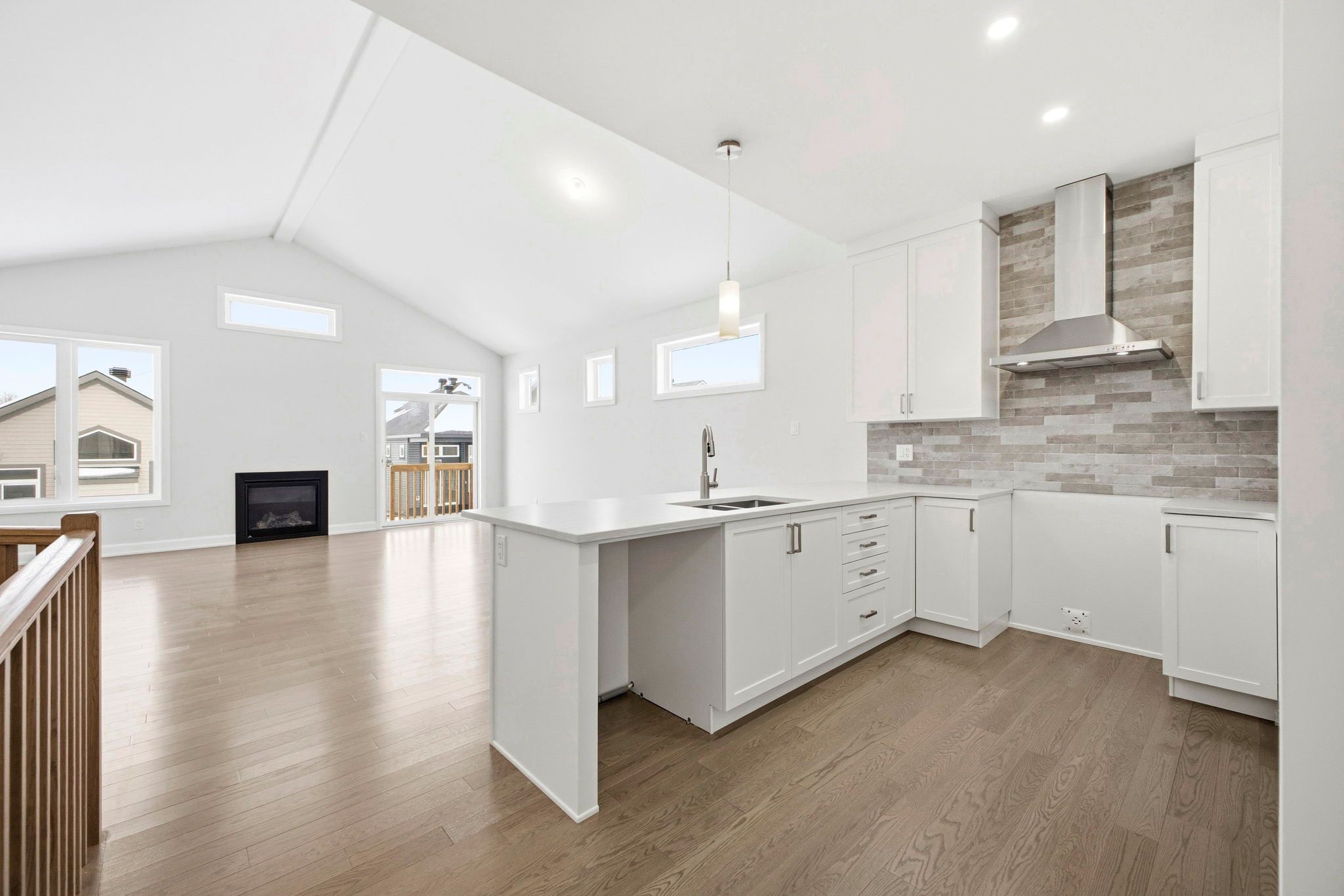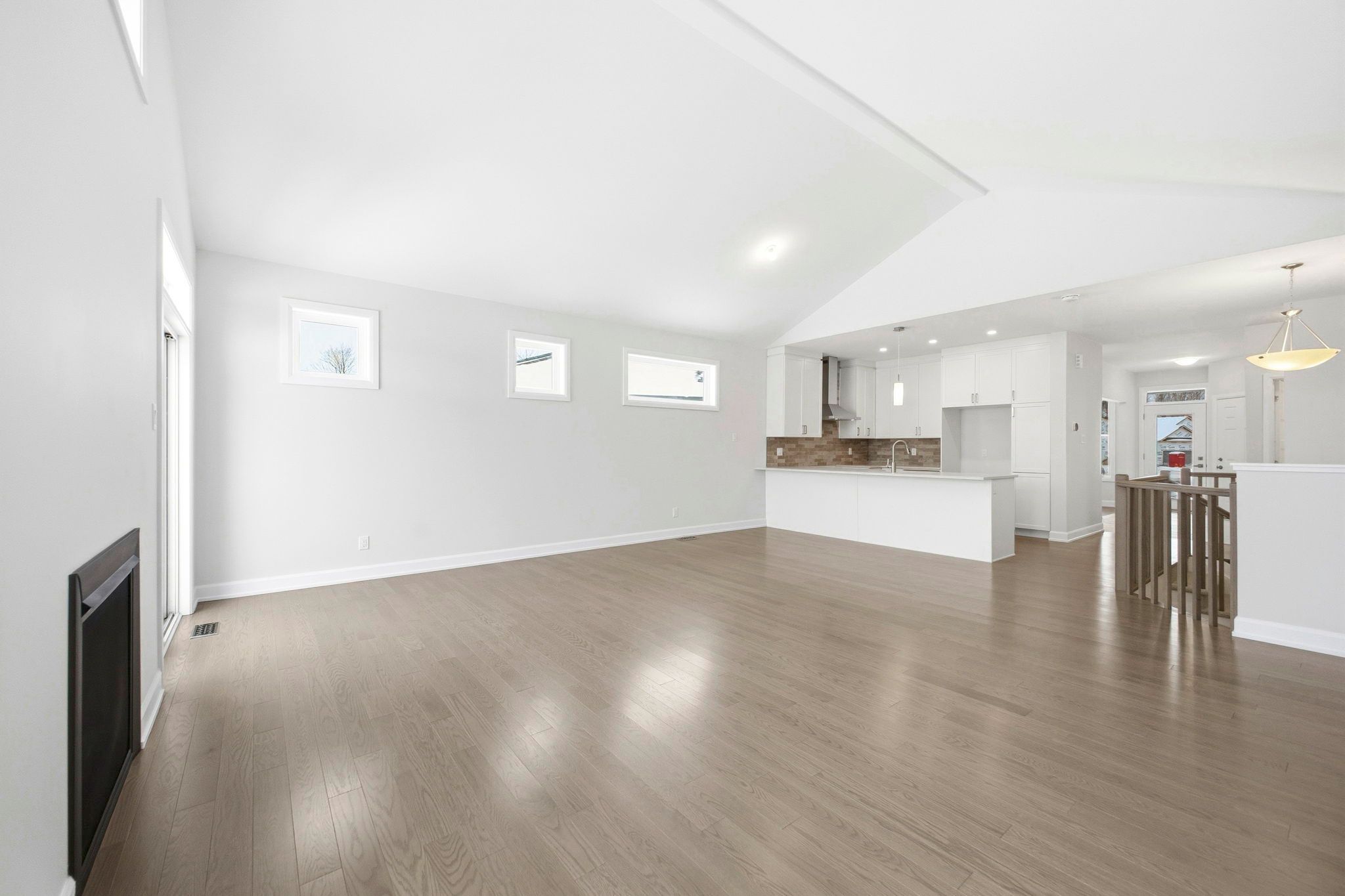 • Bright, open-concept layout with vaulted ceilings and a gas fireplace.