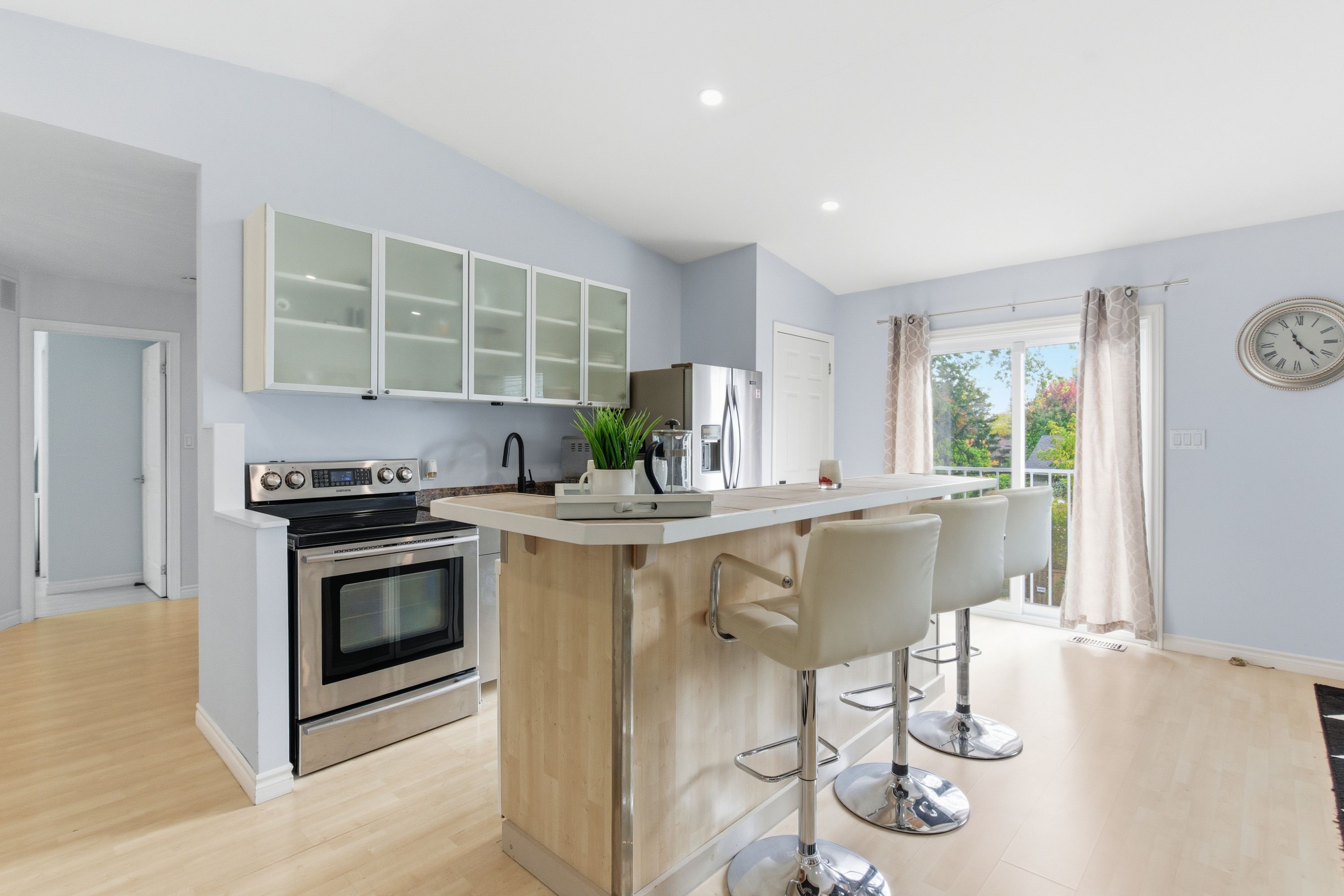 A must-see for growing families or multi-generational living in south east burlington, offering over 3,200 sq ft of beautifully finished living space and a unique, versatile layout. The main floor features a bright living area, an updated eat-in kitchen with quartz countertops and island, three spacious bedrooms, and a renovated 3-piece bath with walk-in shower. The second level offers a separate living space with its own kitchen, dining area, gas fireplace, two bedrooms, and a modern 3-piece bath-perfect for in-laws, guests, or a nanny suite. Enjoy the four-season sunroom with a cozy gas fireplace, a finished basement with pot lights for added flexibility and ambiance, and a private backyard oasis with saltwater pool, cabana, and new deck. This home features three gas fireplaces and numerous upgrades, including a pool liner (2023), sand filter (2020), heater (2018), pump (2017), roof (2018), windows and front door (2017), furnace and a/c (2016), and driveway (2022).