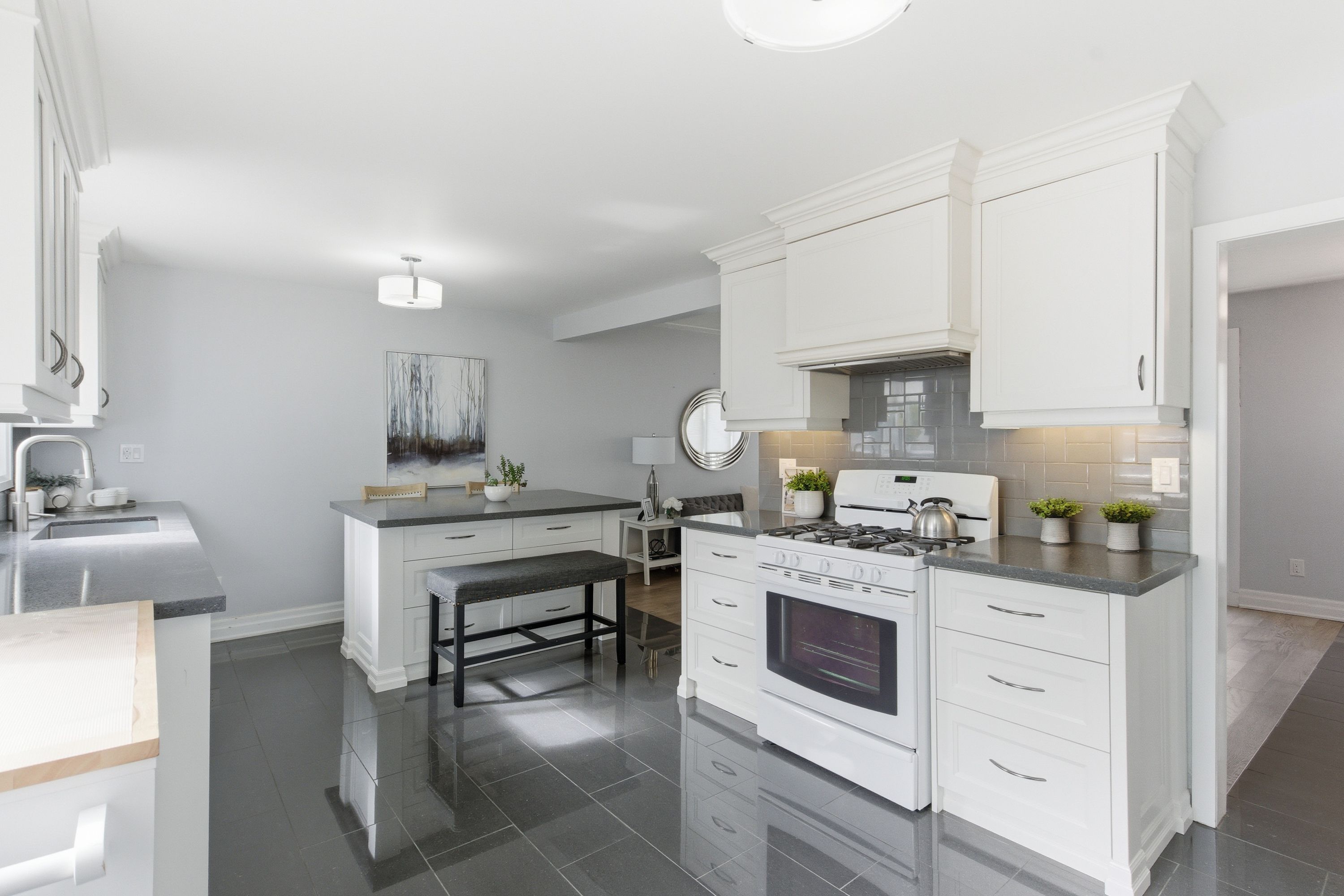 • Bright main floor with updated kitchen, quartz countertops, and three bedrooms.