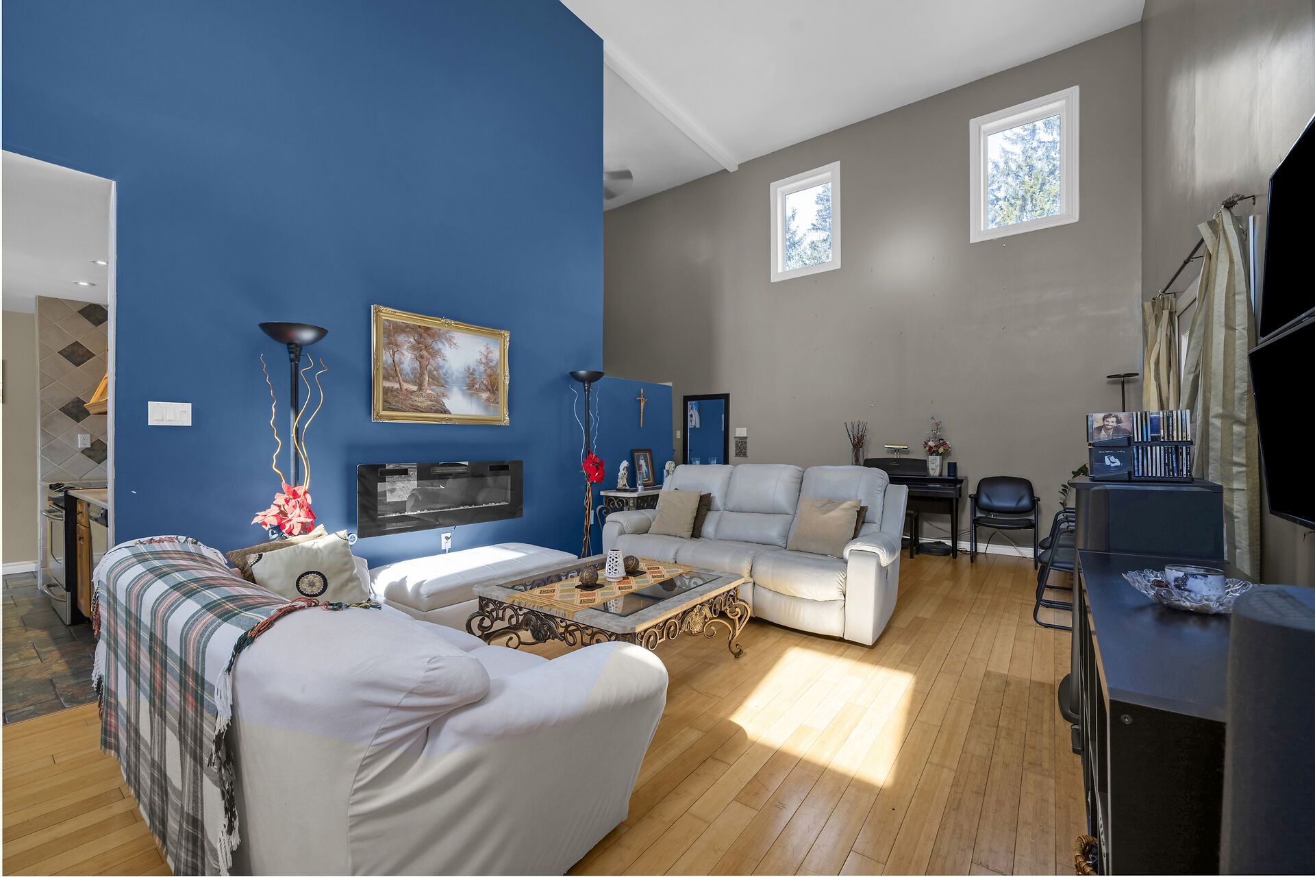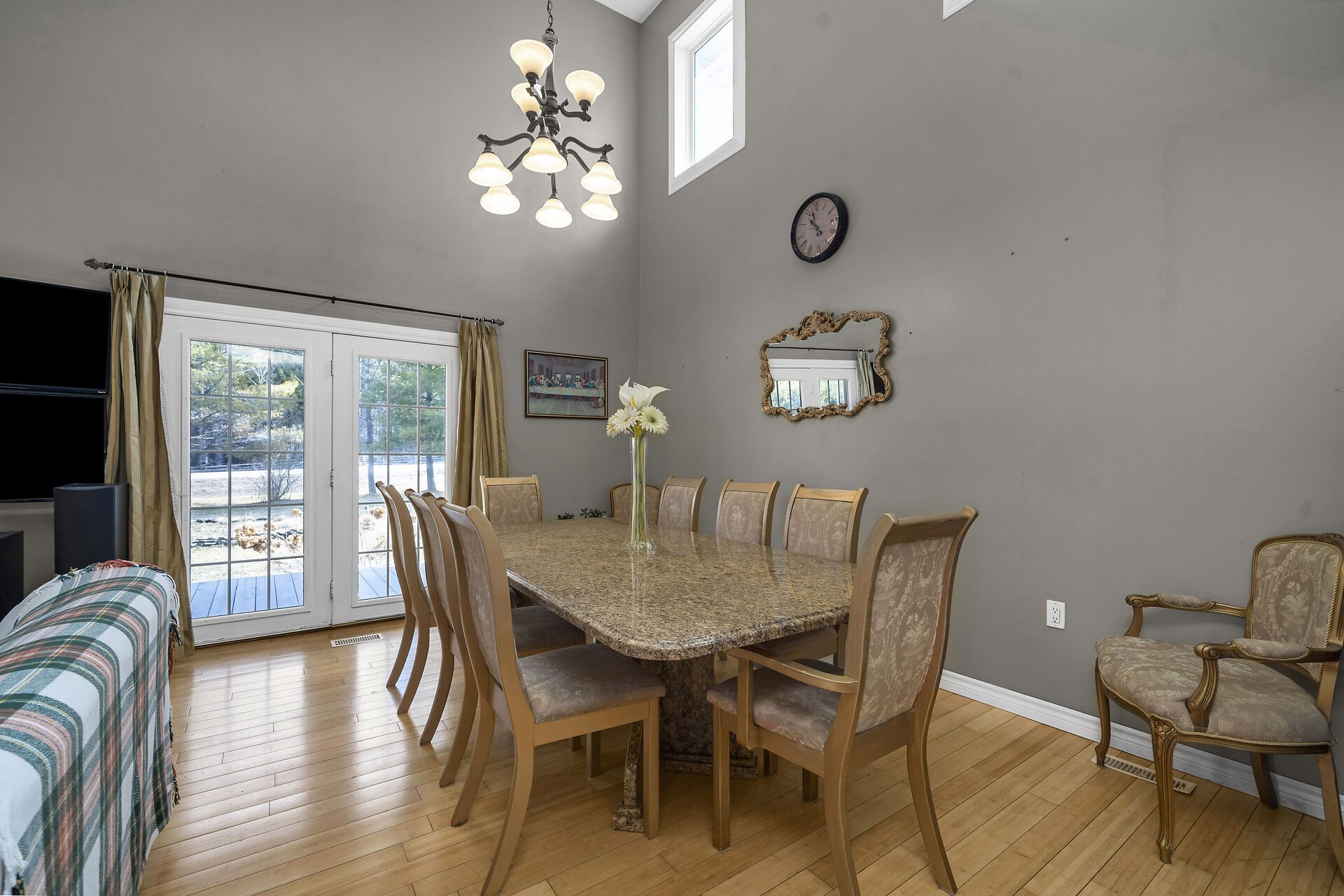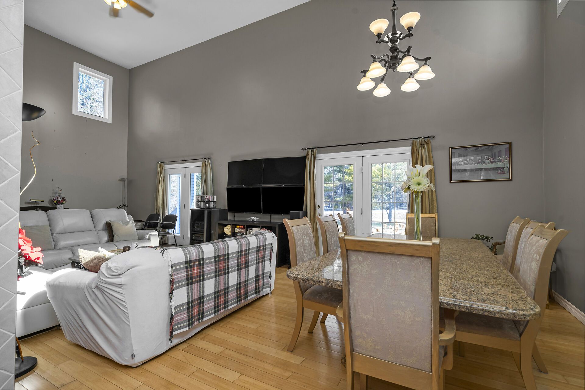 • Open living and dining area with high ceilings for a grand feel.