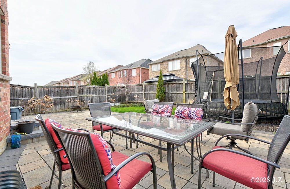 • Private landscaped yard featuring a stone patio, trampoline, and fire-pit.