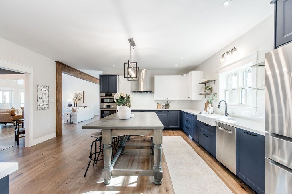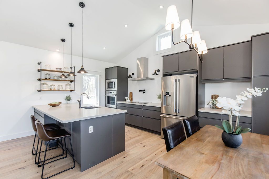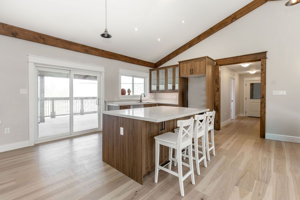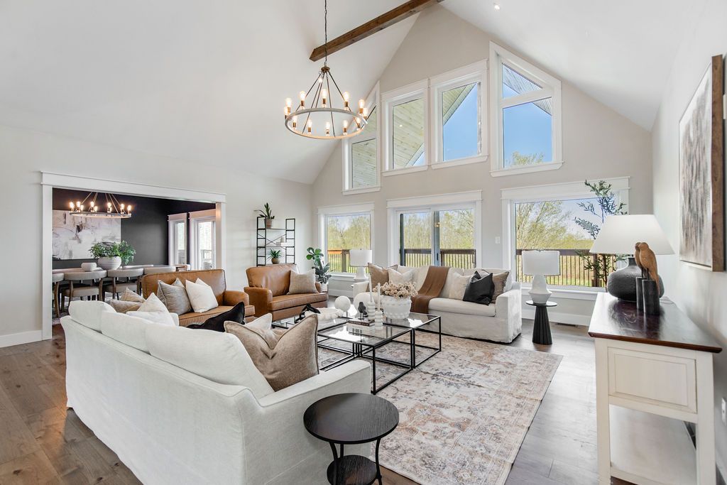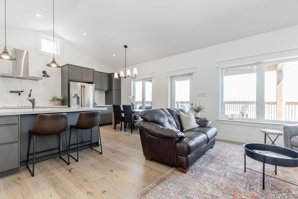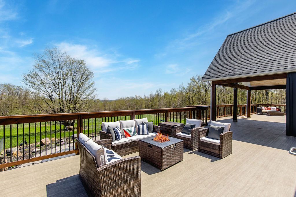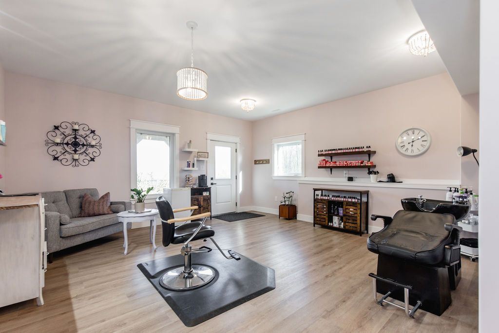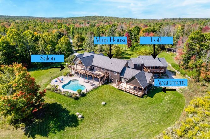 Family compound | built in 2022, this expansive 9,000 sqft estate on 100 acres is ideal for multi-generational living, family compound use, or rental income potential. The property includes a custom main residence, a legal ranch-style accessory apartment with private laundry & a self-contained loft suite above a heated 4-car garage, offering exceptional flexibility. A grand foyer flows into a stunning living room featuring floor-to-ceiling windows & expansive panoramic views of the acreage. The main home features 3+2 bedrooms, 3 full & 2 half bathrooms, 9' ceilings & engineered hardwood throughout the main level. The great room showcases 19' vaulted ceilings with walk-out access to a covered deck overlooking the pool. The chef's kitchen & formal dining area are designed for entertaining, complete with quartz countertops, oversized custom island, double farmhouse sink, and premium stainless steel appliances. The primary suite is a private retreat with deck access, dual walk-in closets & a spa-inspired 5-piece ensuite featuring a soaker tub, walk-in shower, dual quartz vanity & private water closet. The walk-out lower level includes a large recreation room, two additional bedrooms & a dedicated salon with powder room, ideal for a home business, studio, or professional workspace, finished with durable vinyl plank flooring. The legal accessory apartment offers vaulted ceilings, an open-concept layout, quartz kitchen counters, private covered deck & in-suite laundry - perfect for extended family or income-generating rental use. The loft suite includes a bedroom, 4-piece bath, kitchenette & private deck for guests or independent living. The heated 4-car garage features 10' and 14' ceilings, ideal for car enthusiasts, storage, or workshop use. Outdoors, the 100-acre property supports hiking trails, hobby farming, recreational use, or a private nature retreat. Enjoy a resort-style outdoor setting with a heated 20' x 40' saltwater pool, multiple decks & expansive green space.