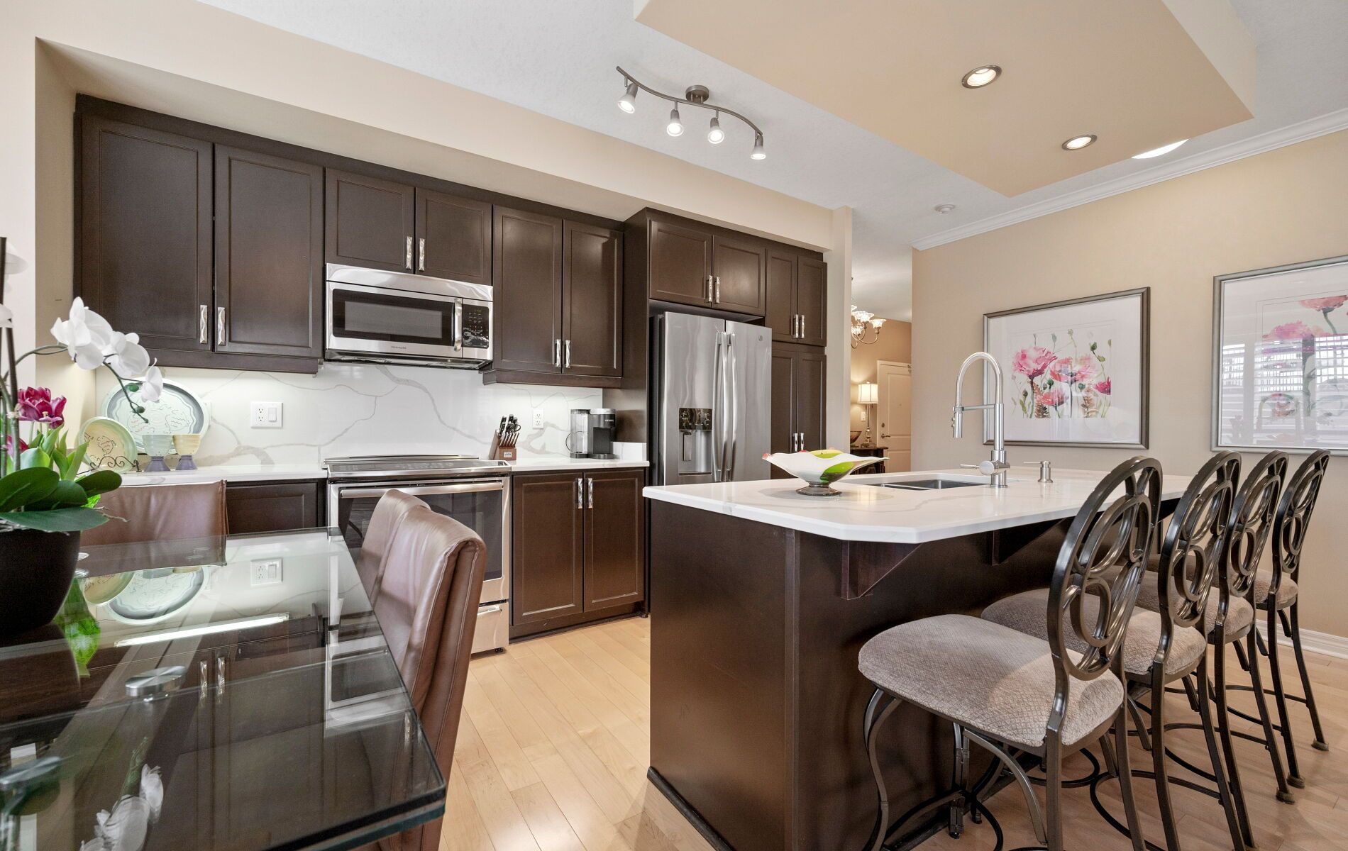 • Modern kitchen with upgraded quartz countertops and breakfast bar.