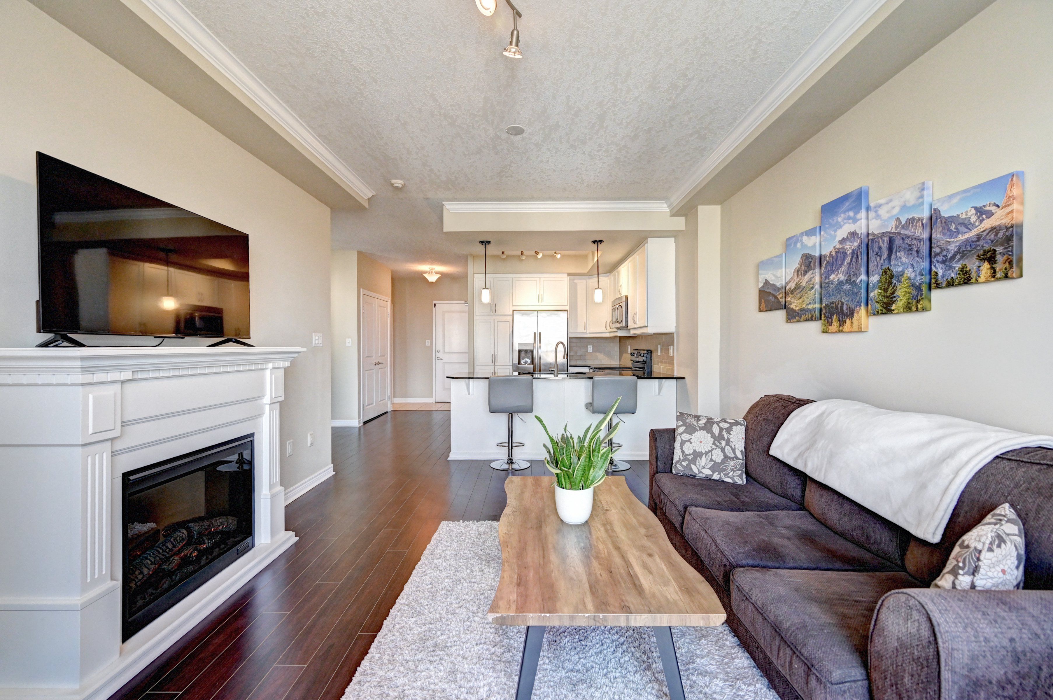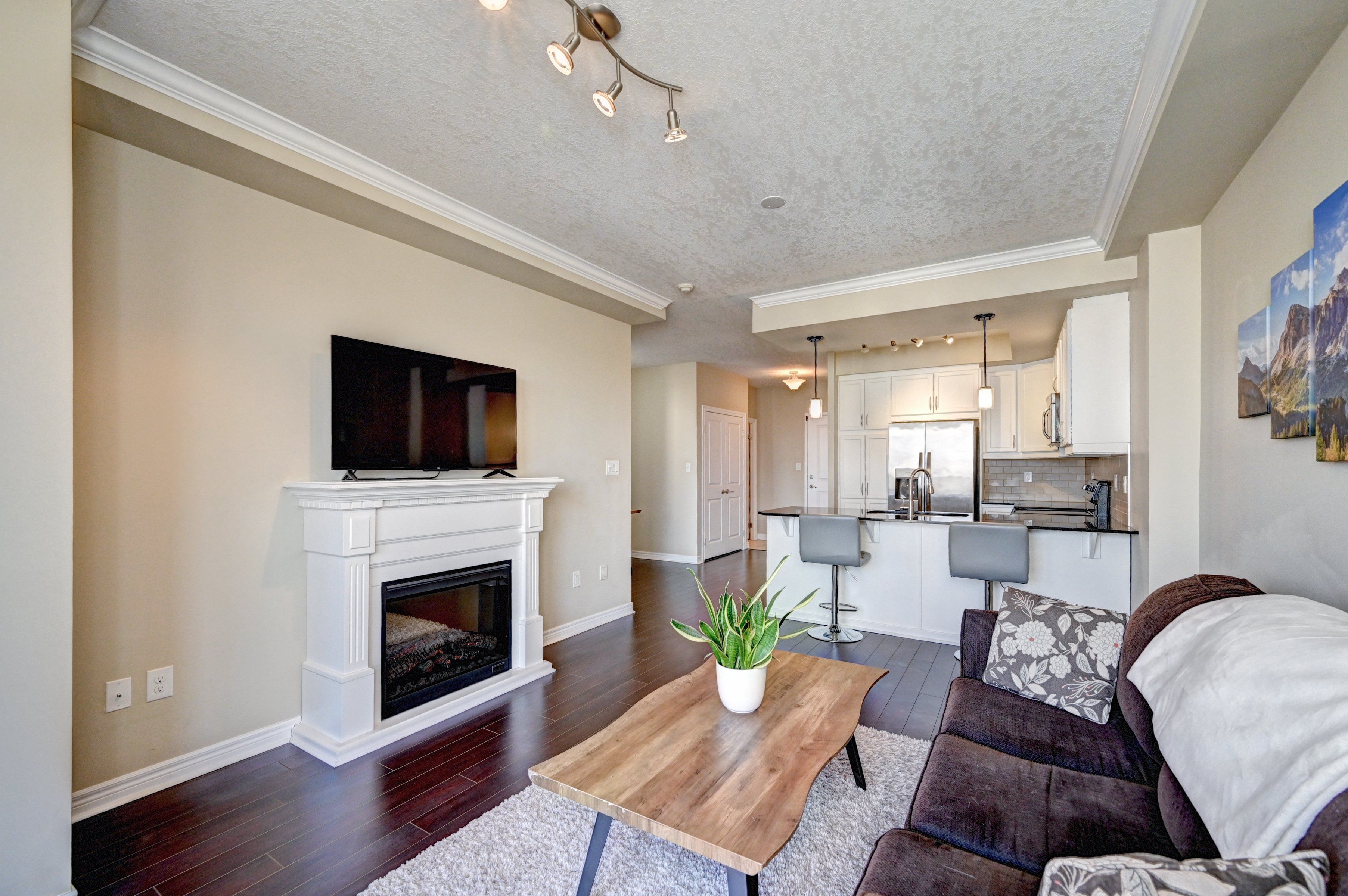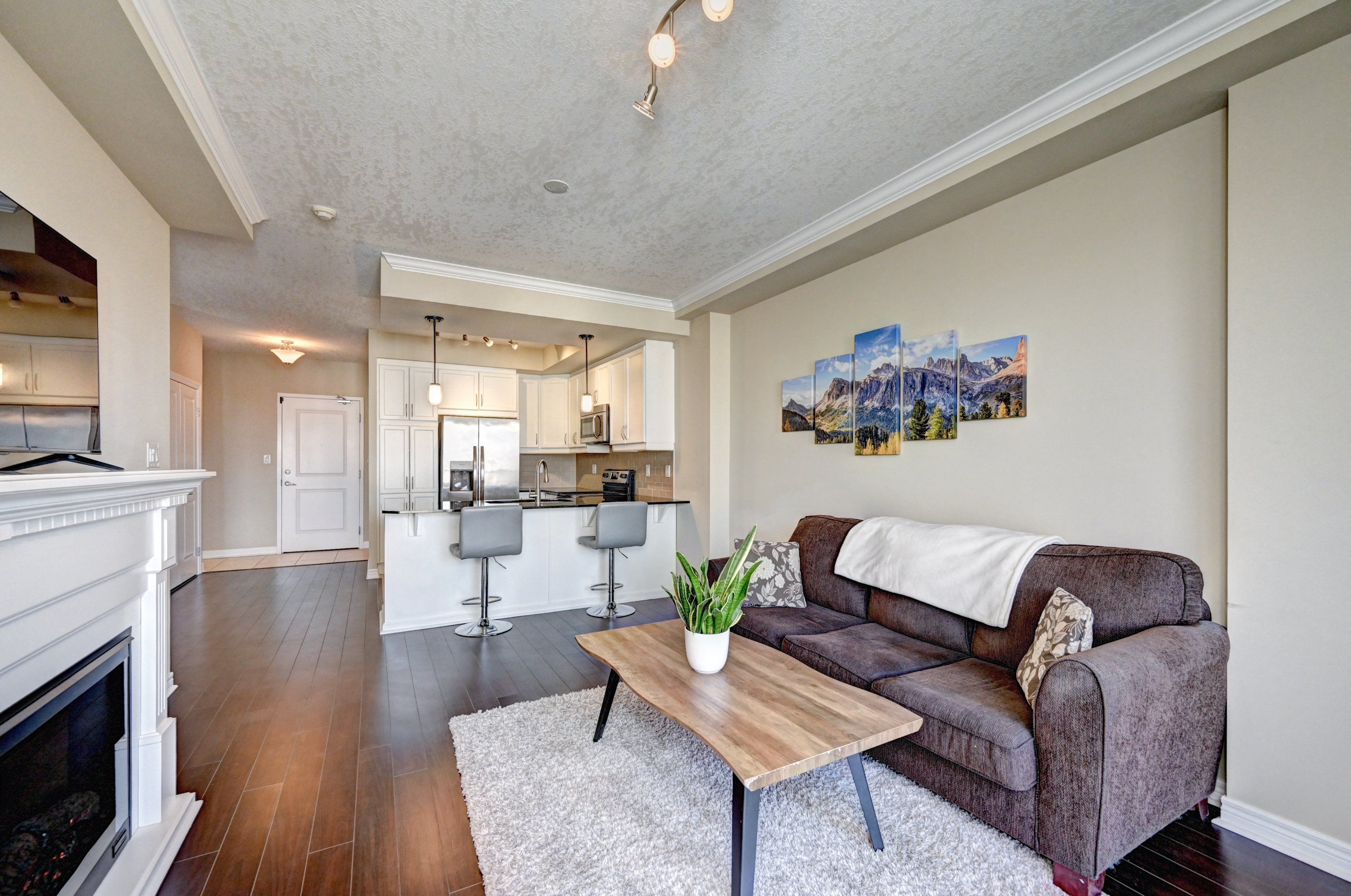 • Open-concept design with 9-foot ceilings and an electric fireplace.