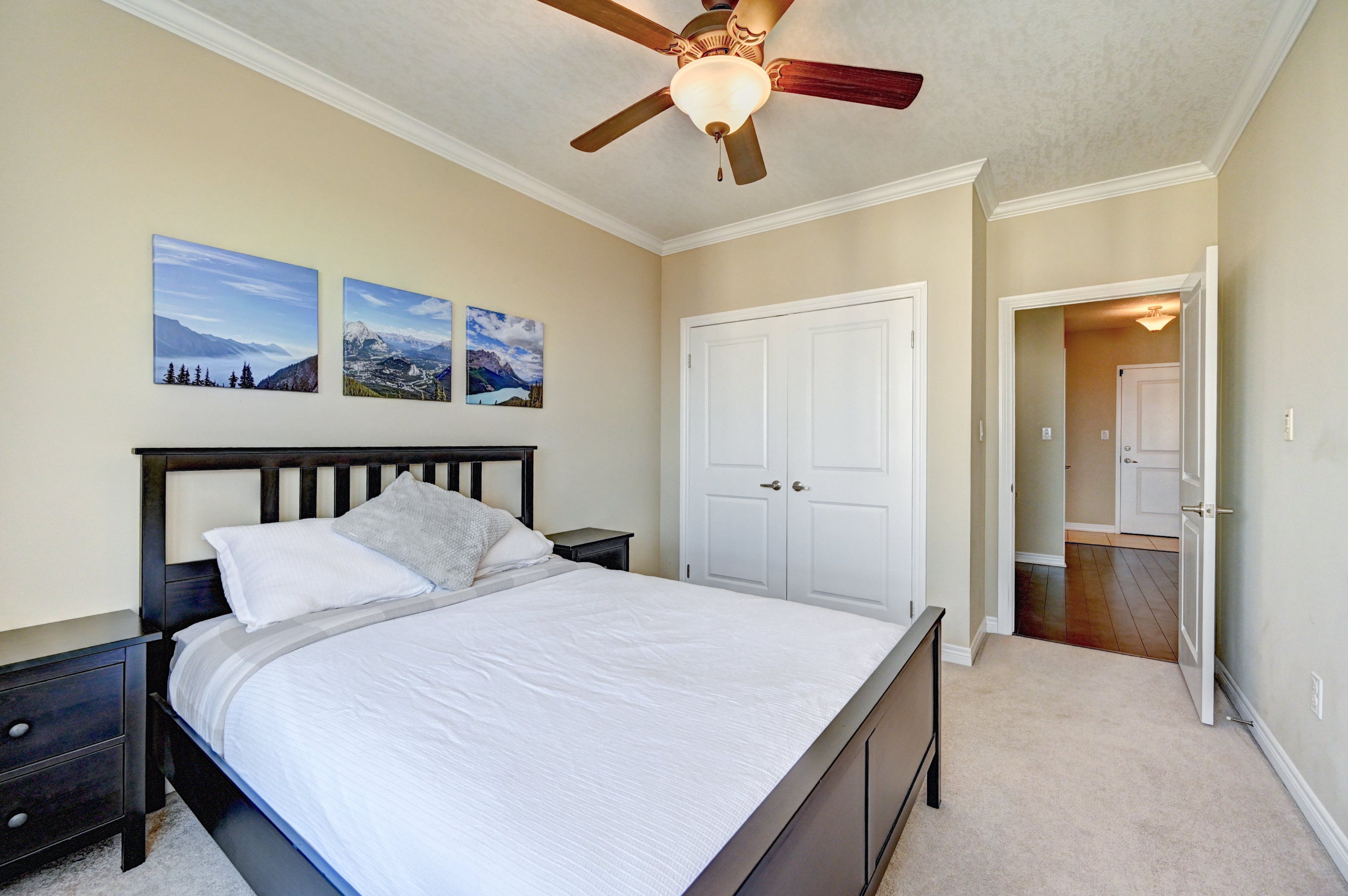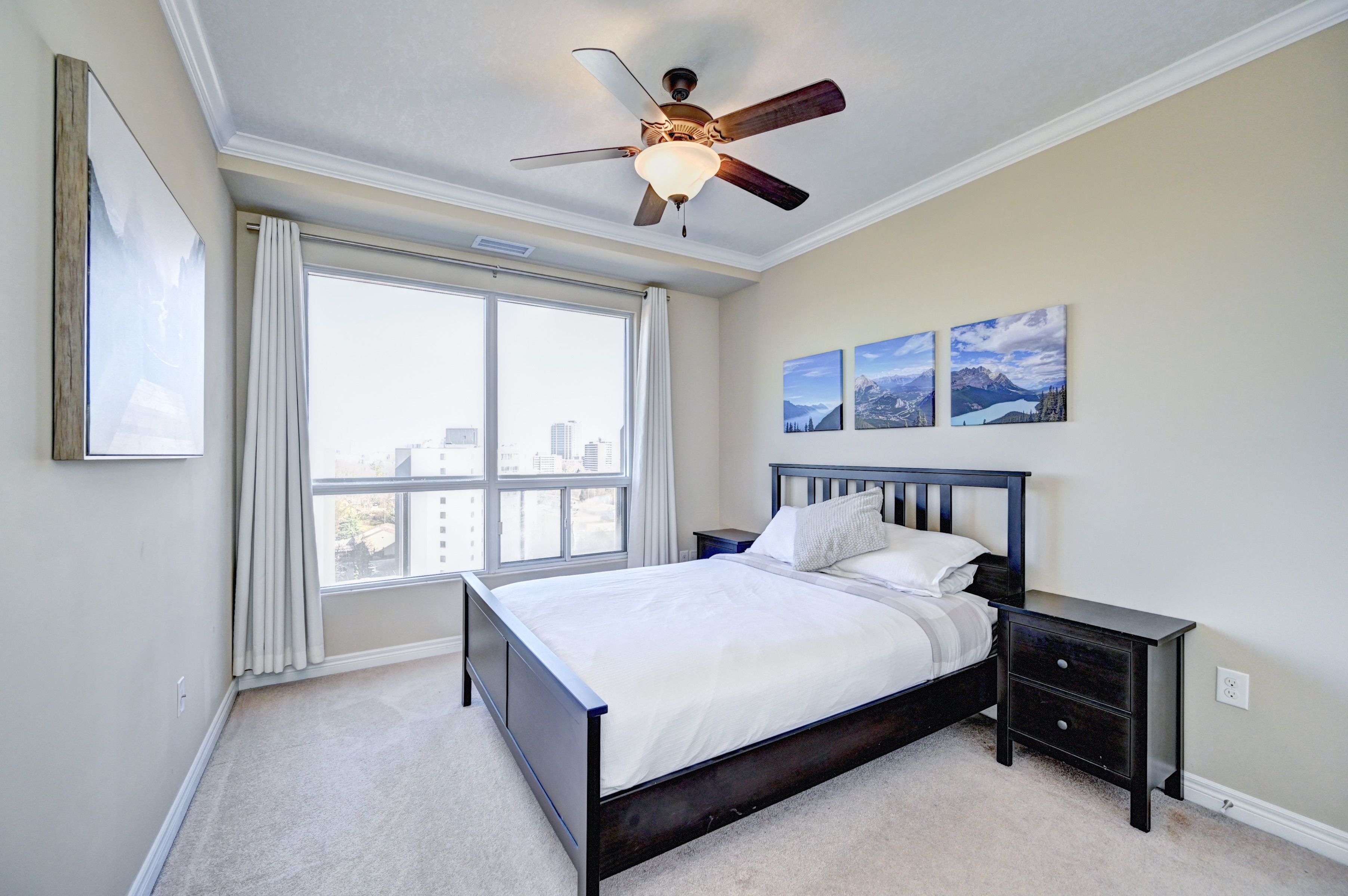 Discover modern, urban living in this stunning top-floor 1-bedroom + den condo, offering over 750 square feet of bright, open-concept living space. Featuring 9-foot ceilings, an electric fireplace, in-suite laundry, a walk-in shower, and high-end finishes throughout, this home blends comfort and style effortlessly. The updated kitchen boasts granite countertops, stainless steel appliances, ample counter space, and a breakfast bar-perfect for everyday living or entertaining. The oversized living area provides plenty of room to relax, while the versatile den is ideal for a work-from-home setup or additional dining space. Step outside onto your private double balcony with northwest exposure and enjoy panoramic sunset views. Perfect for morning coffee, evening wine, or hosting bbqs with friends and family. The building offers an array of amenities, including a billiards/games room, theatre room, party room, outdoor bbq patio, gym, library, guest suite, and ample visitor parking. Located in the heart of belmont village, you're just steps from restaurants, bars, boutique shops, and the iron horse trail. The unit owns one covered parking space, with a second space currently rented and potential to continue. The low condo fees include heat, water, and a/c. Don't miss your chance to experience this exceptional condo book your private showing today!
