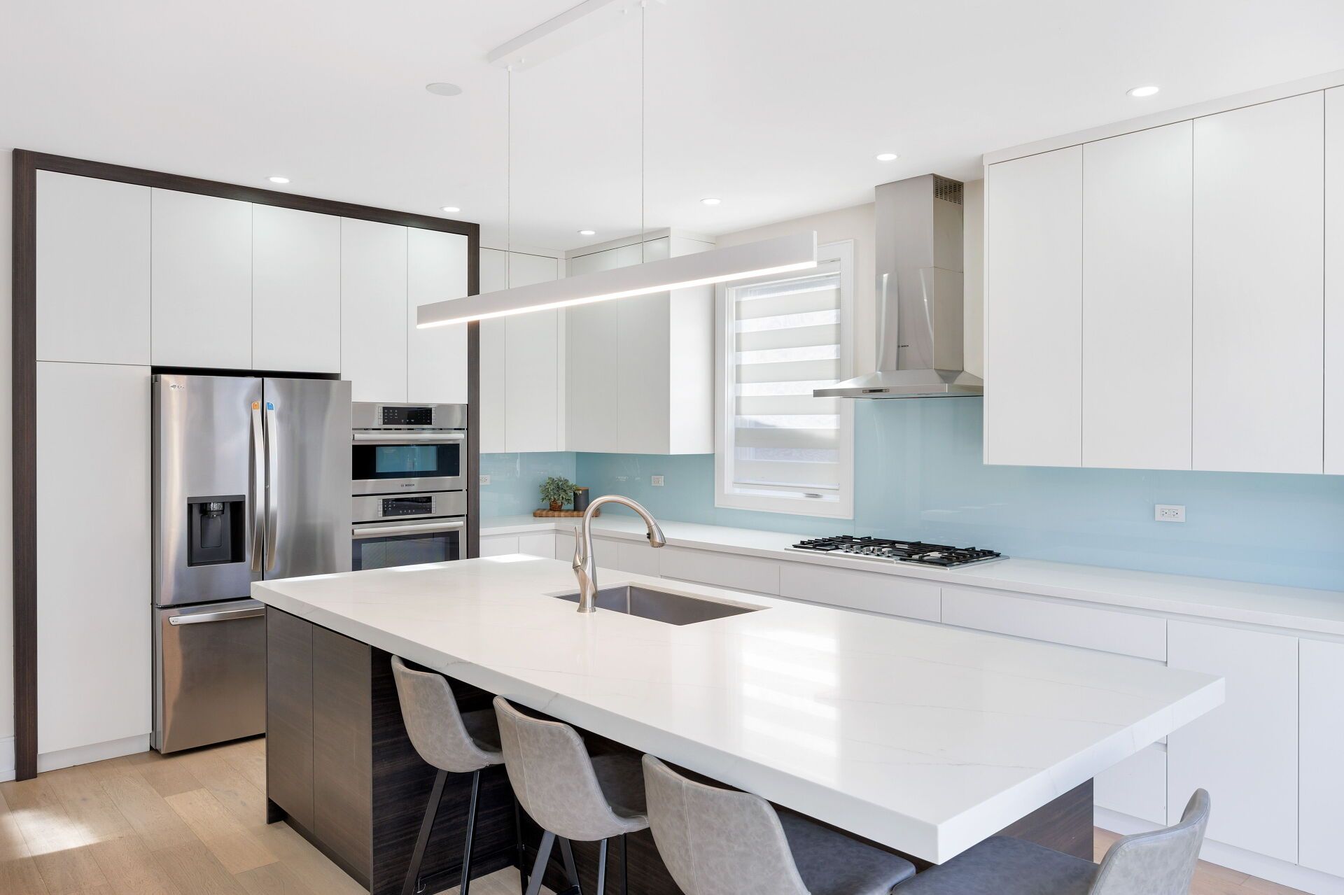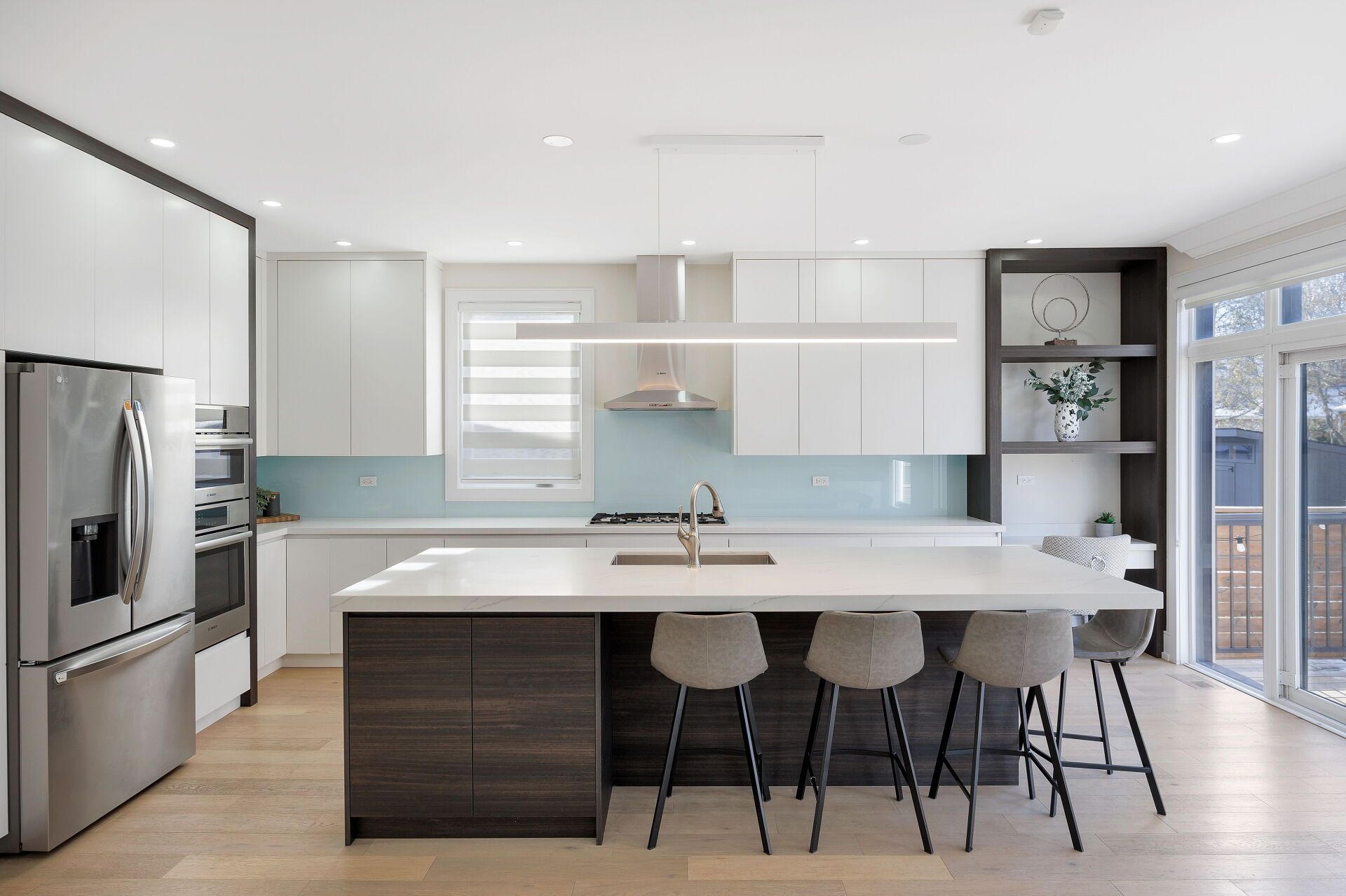 • Custom chef's kitchen featuring Bosch appliances and a spacious centre island.