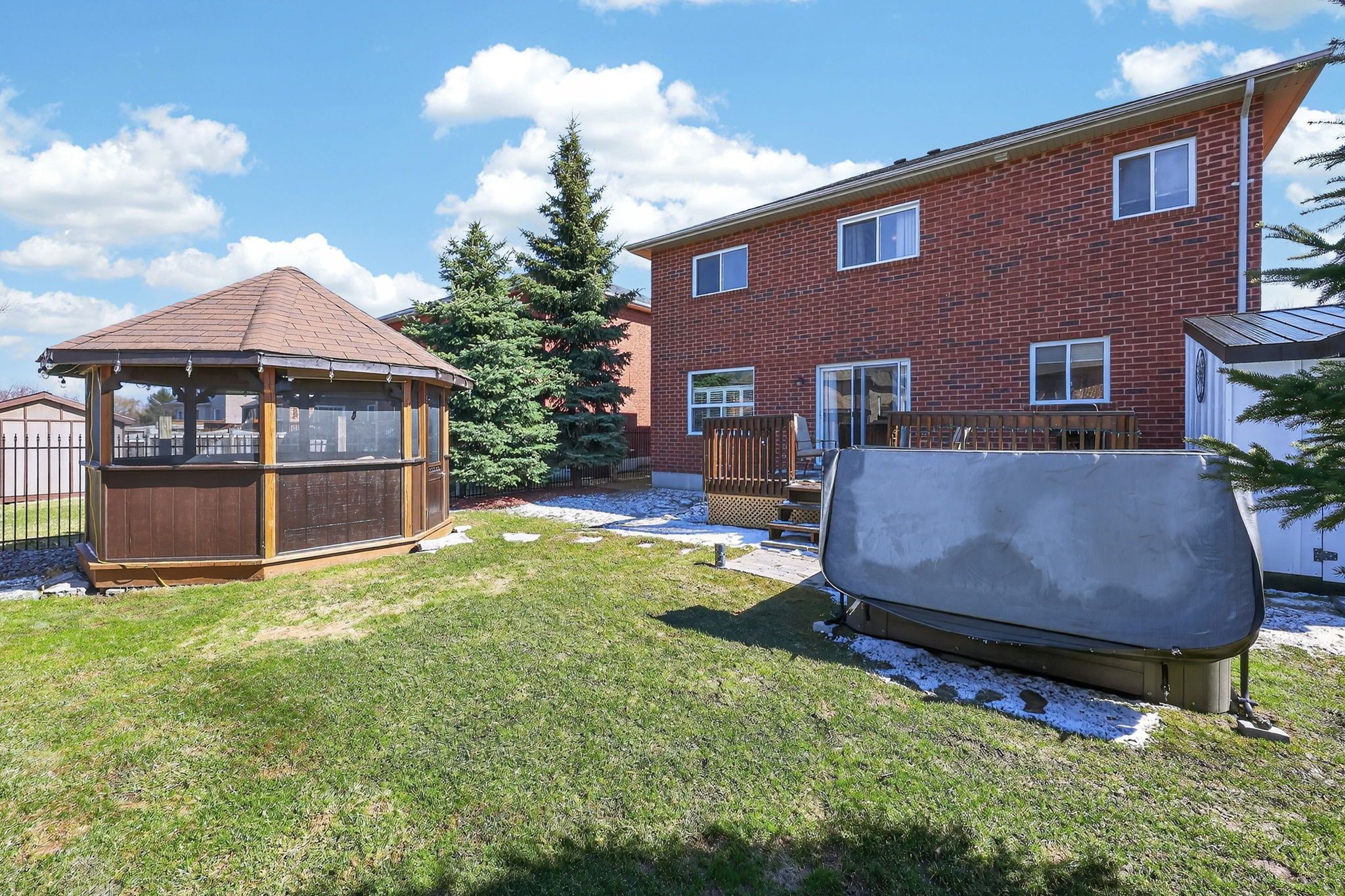 Welcome to 54 bambi crescent: a rare opportunity in a highly sought after neighbourhood. This well maintained home offers updated finishes and exceptional pride of ownership throughout. From the moment you arrive, the beautiful curb appeal and new driveway make a strong first impression. Step into a backyard oasis unlike any other, featuring an upgraded fenced yard, new shed, custom screened in gazebo, a luxury hot tub just 3 years old, gas bbq hookup, and a spacious 12 x 16 composite deck, perfect for relaxing or entertaining. The fully finished basement adds even more living space, complete with plenty of storage, a gas fireplace, and a bathroom with a shower, sink, and counter with cupboard space . Ideally located just steps to bayview park and scenic walking trails, and only a short drive to all major amenities. Great schools are also close by, making this an excellent choice for families.