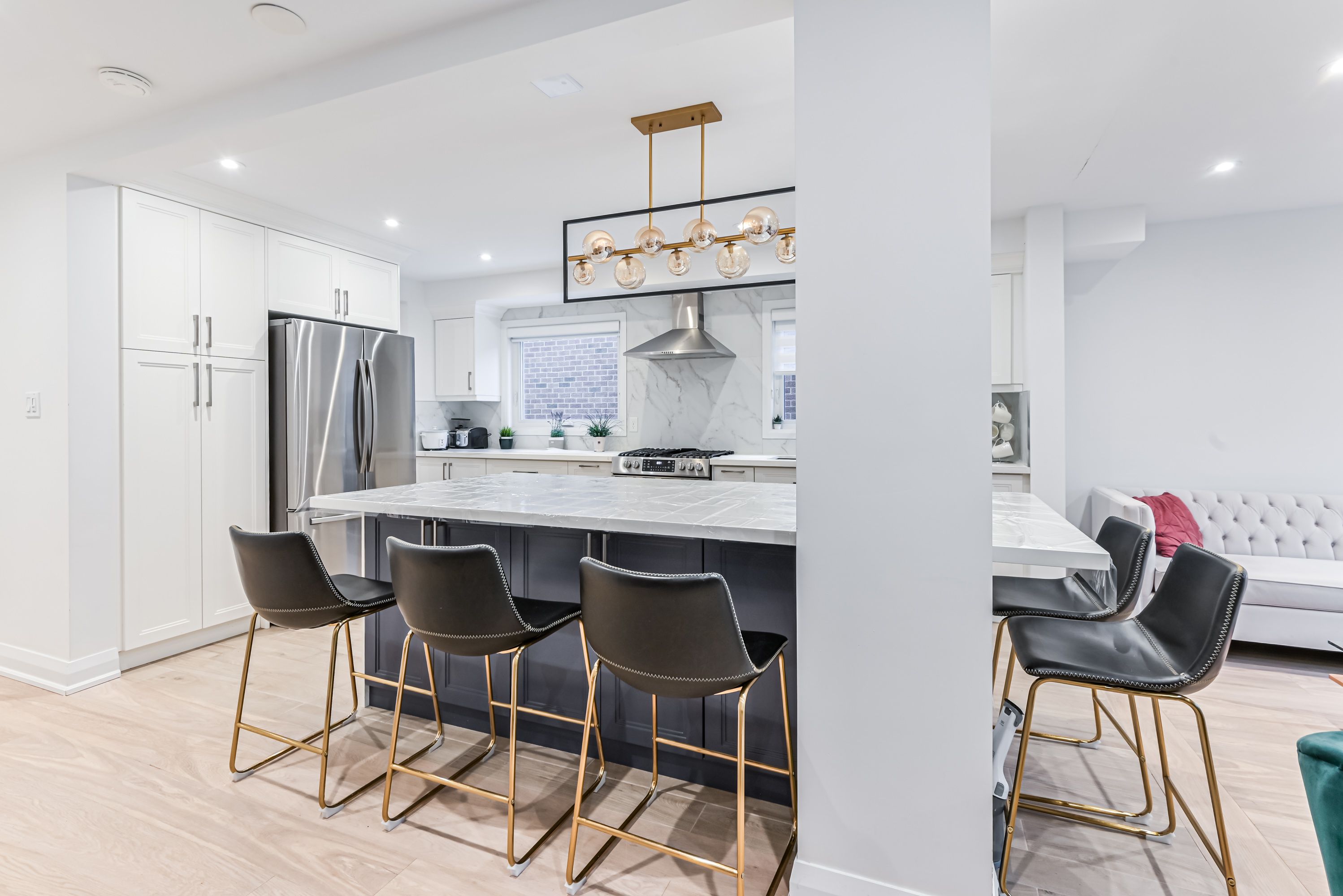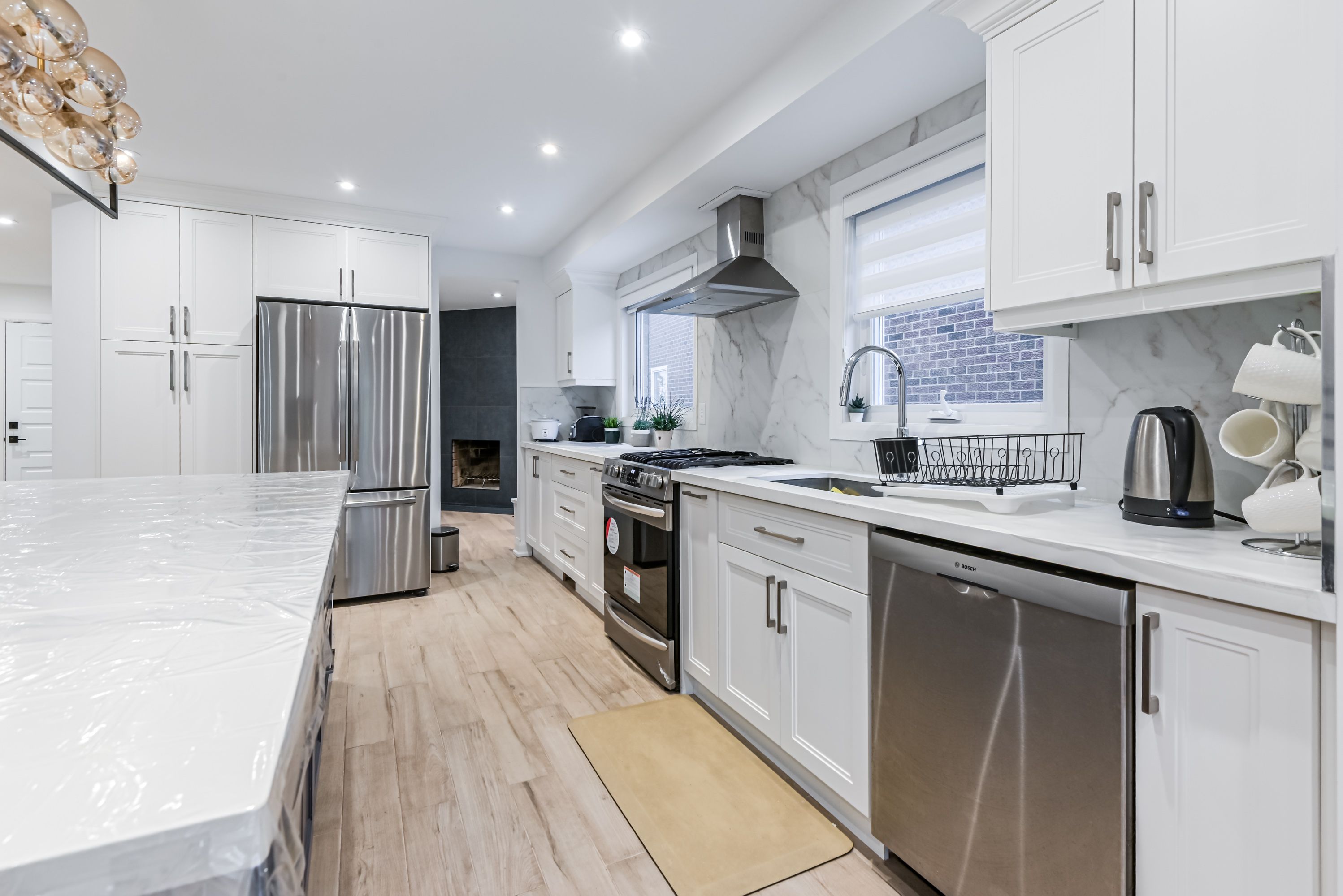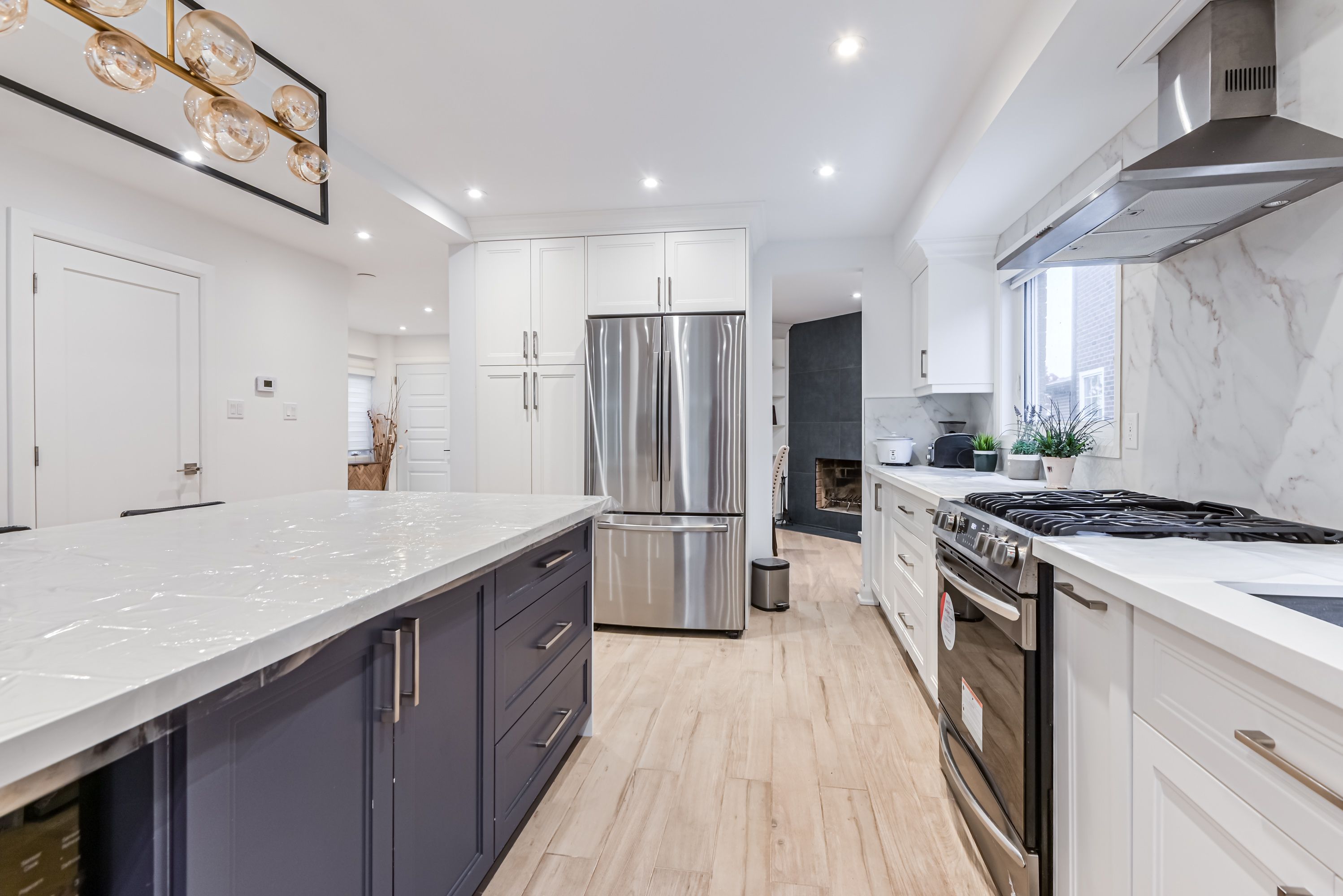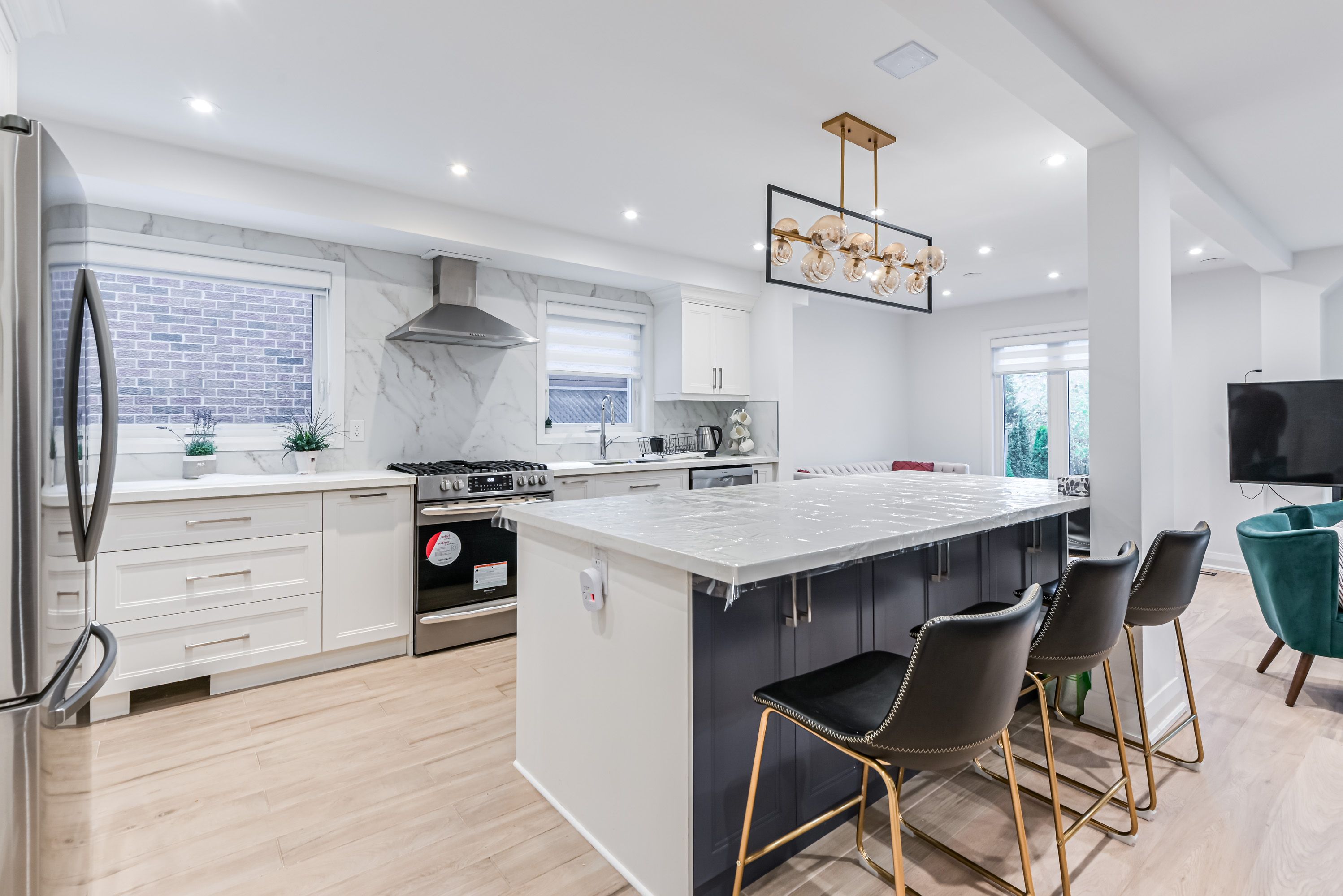 • Open concept kitchen featuring new stainless appliances and a massive island.