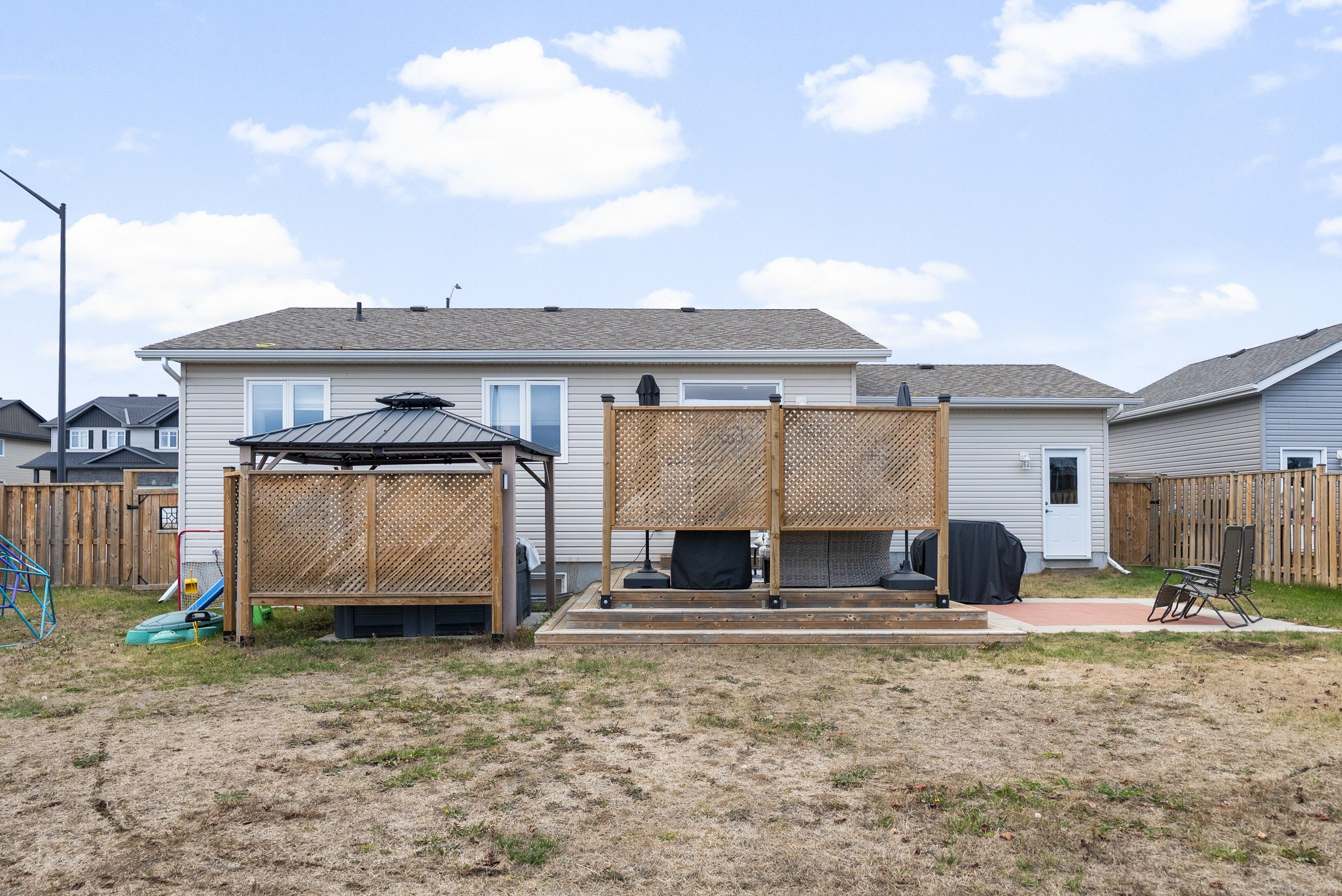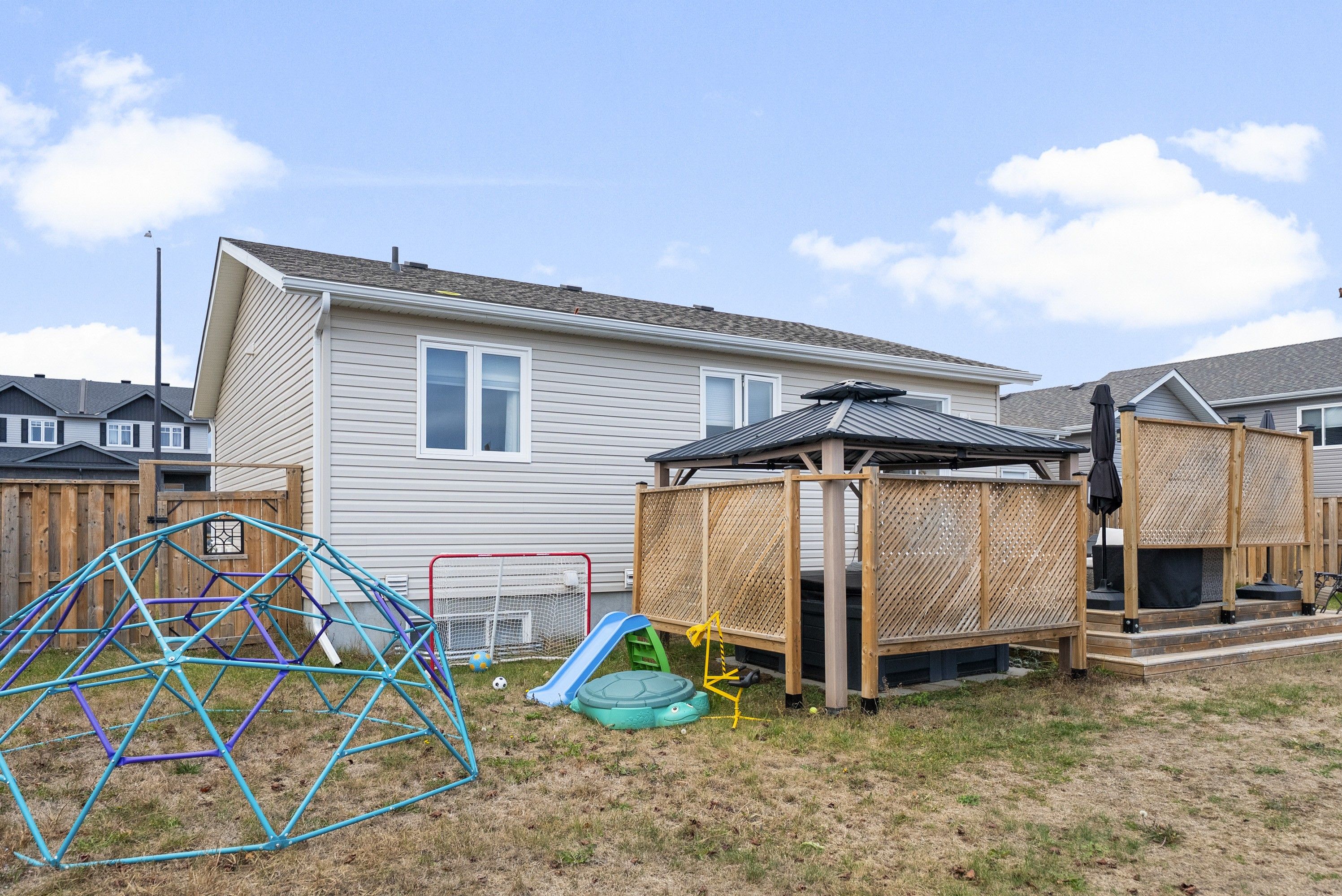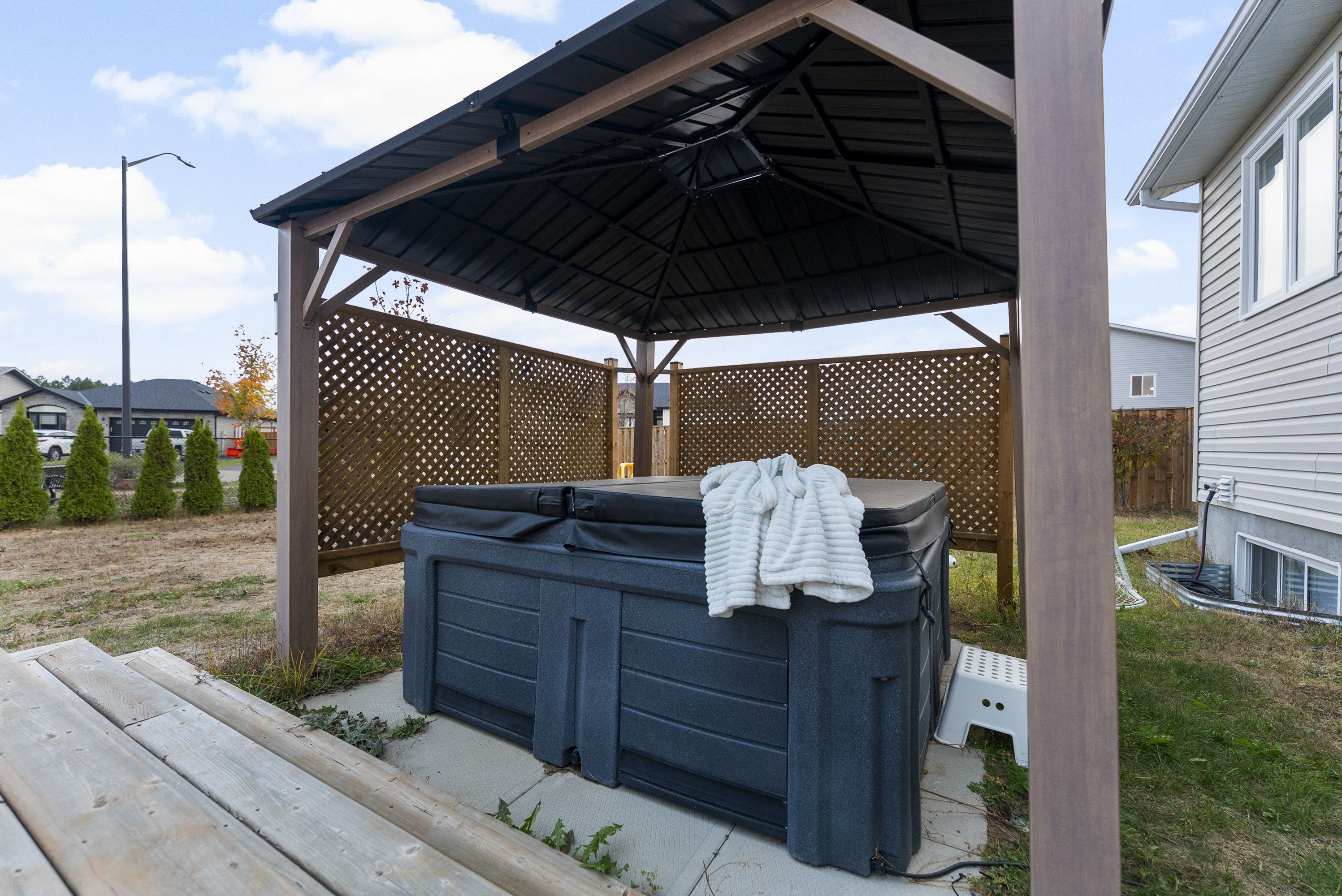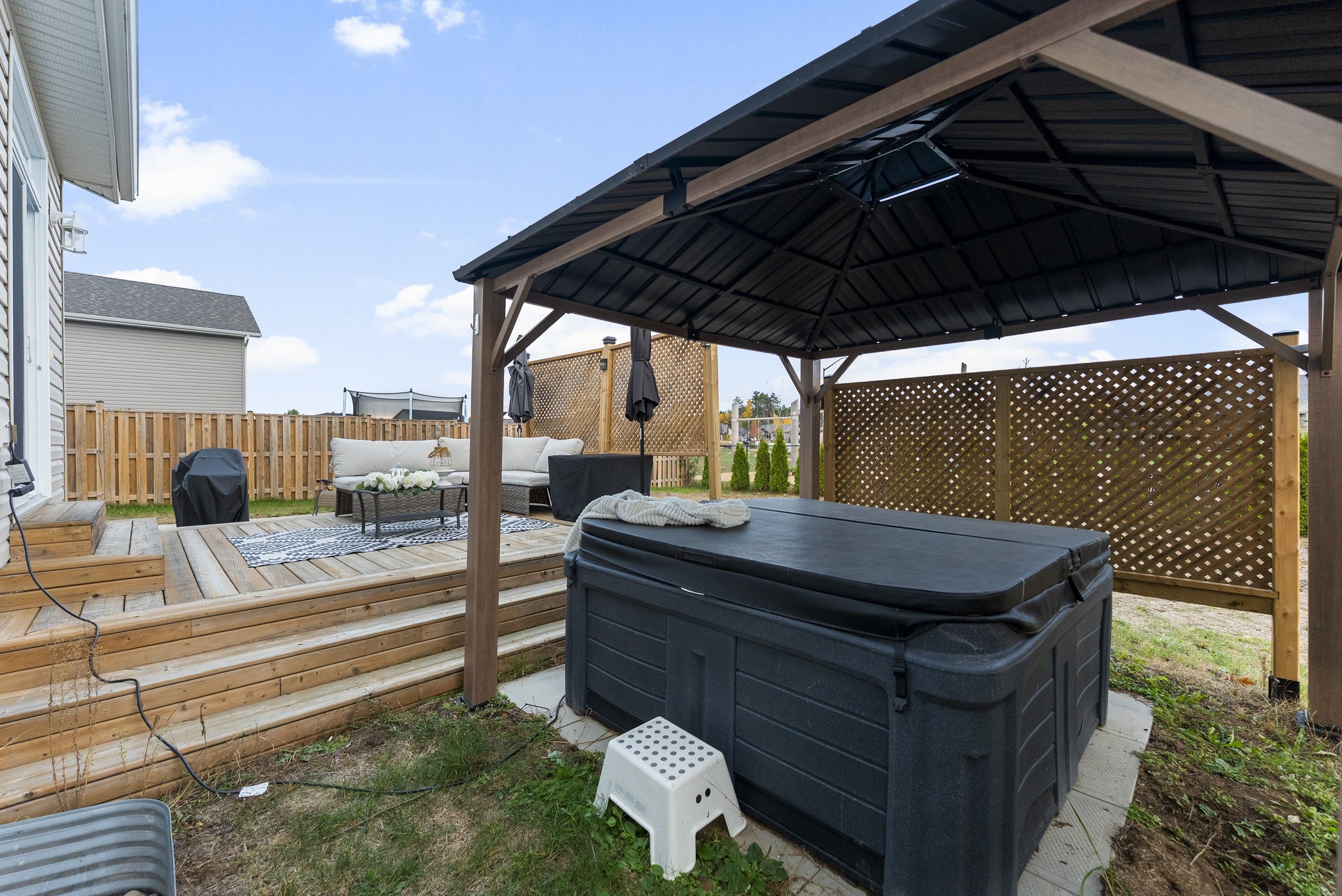 • Private fenced backyard with hot tub and gazebo for relaxation.