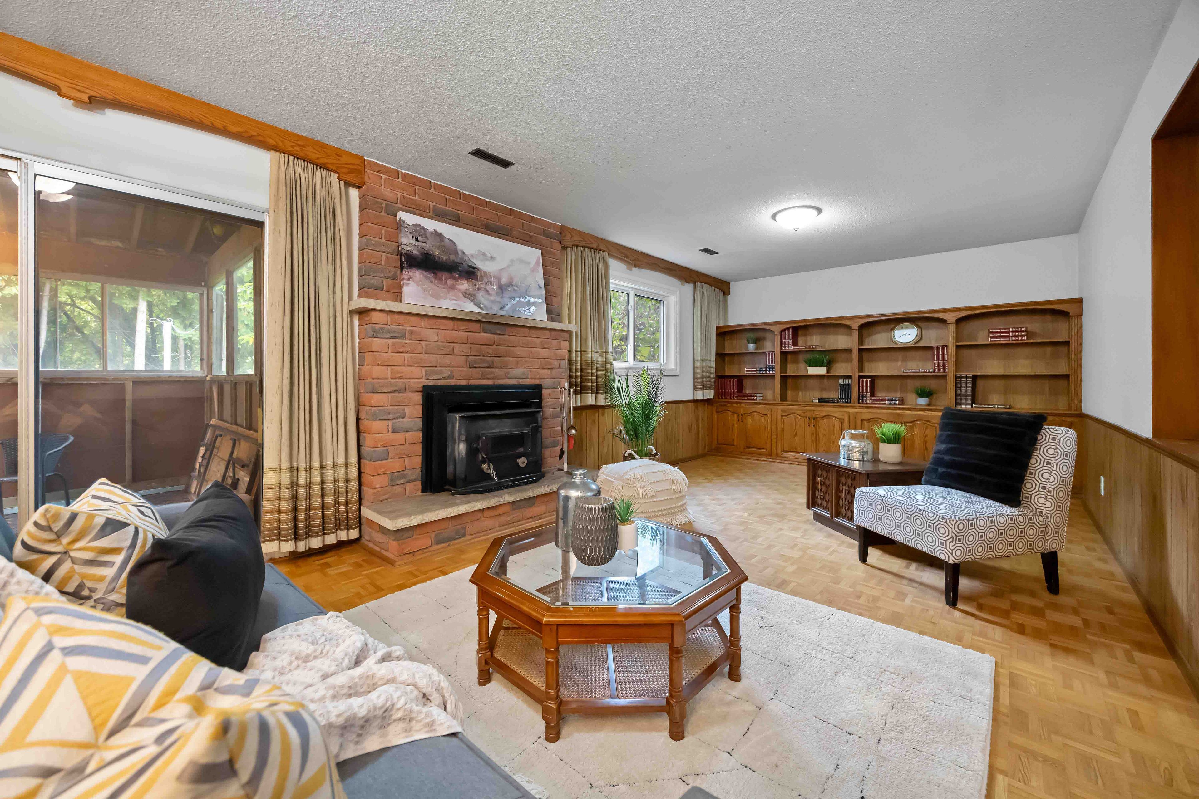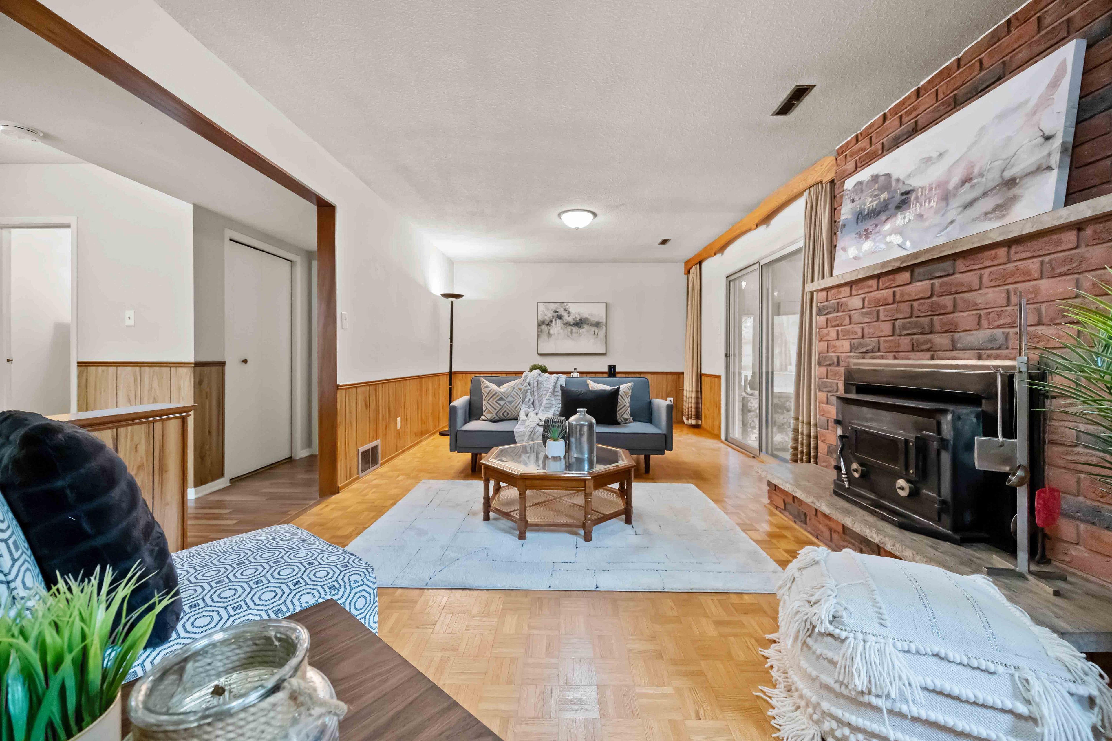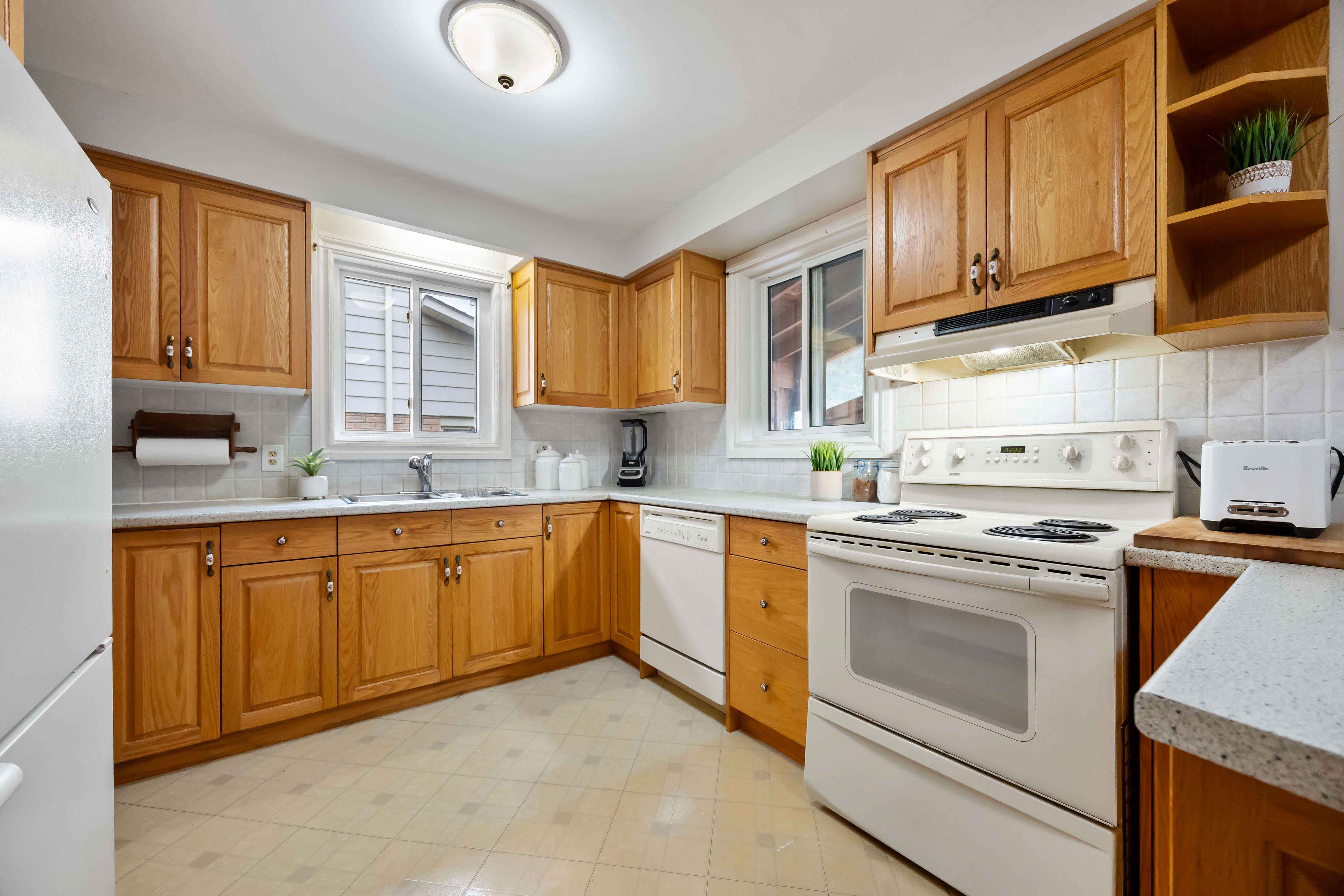 Nestled on a tranquil wooded ravine setting, this original-owner, all-brick home offers timeless appeal, quality craftsmanship, and an ideal layout for family living. The inviting main level features a bright front entry leading to elegant formal living and dining rooms with new laminate flooring and a large picture window showcasing the front gardens. The spacious eat-in kitchen includes a ceramic backsplash, pantry, and excellent cupboard and counter space-perfect for family meals and entertaining. Upstairs, discover three generous bedrooms, including a lovely primary retreat with a walk-in closet, updated 3-piece ensuite, and serene backyard views. The lower level offers a cozy family room with a built-in bookcase, wood-burning fireplace, and sliding glass walkout to a sunroom overlooking the private backyard. Enjoy easy access to the interlocking patio, mature gardens, and handy garden shed. The finished basement expands your living space with a large recreation room featuring a dry bar, a cold cellar, a utility/workshop area, and plenty of storage. A convenient laundry room with a separate side entrance completes this versatile home. Situated in a mature, family-friendly neighbourhood-just steps to parks, schools, transit, and all major amenities-this warm and welcoming property offers comfort, space, and nature right at your doorstep. Don't miss your chance to call 54 chester crescent home - where pride of ownership shines throughout!