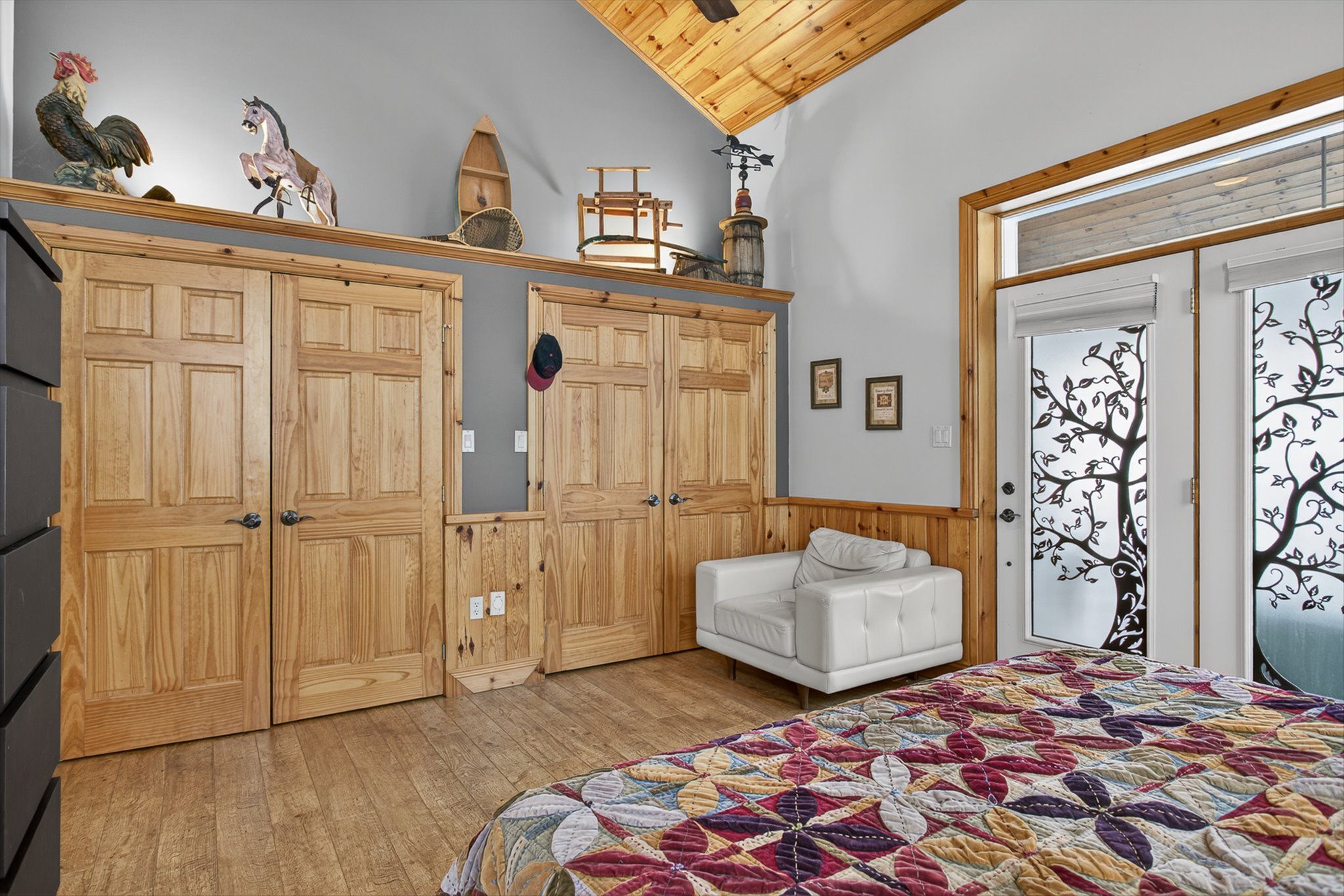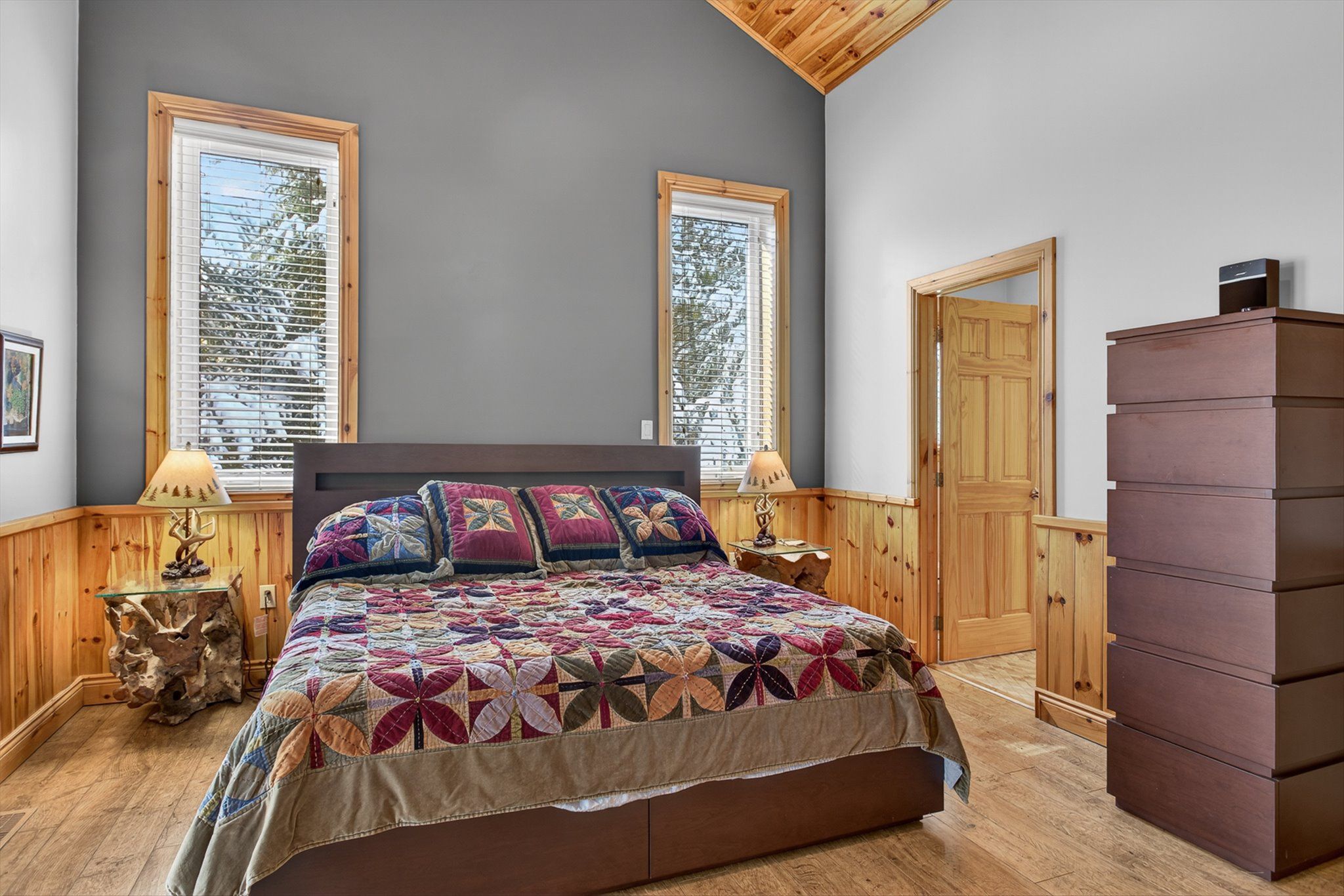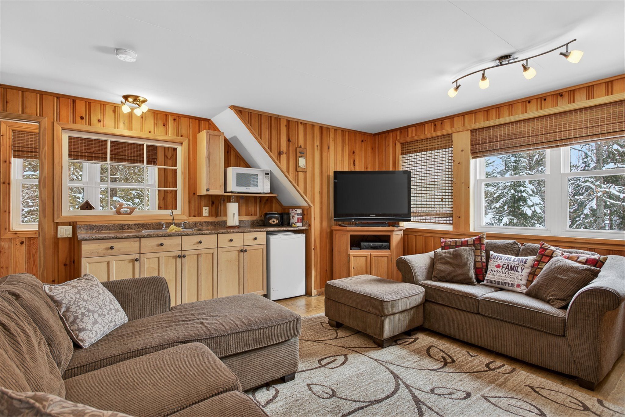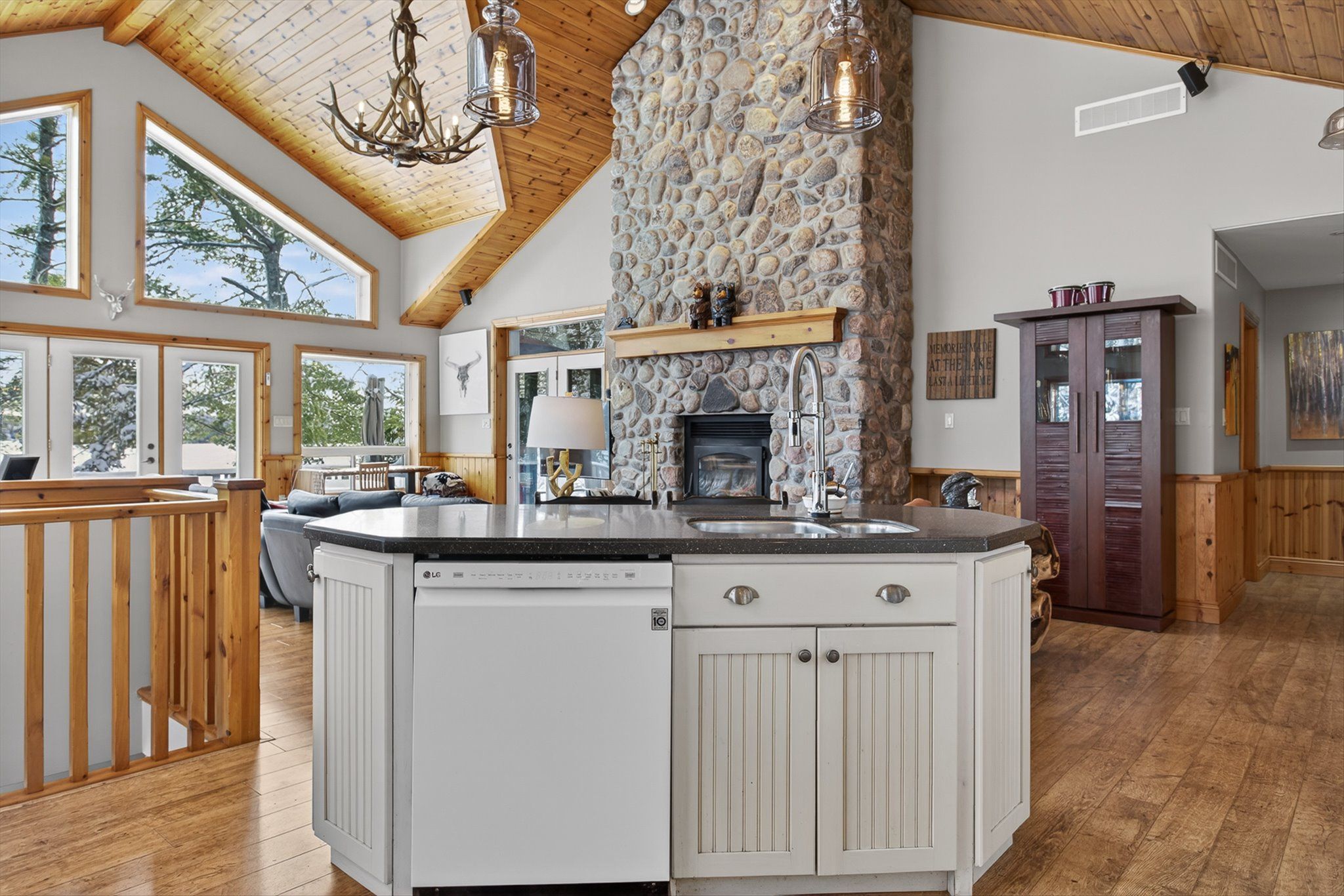 • Open-concept kitchen with cathedral ceilings and natural stone fireplace.