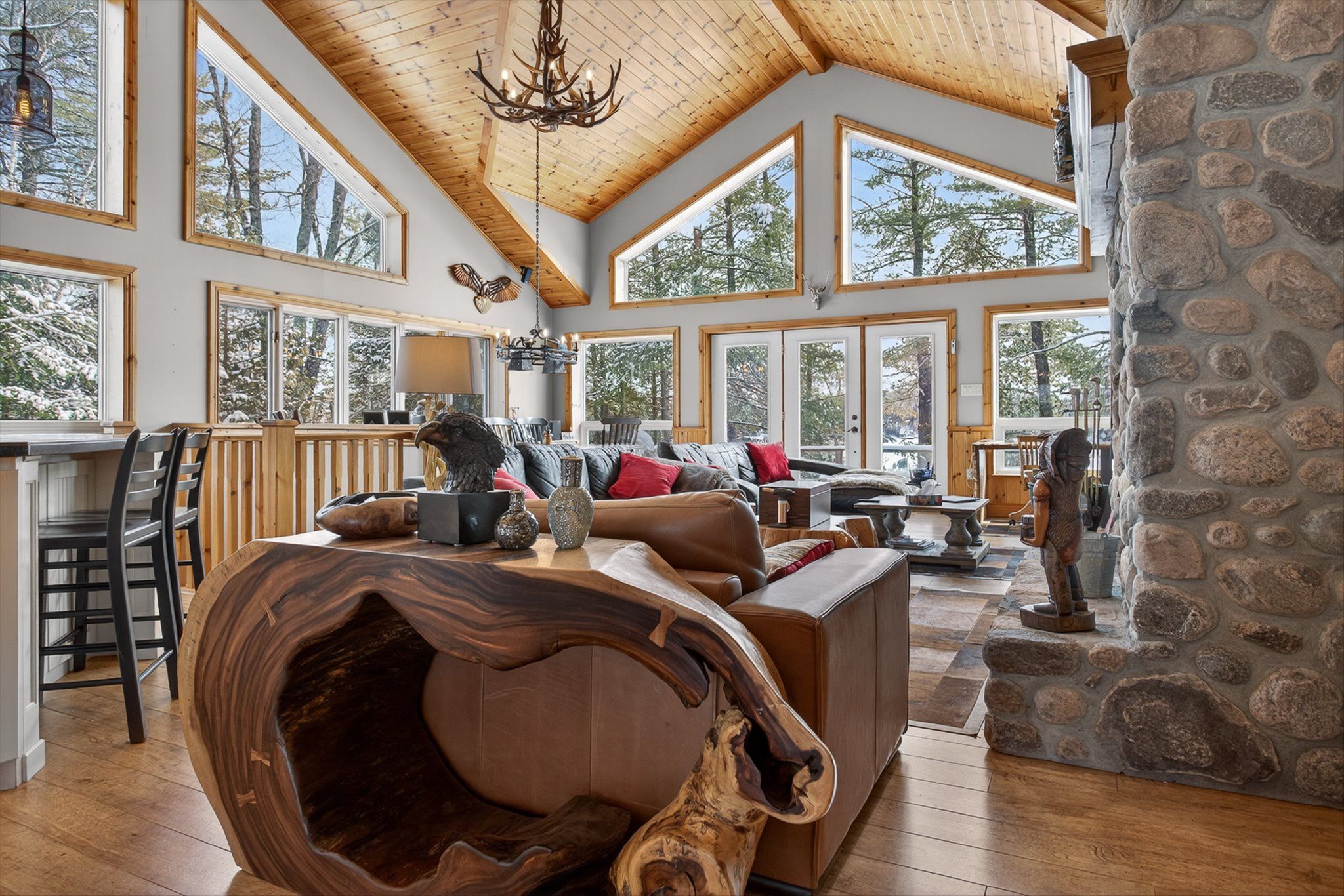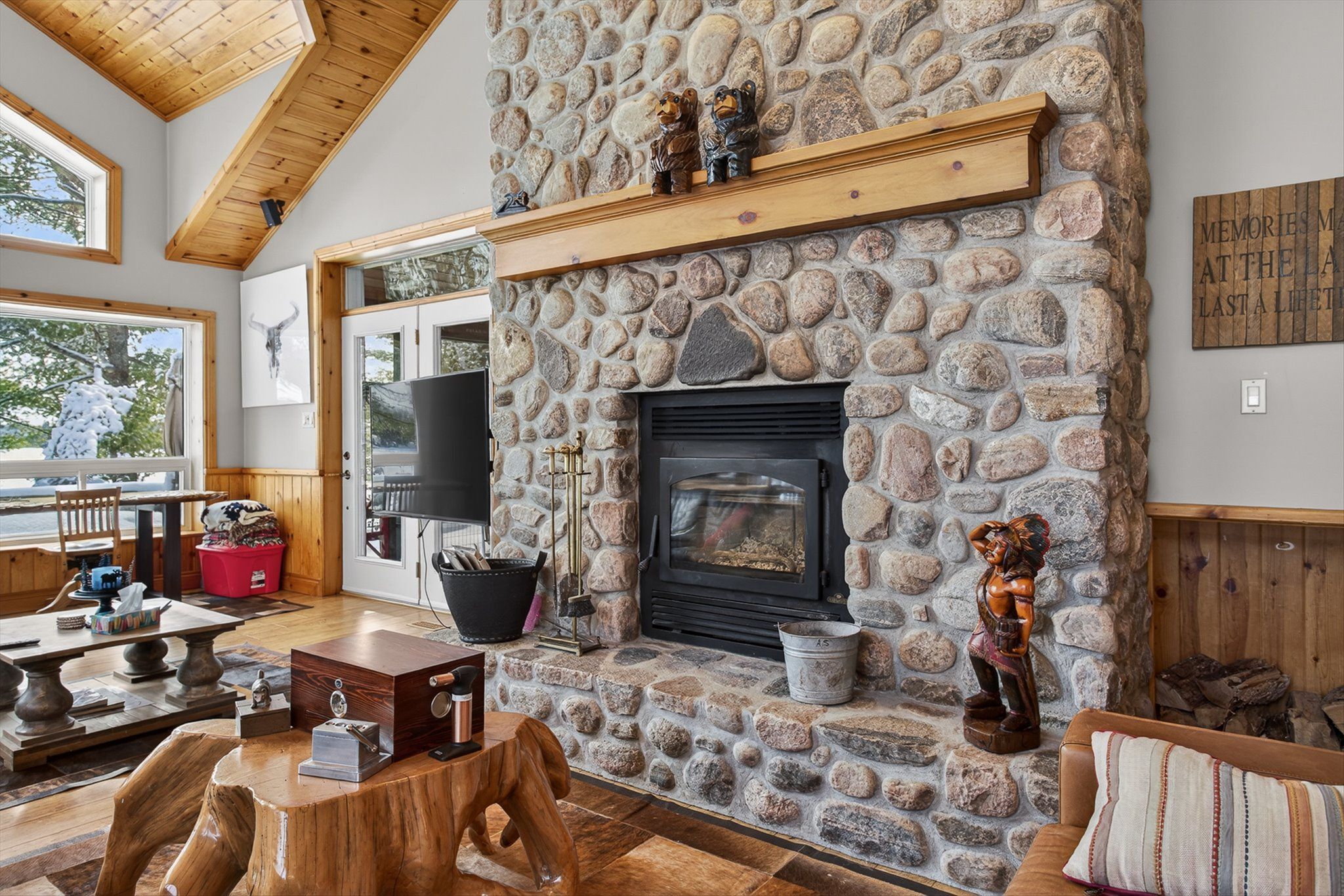 • Spacious living area with 16ft cathedral ceilings and a natural stone fireplace.