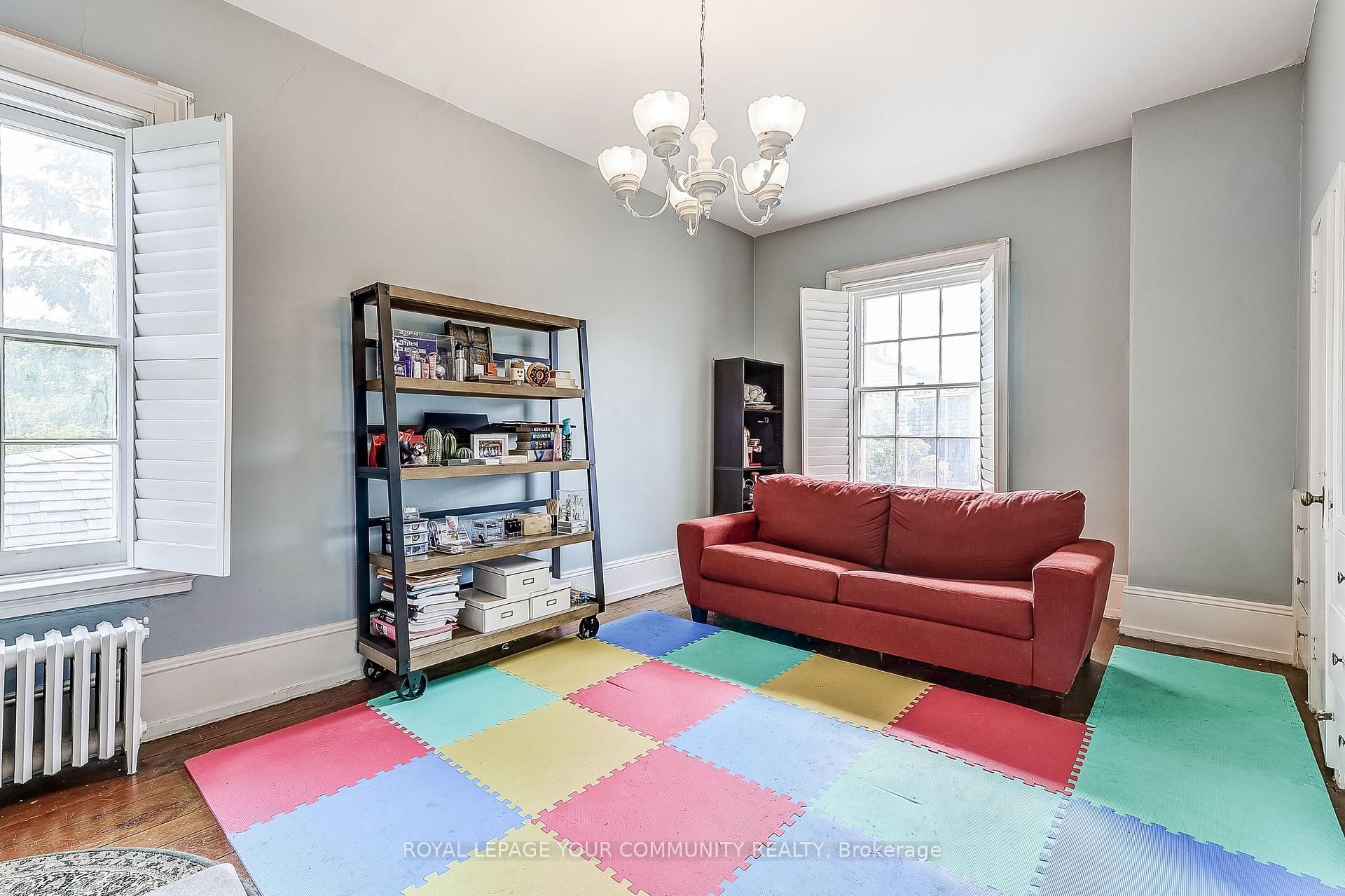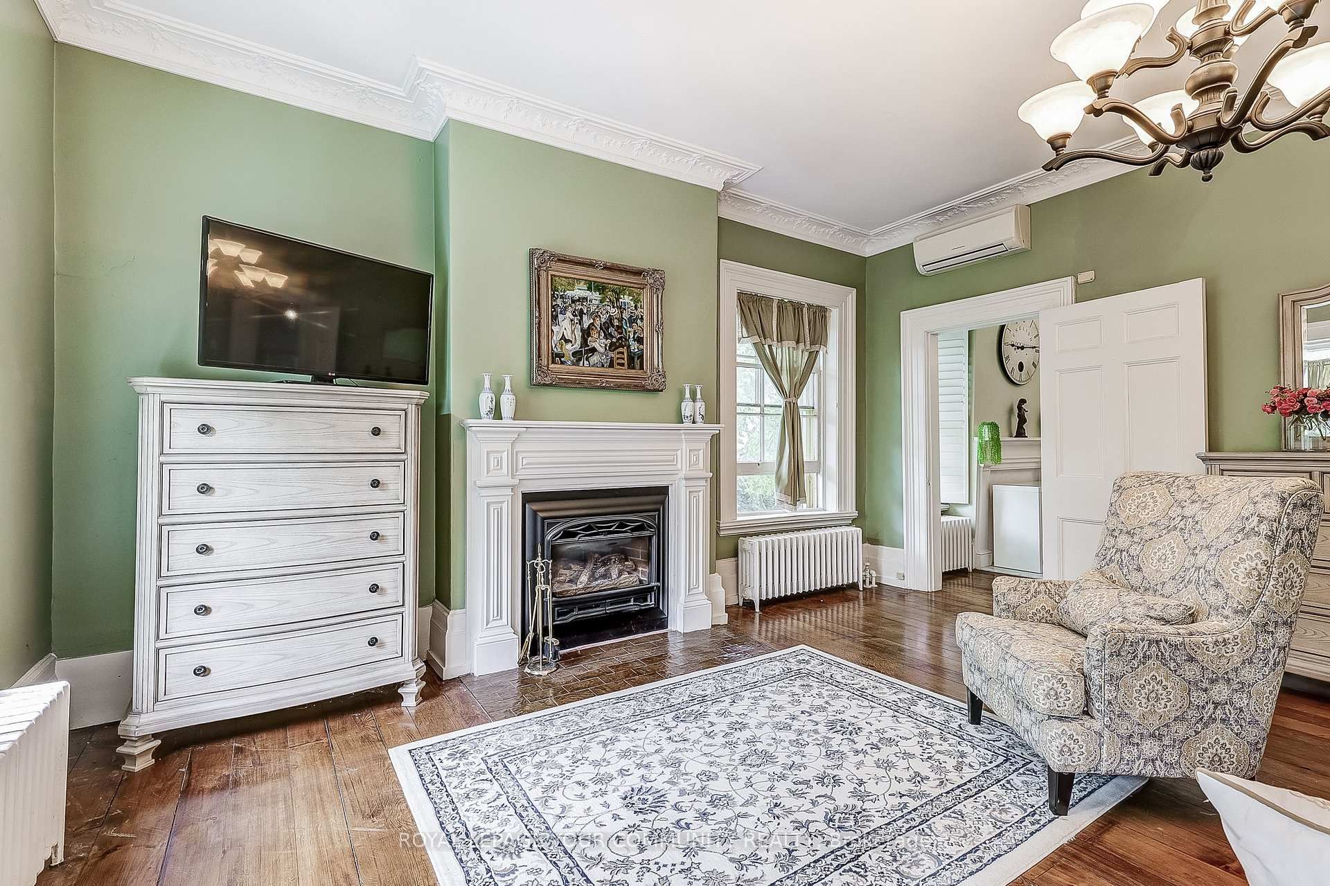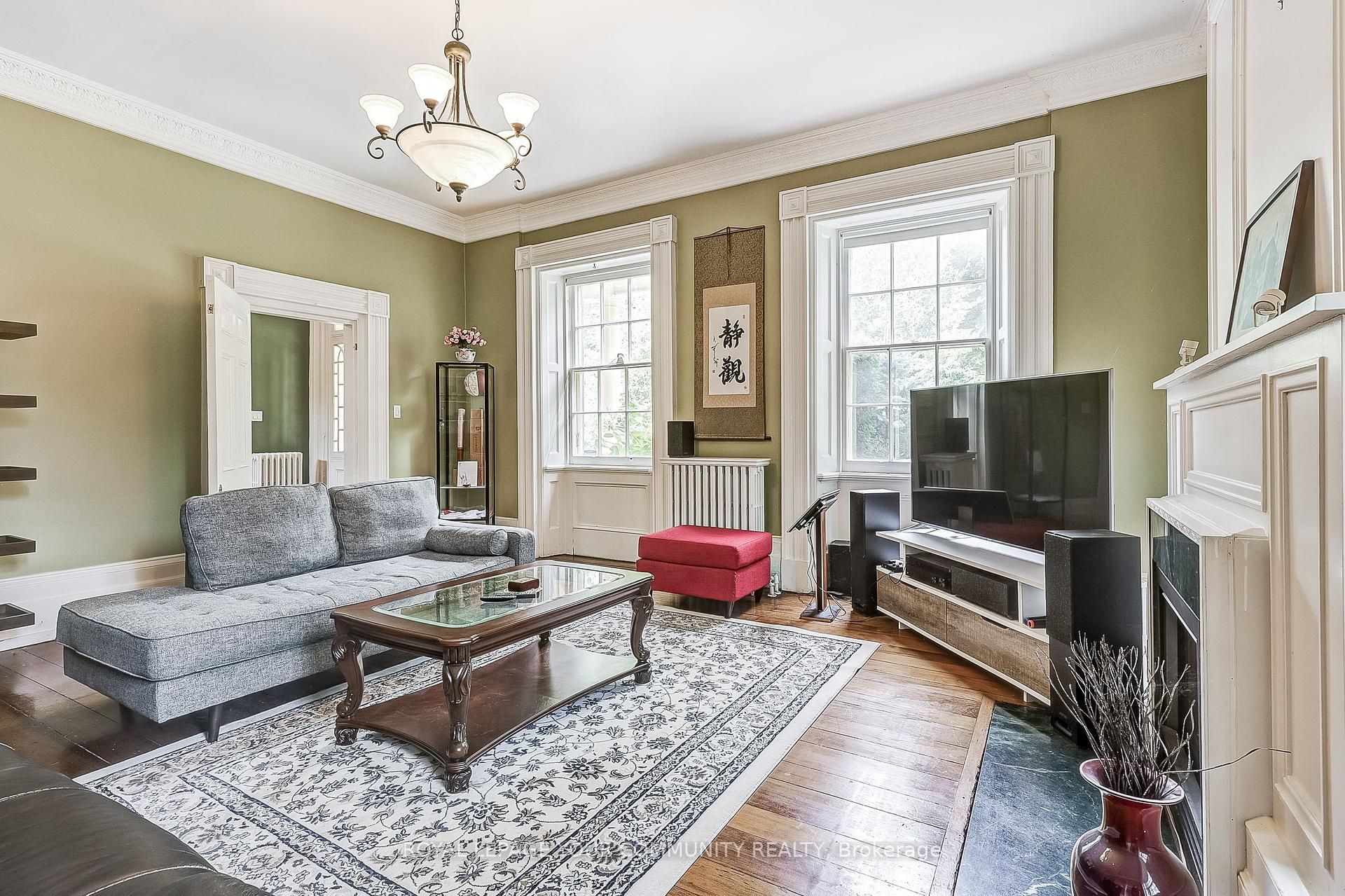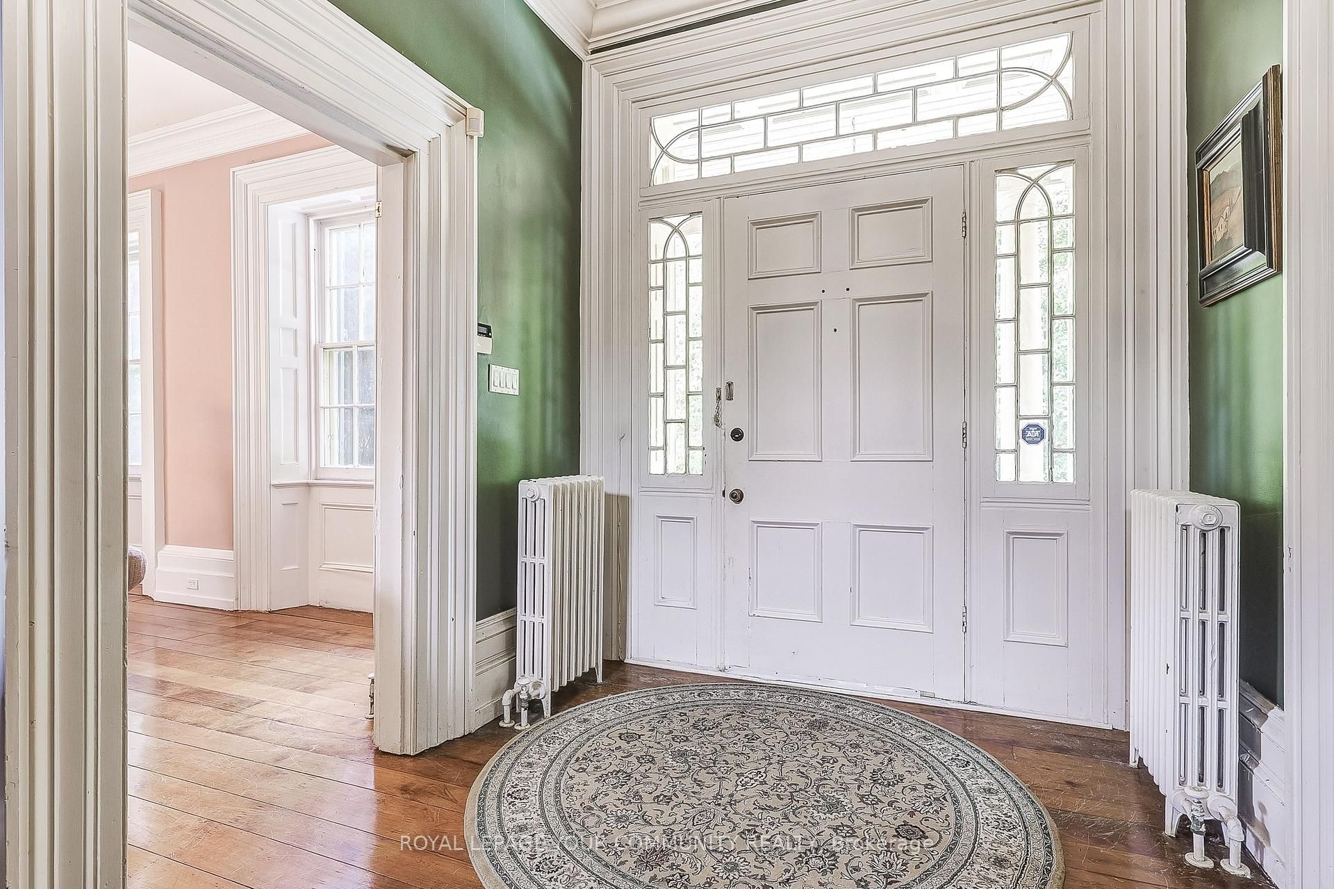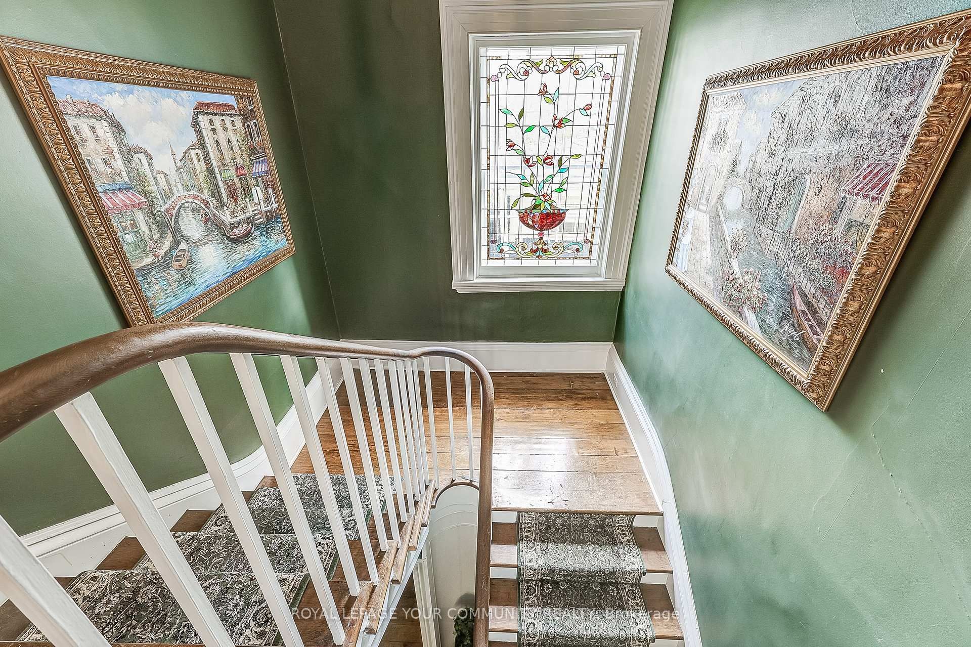 • Features stunning stained glass and intricate crown mouldings throughout.