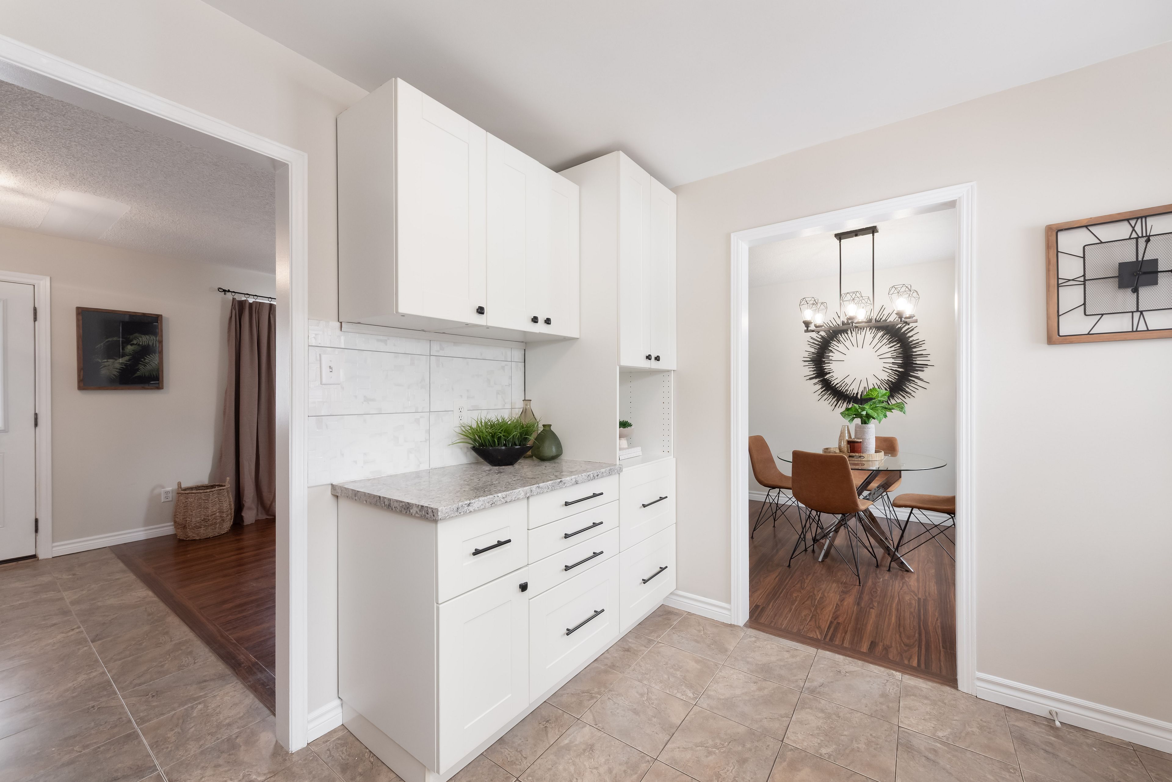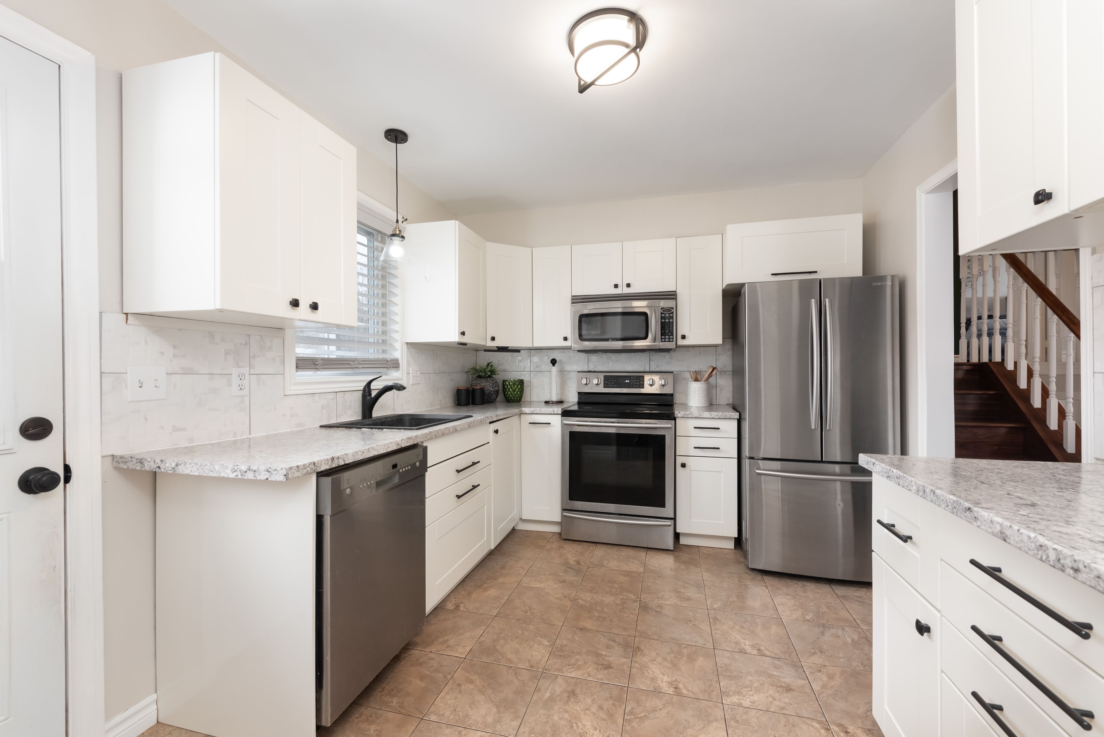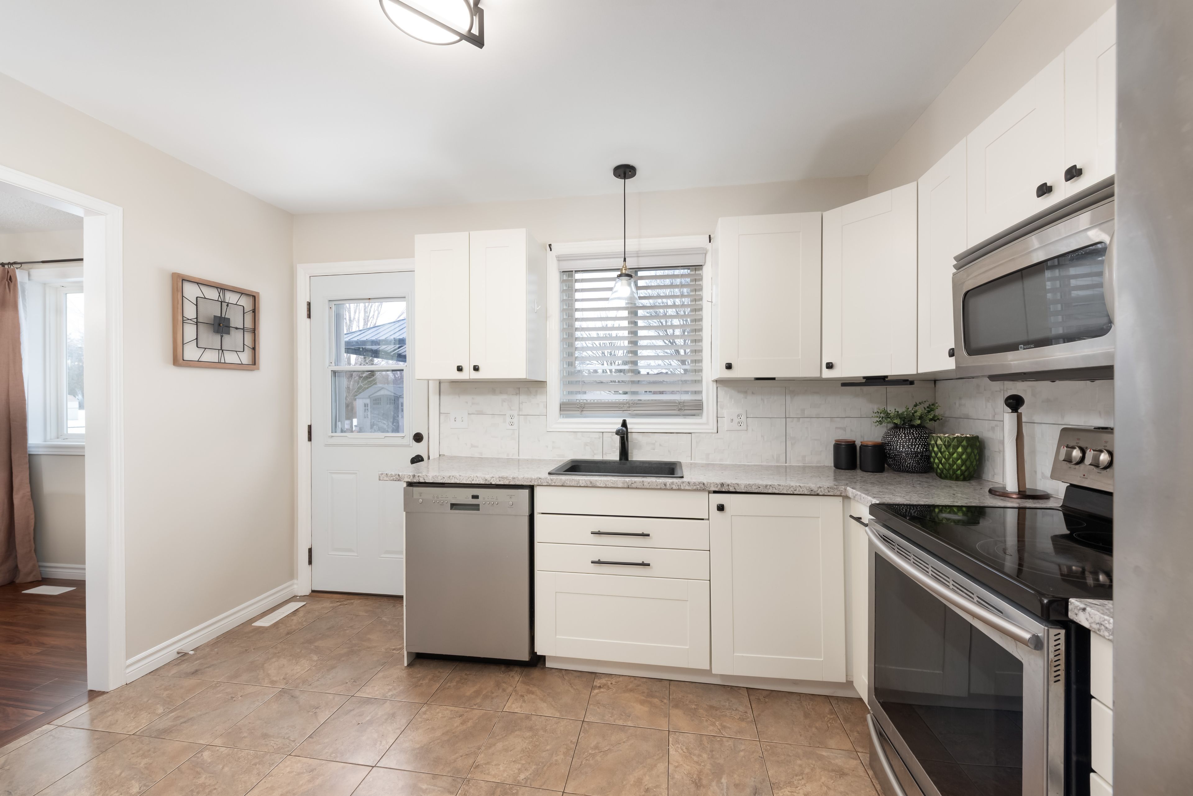 • Updated kitchen and bright dining area with views of the expansive backyard.