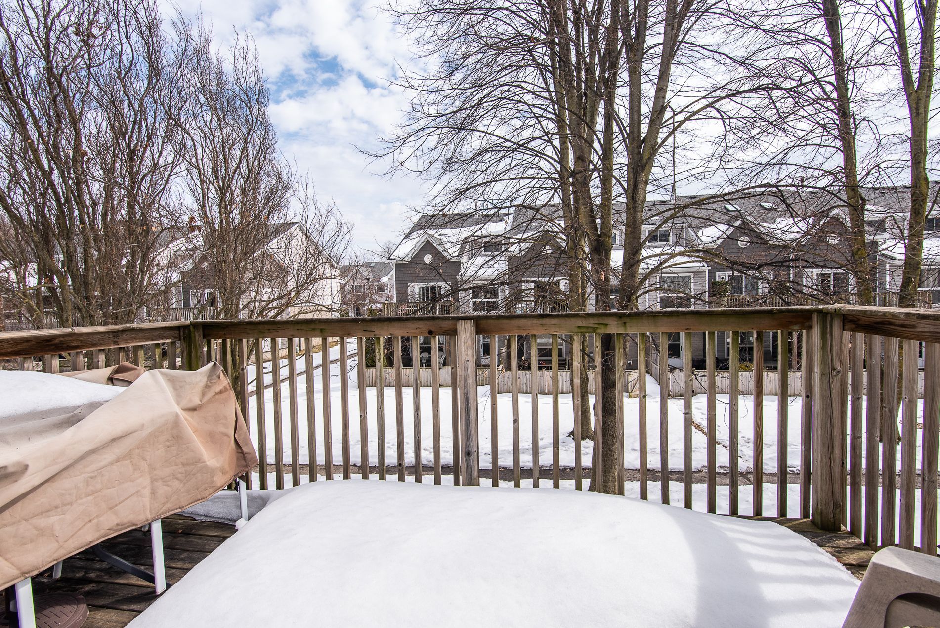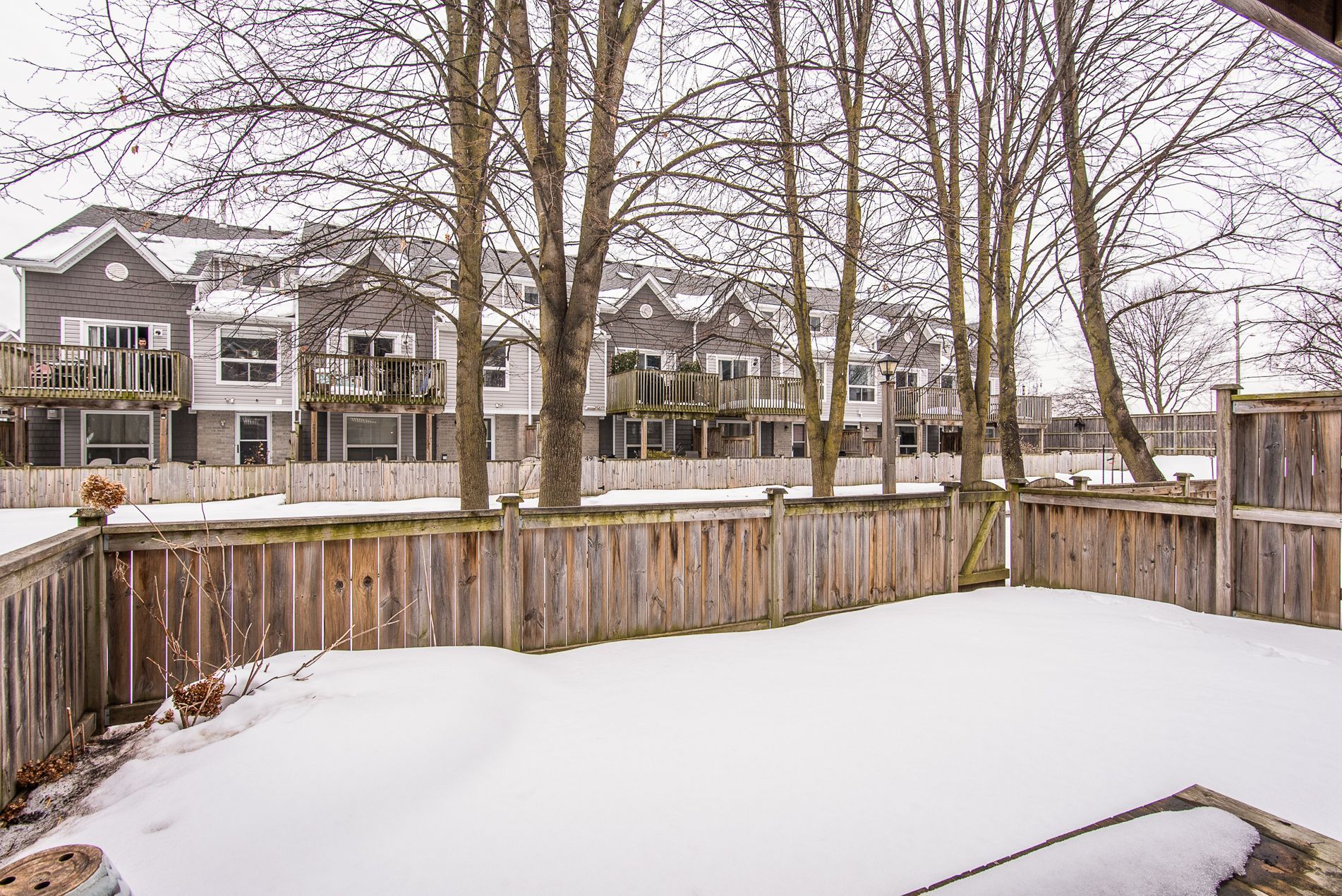 • Private, fully fenced backyard with mature trees for summer privacy.