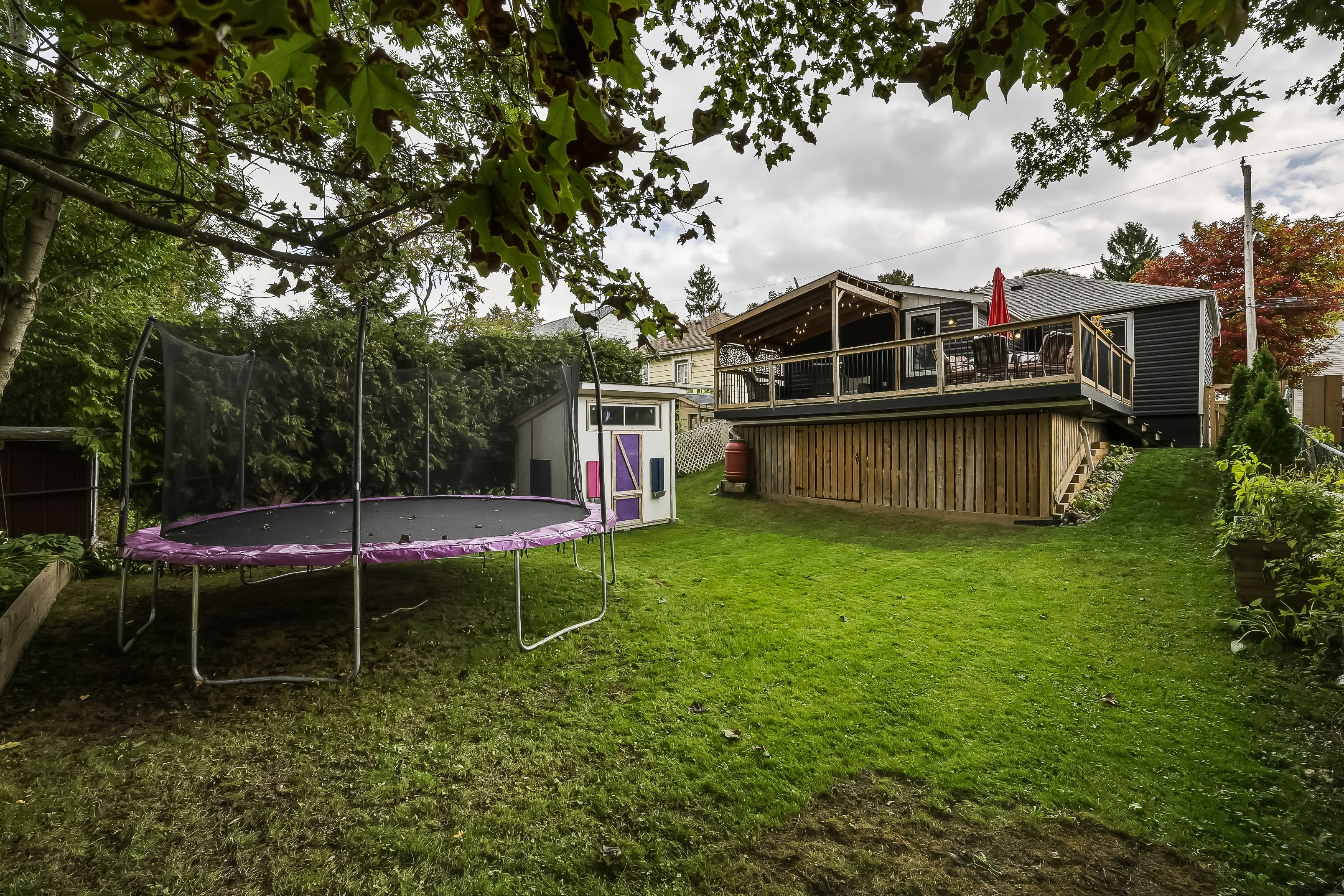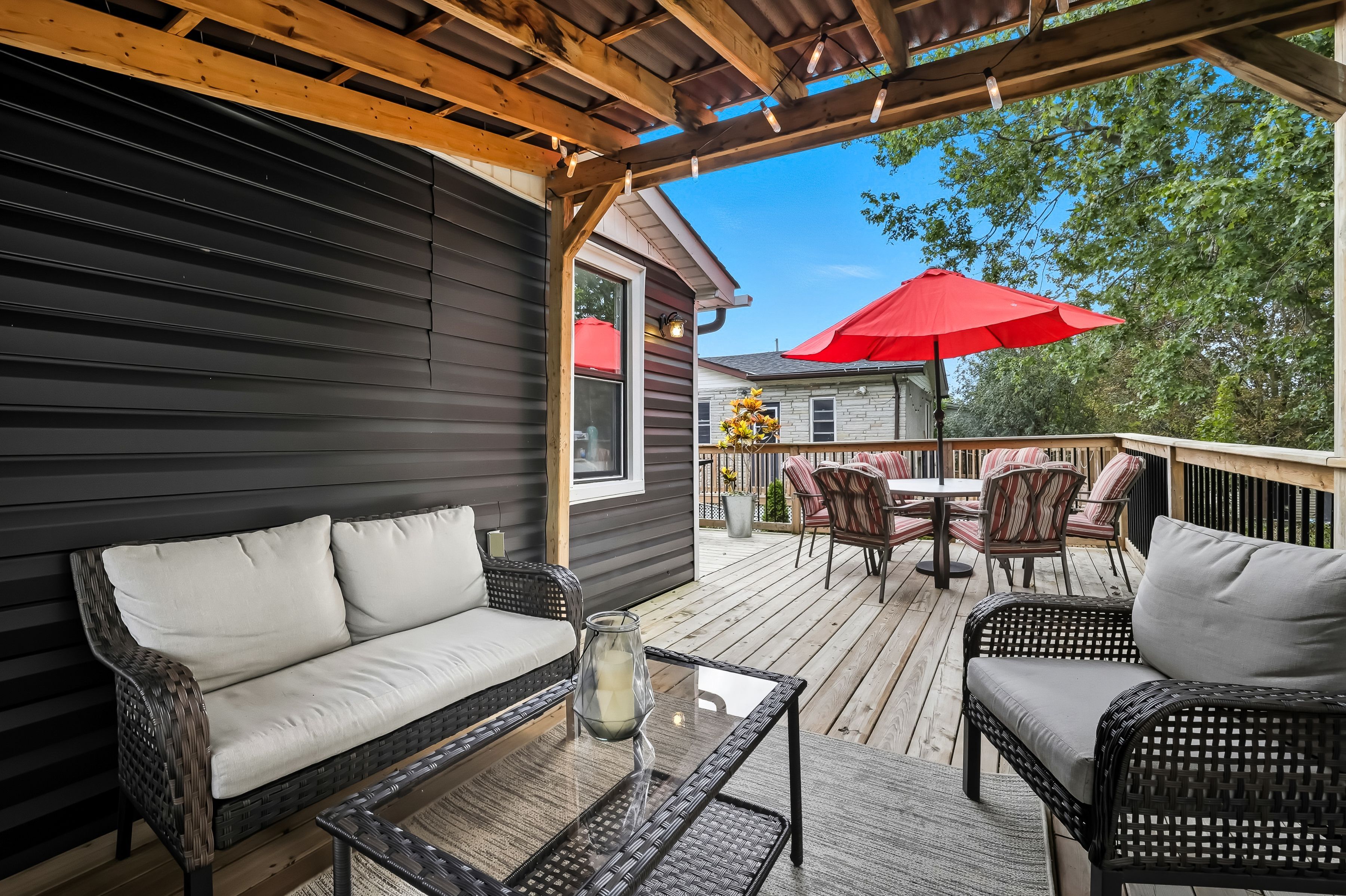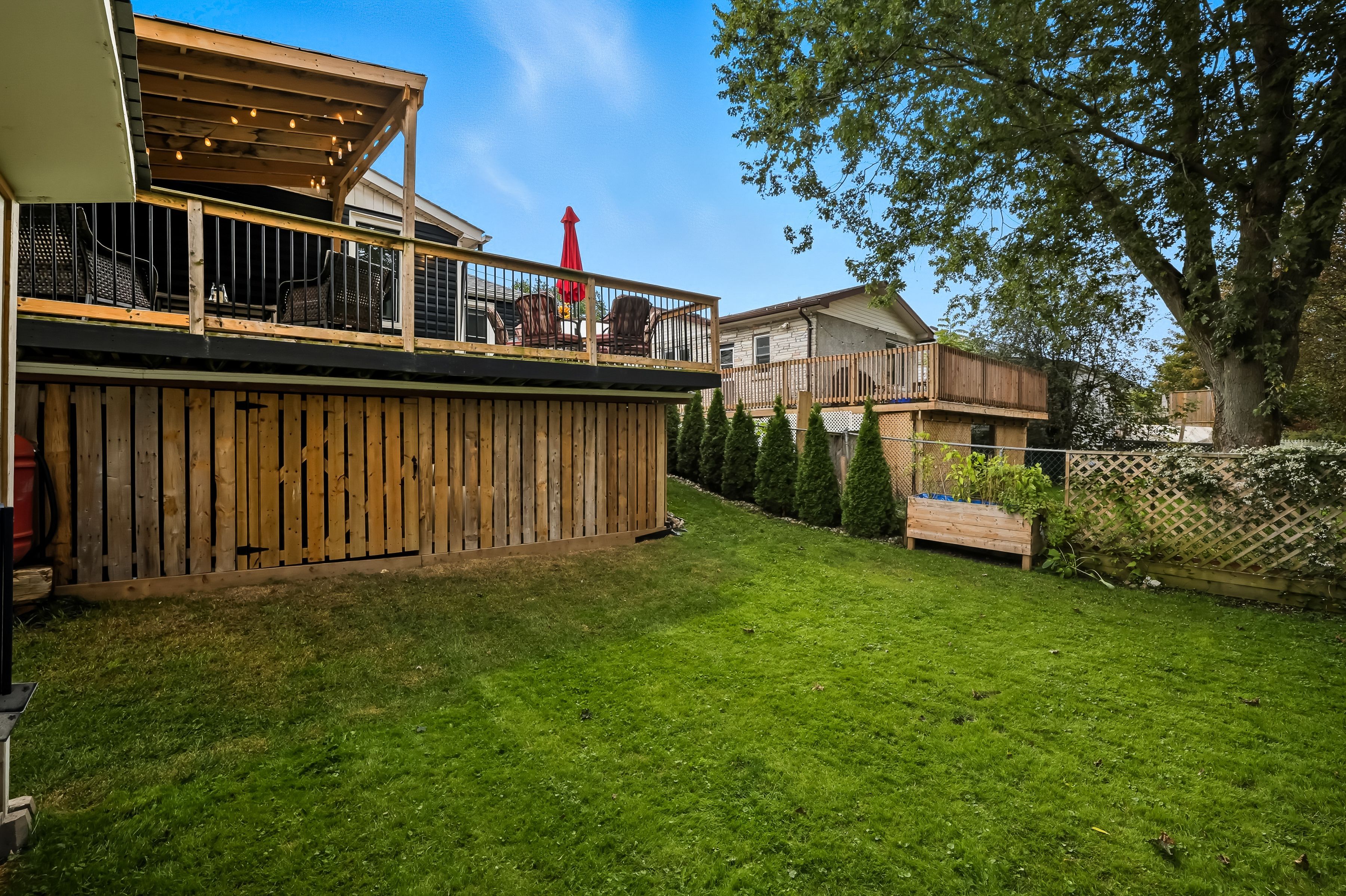 • Large fenced backyard with a deck and custom pergola for outdoor enjoyment.