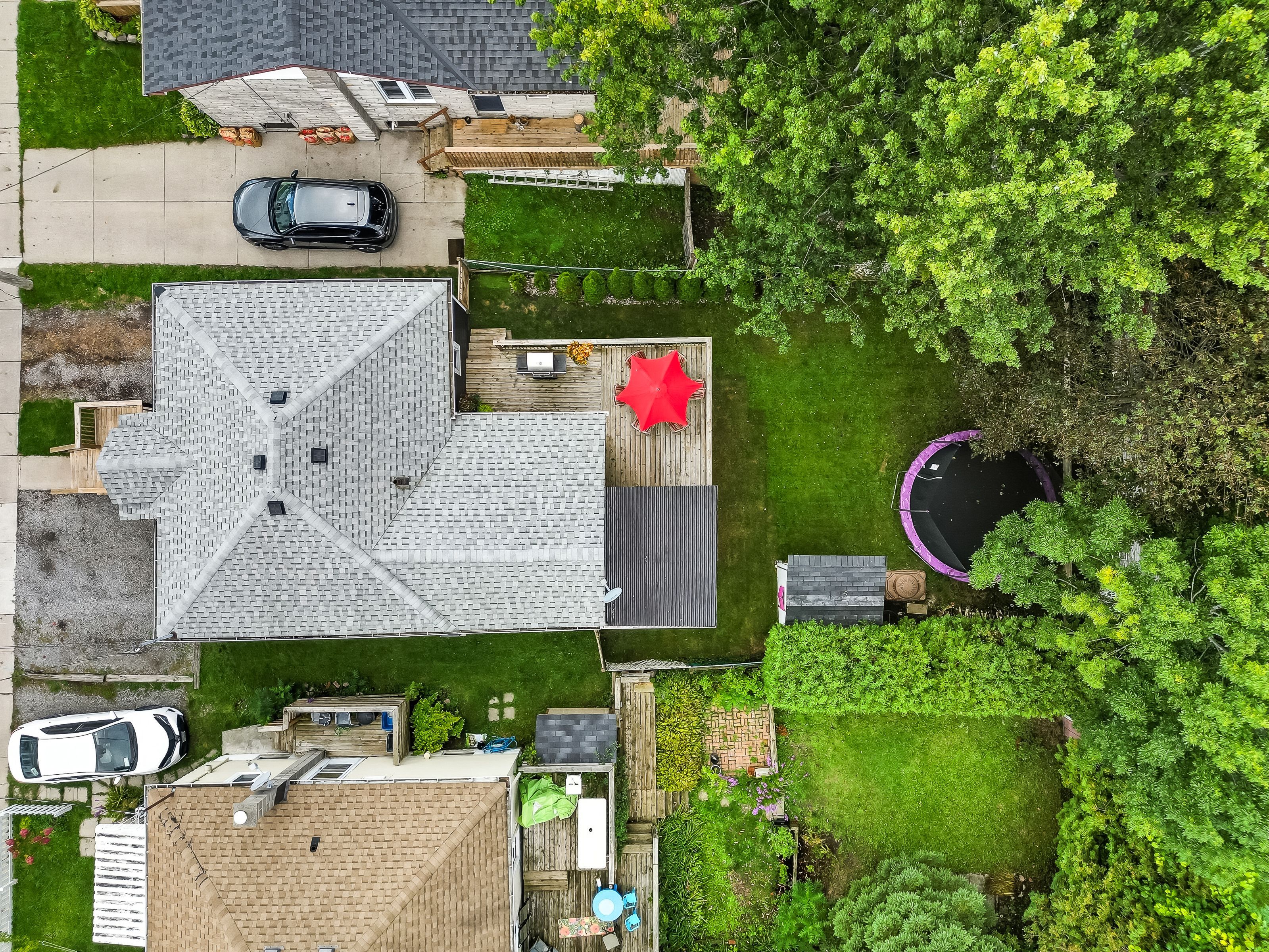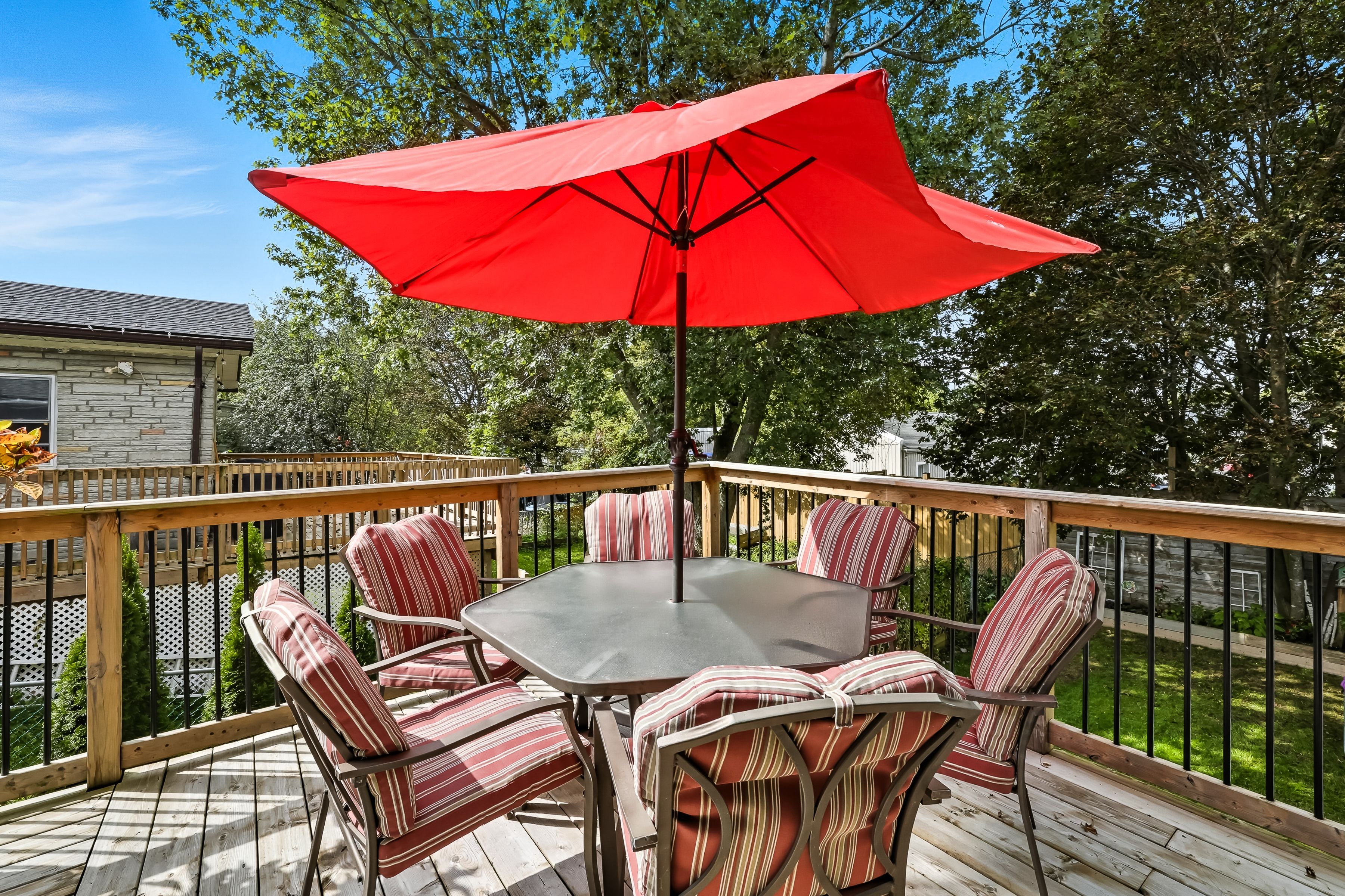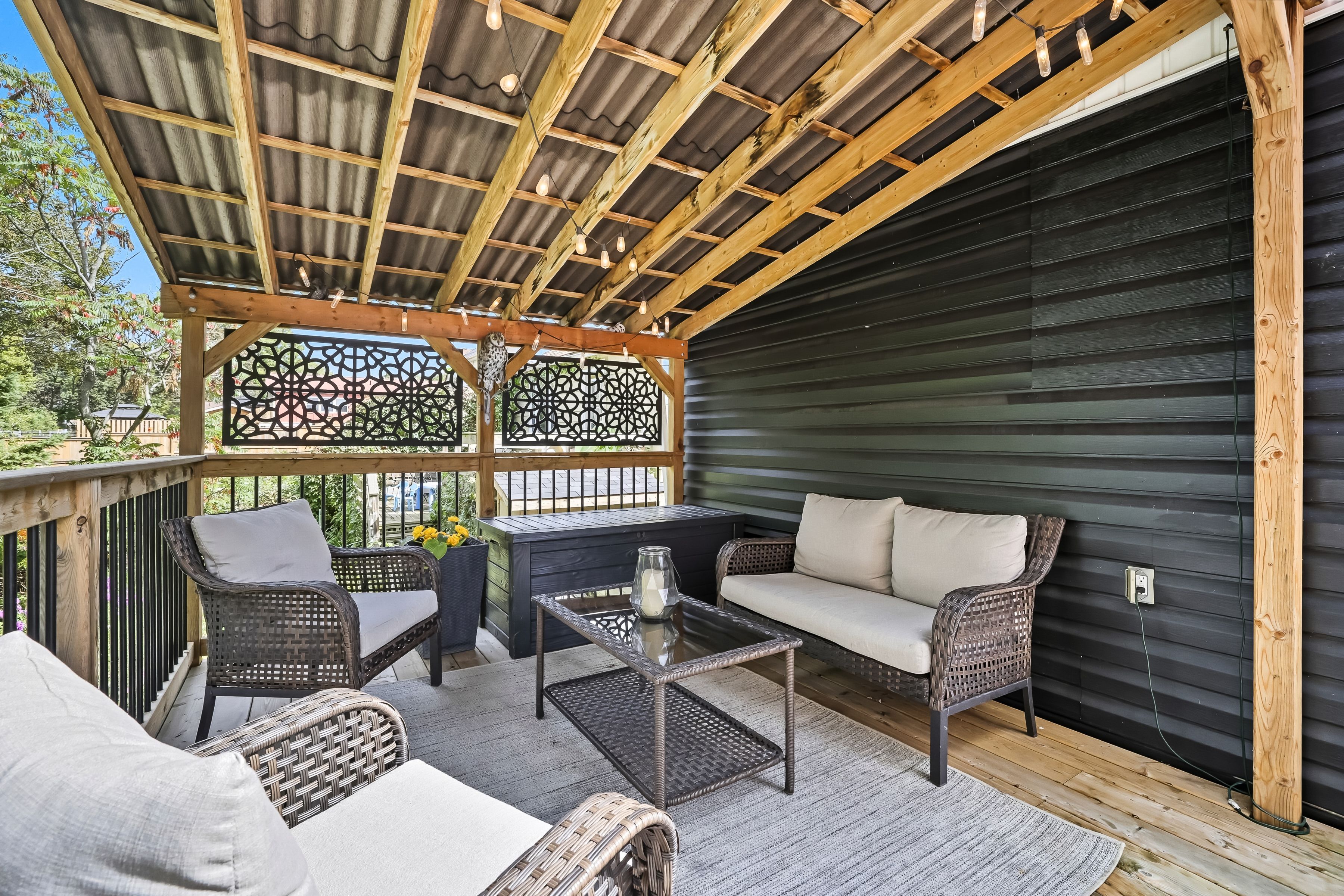 • Large fenced backyard with a deck and custom pergola for outdoor enjoyment.