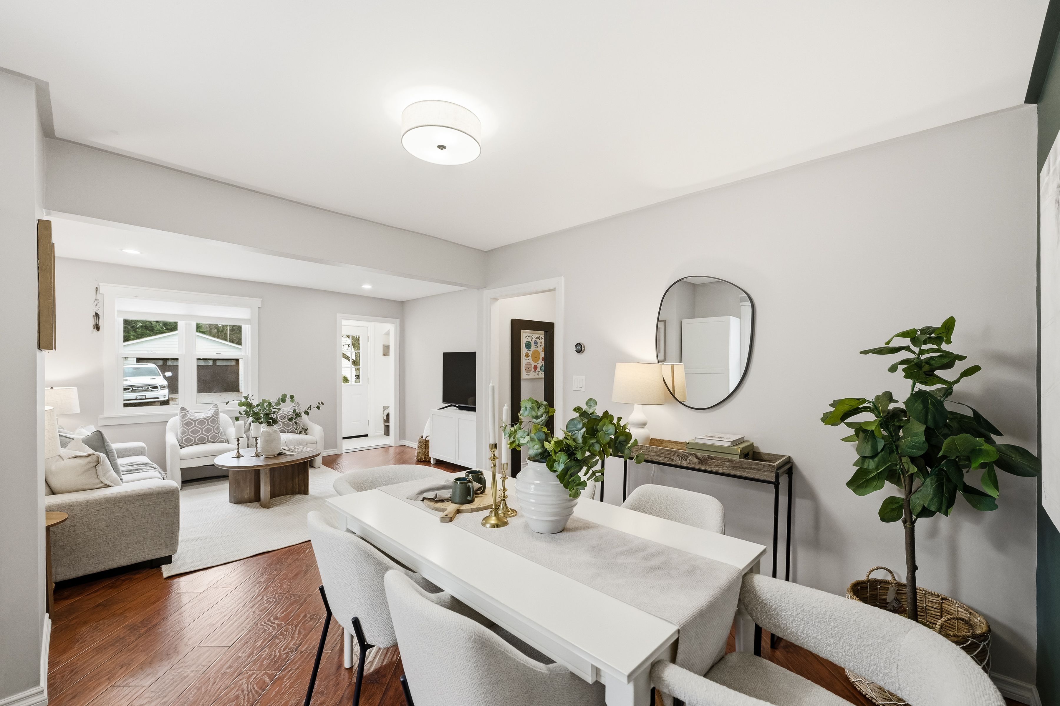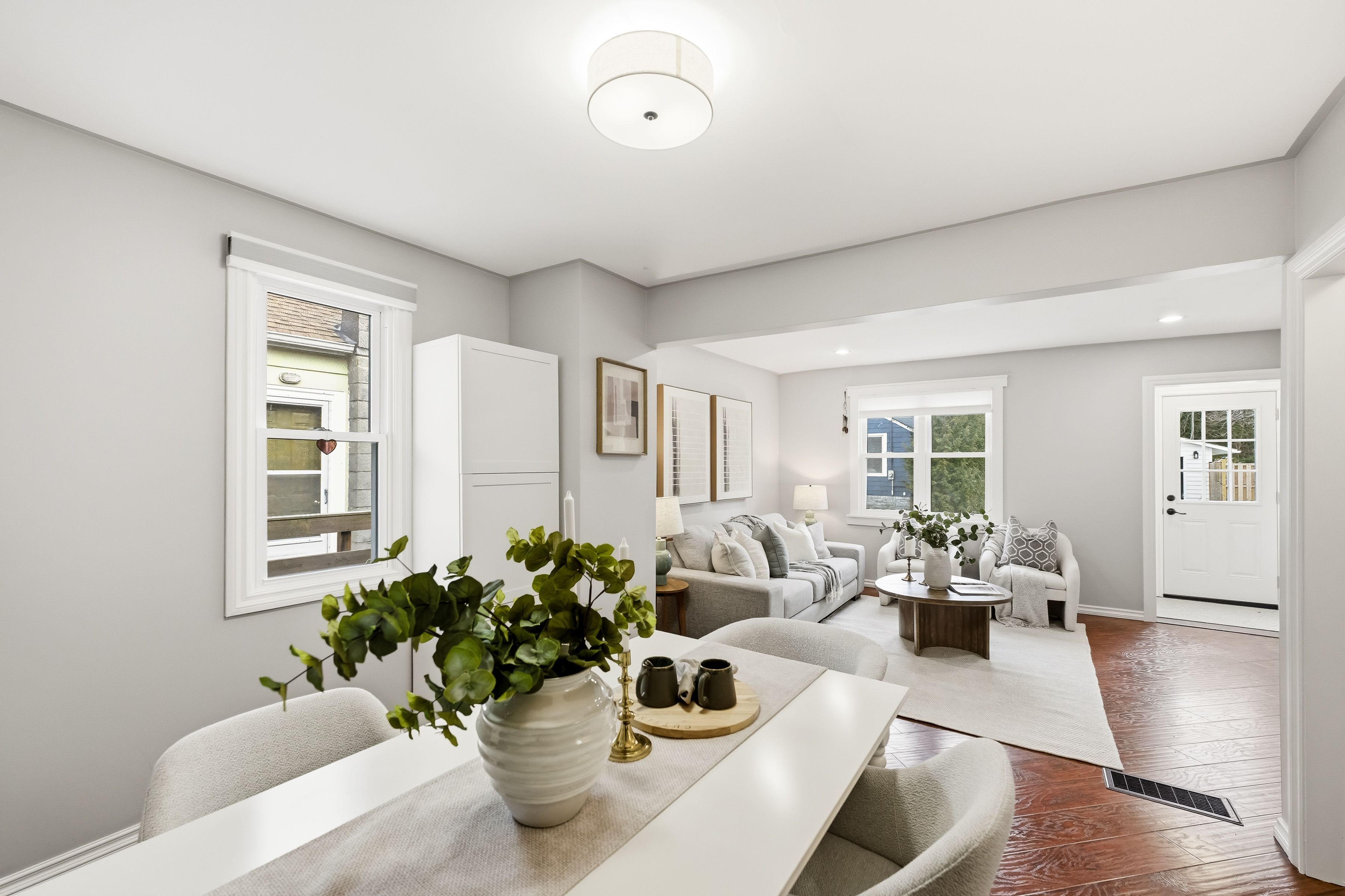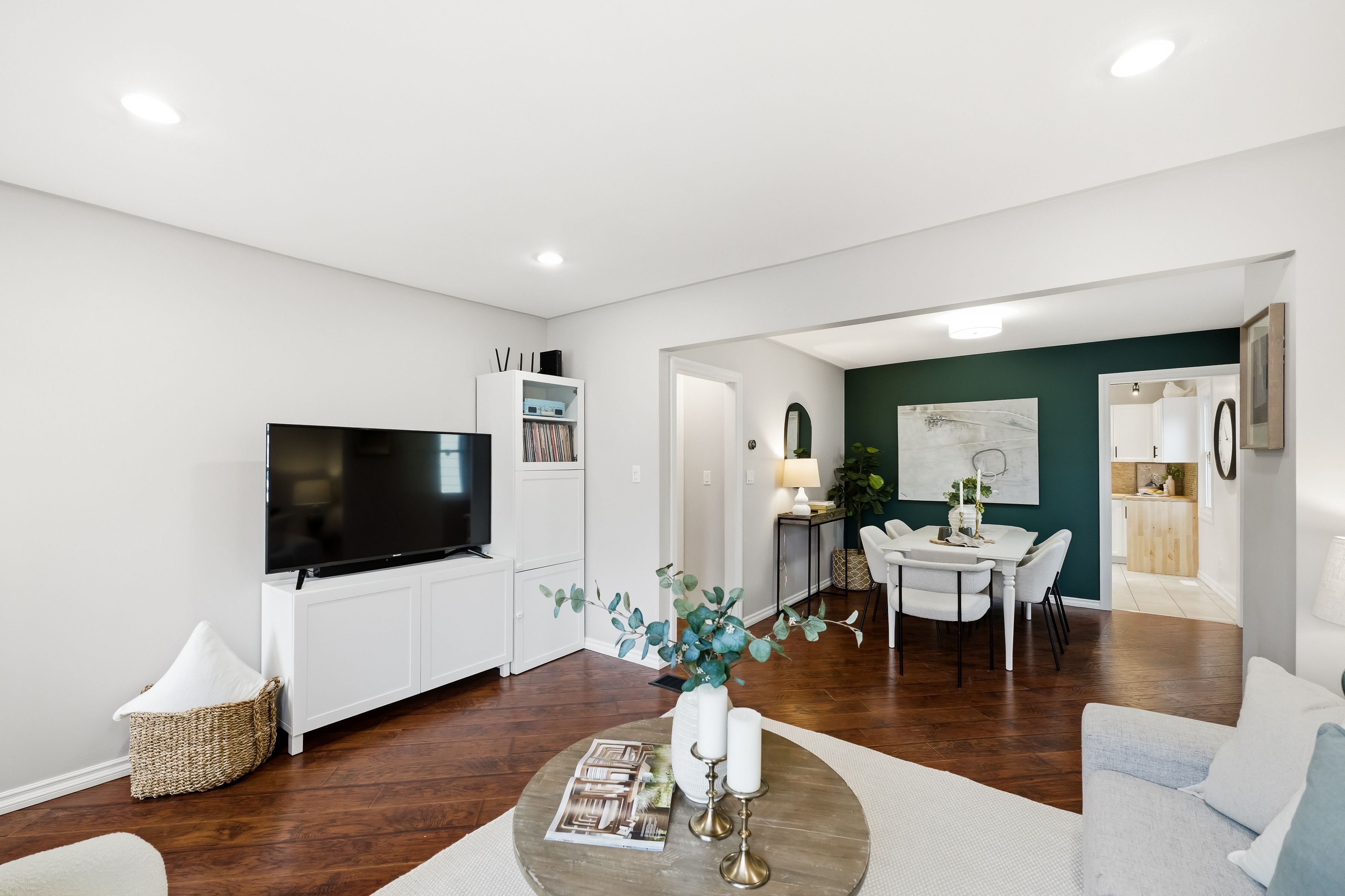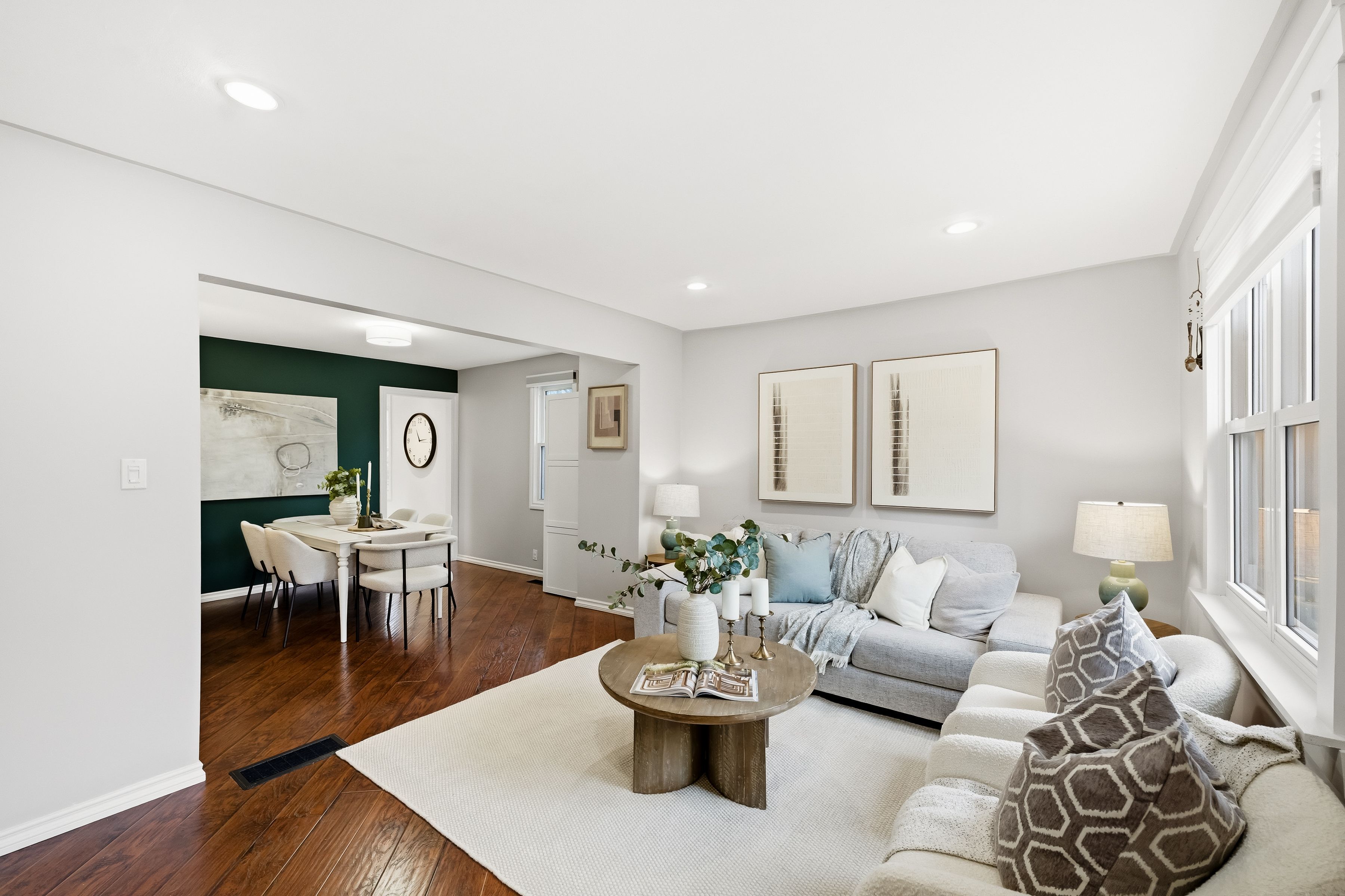 • Open concept living and dining area with laminate floors and pot lights.