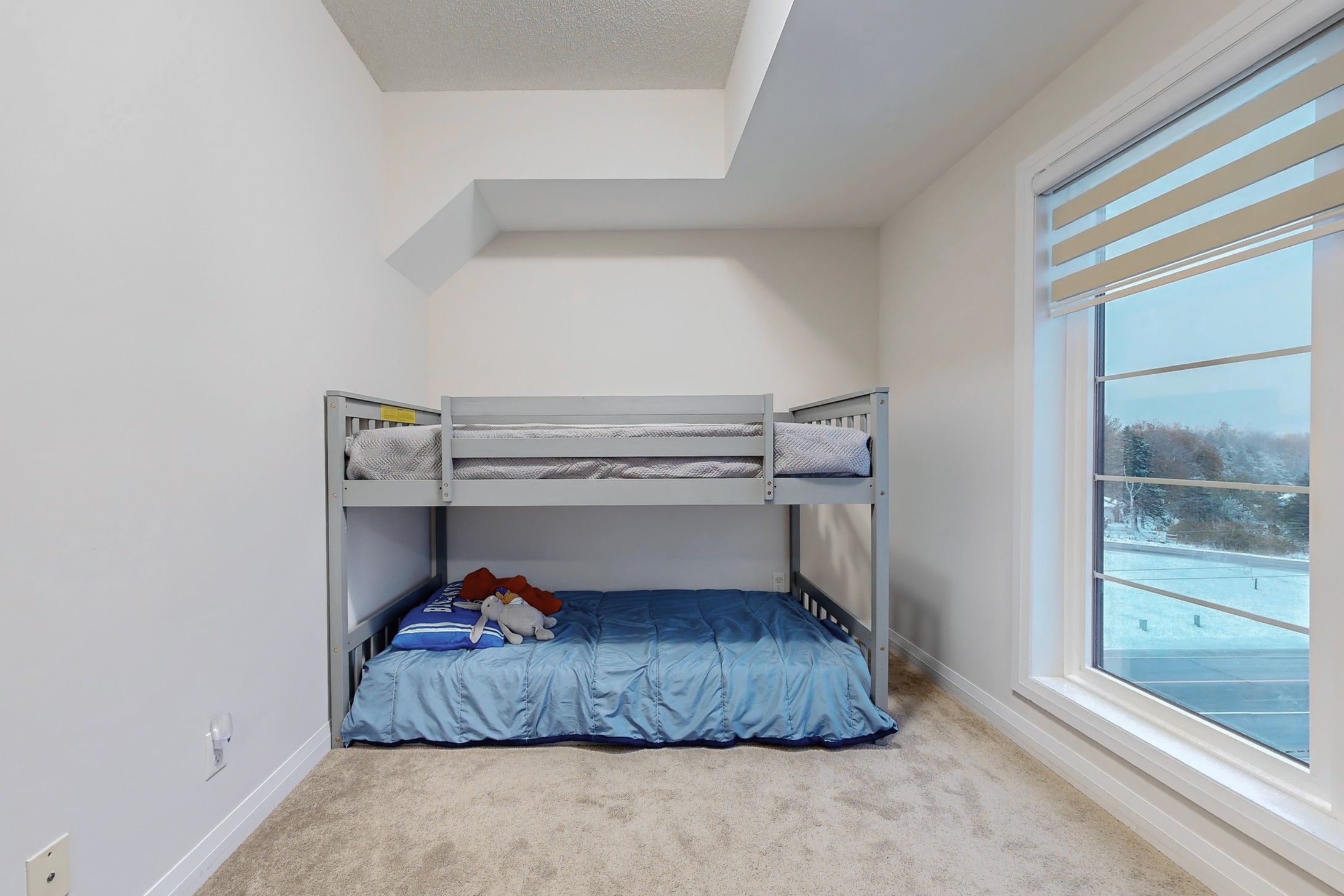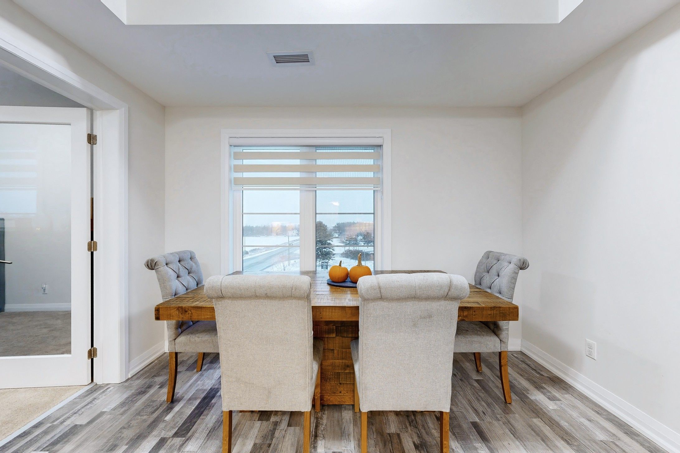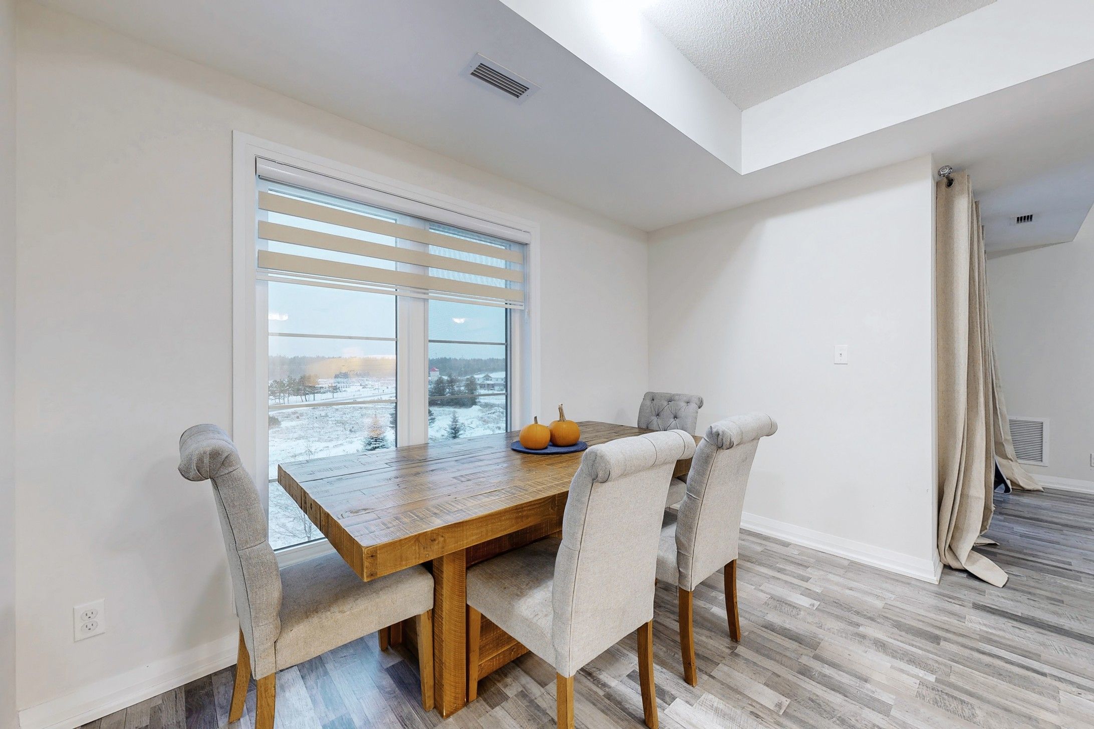 Spacious top-floor corner unit in sought-after bear creek ridge, barrie! Discover this bright 3-bedroom condo offering over 1400 sqft of thoughtfully designed living space, complete with 2 parking spaces and a locker. Step into a welcoming foyer with a convenient entry closet opens into an open-concept layout enhanced by 9ft ceilings and engineered hardwood flooring throughout the main living areas. The stylish galley kitchen is beautifully appointed with stainless steel appliances, a built-in microwave and dishwasher, granite countertops, a sleek tile backsplash, and abundant cabinetry for optimal storage. A sunlit dining area with a large picture window flows seamlessly into the spacious living room, where sliding doors lead to a private balcony with picturesque south-facing views, perfect for relaxing or entertaining. The primary bedroom includes 2 large closets and a 3pc ensuite with a frameless glass shower and granite-topped vanity. The second bedroom features a large window with roller blinds, while the third bedroom, framed by french doors and a picture window, offers versatility as a guest room, home office, or den. A separate 4pc bathroom with a soaker tub, shower, granite-topped vanity, and ensuite laundry completes the layout. Residents of 'kodiak' enjoy family-friendly outdoor amenities, including a playground and chess court. Ideally situated in a vibrant community surrounded by scenic trails, parks, top-rated schools, and everyday conveniences, this home combines modern comfort with timeless appeal. An exceptional opportunity to call bear creek ridge home!