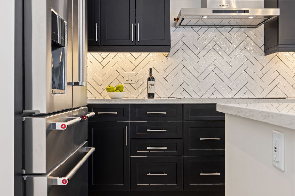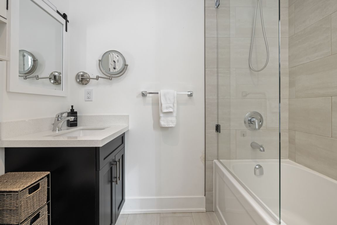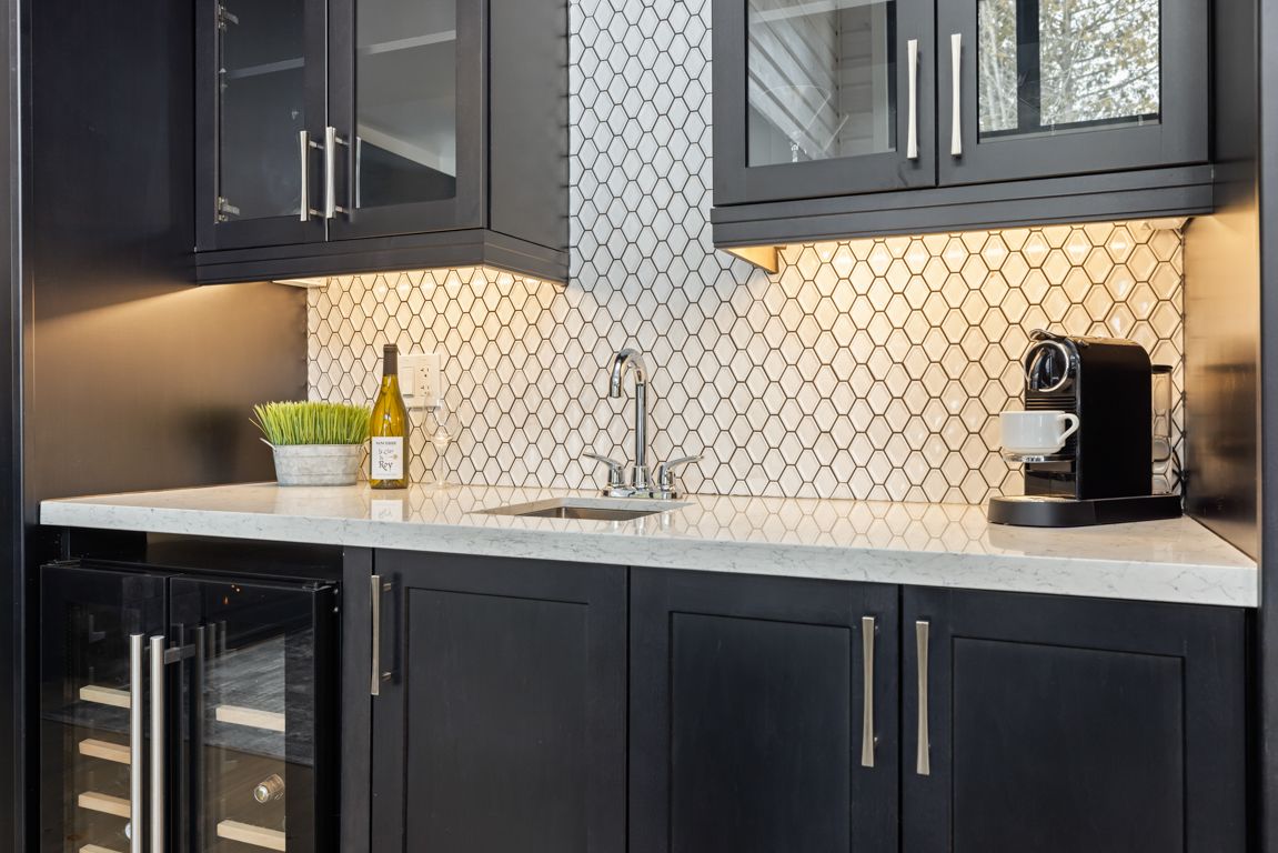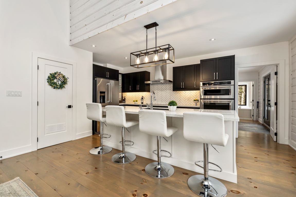 • Designer kitchen with quartz counters and large island for meals.