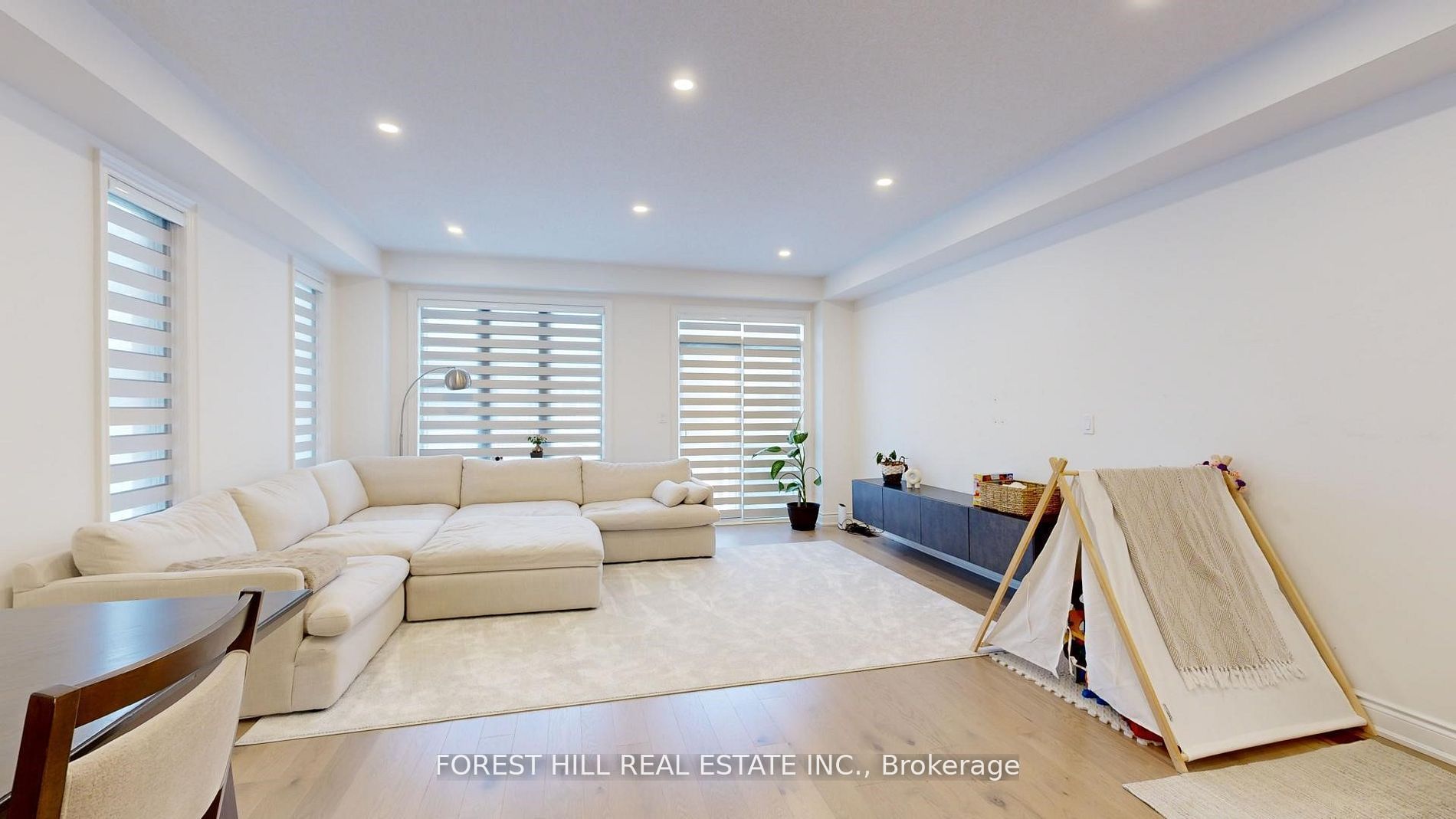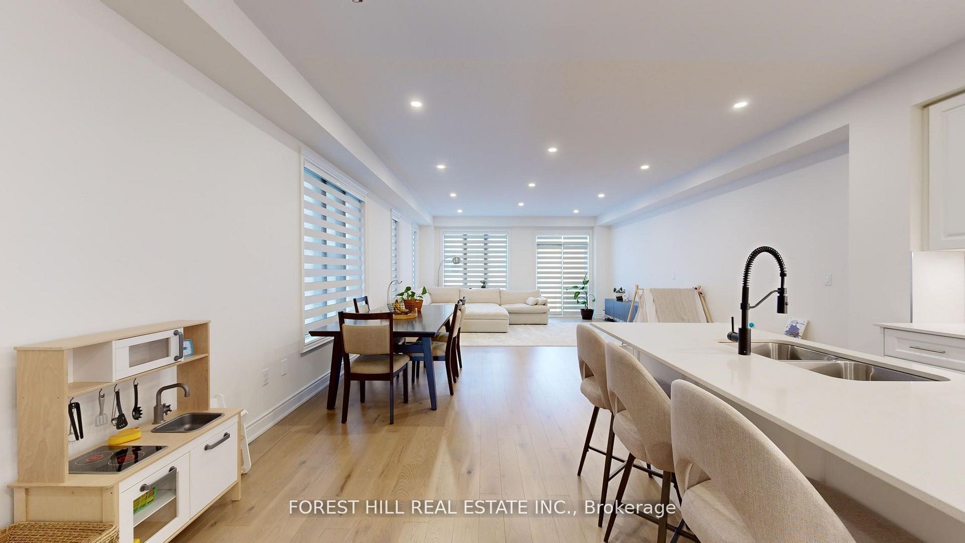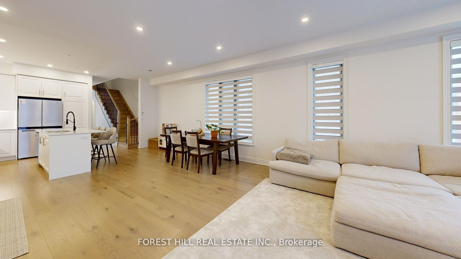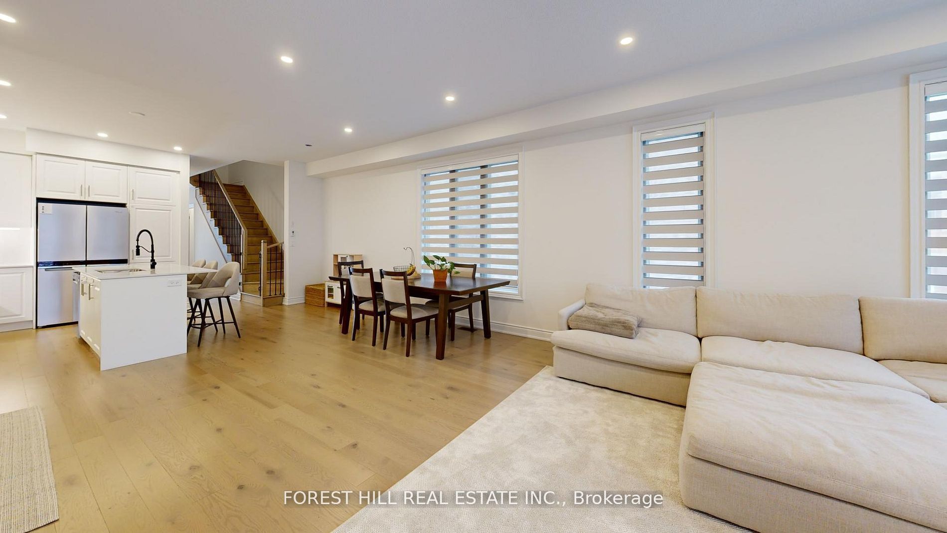 • Bright living area flows into a stylish kitchen with high-end appliances.