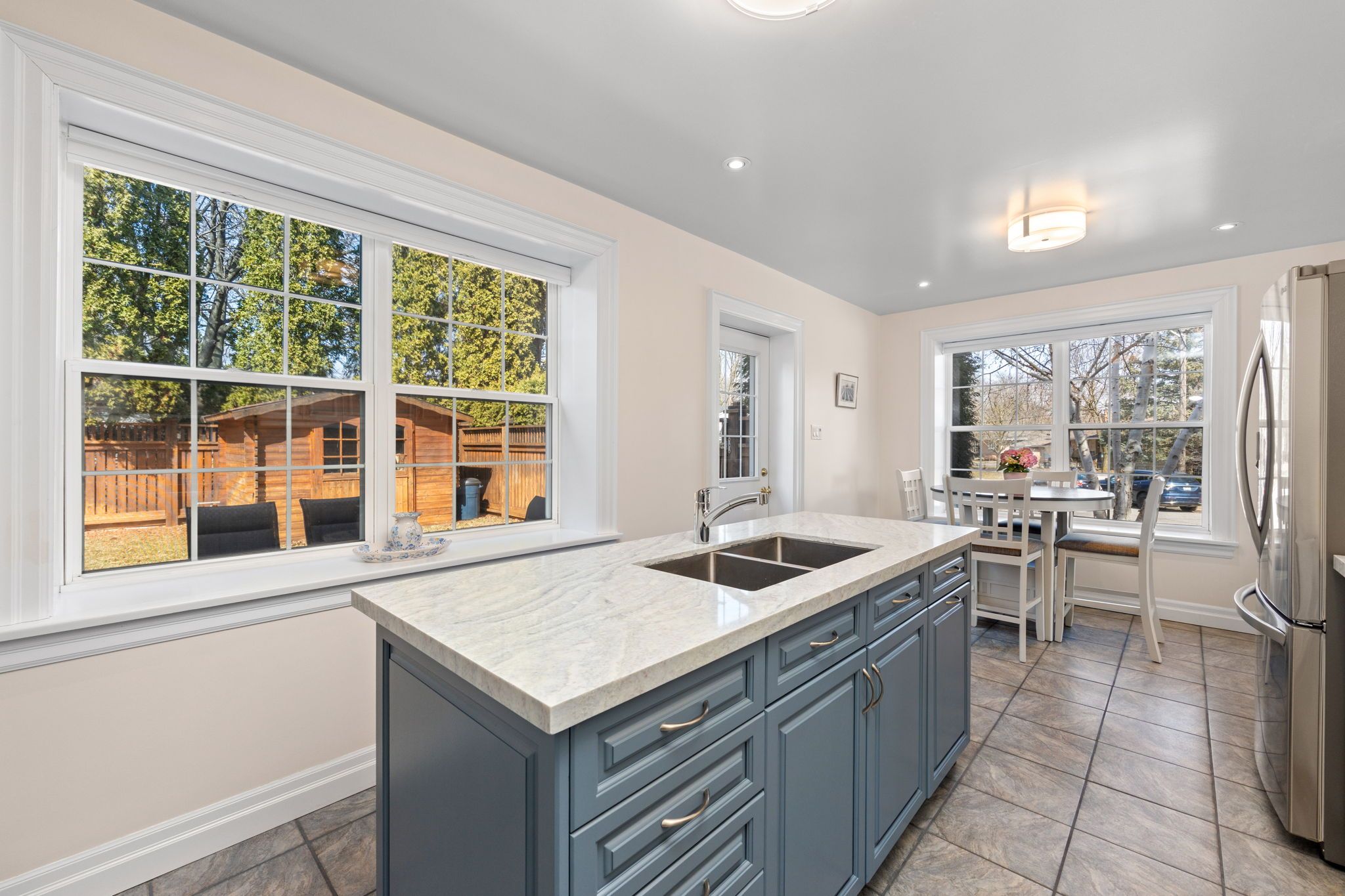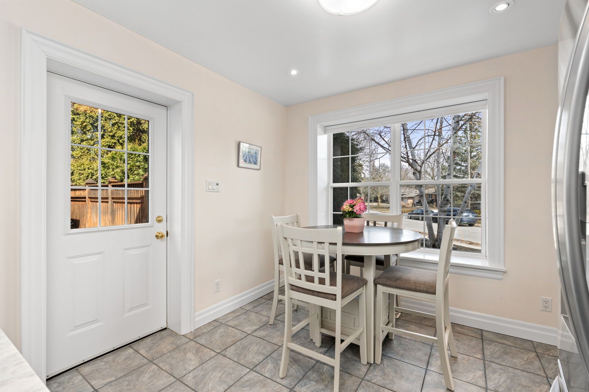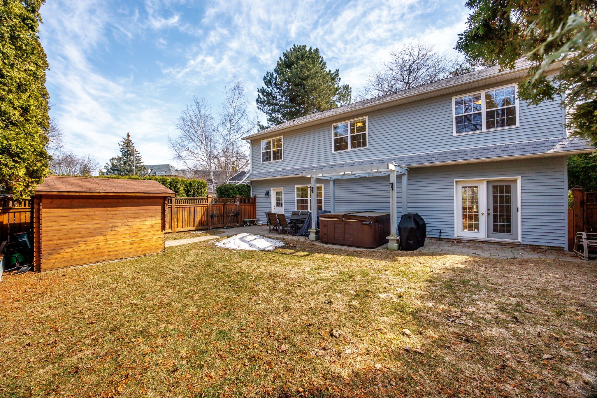 • Private fenced backyard surrounded by mature trees for tranquility.