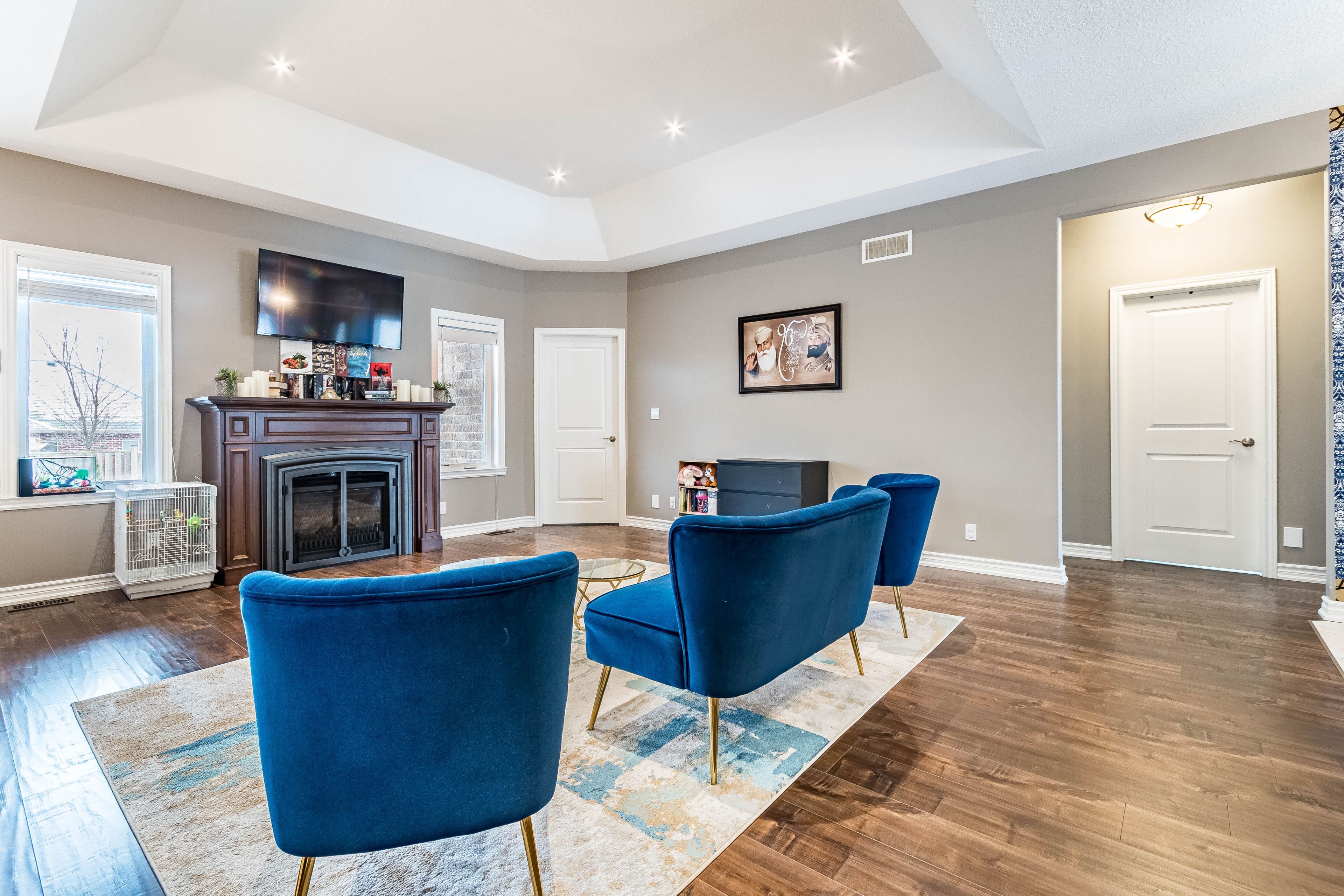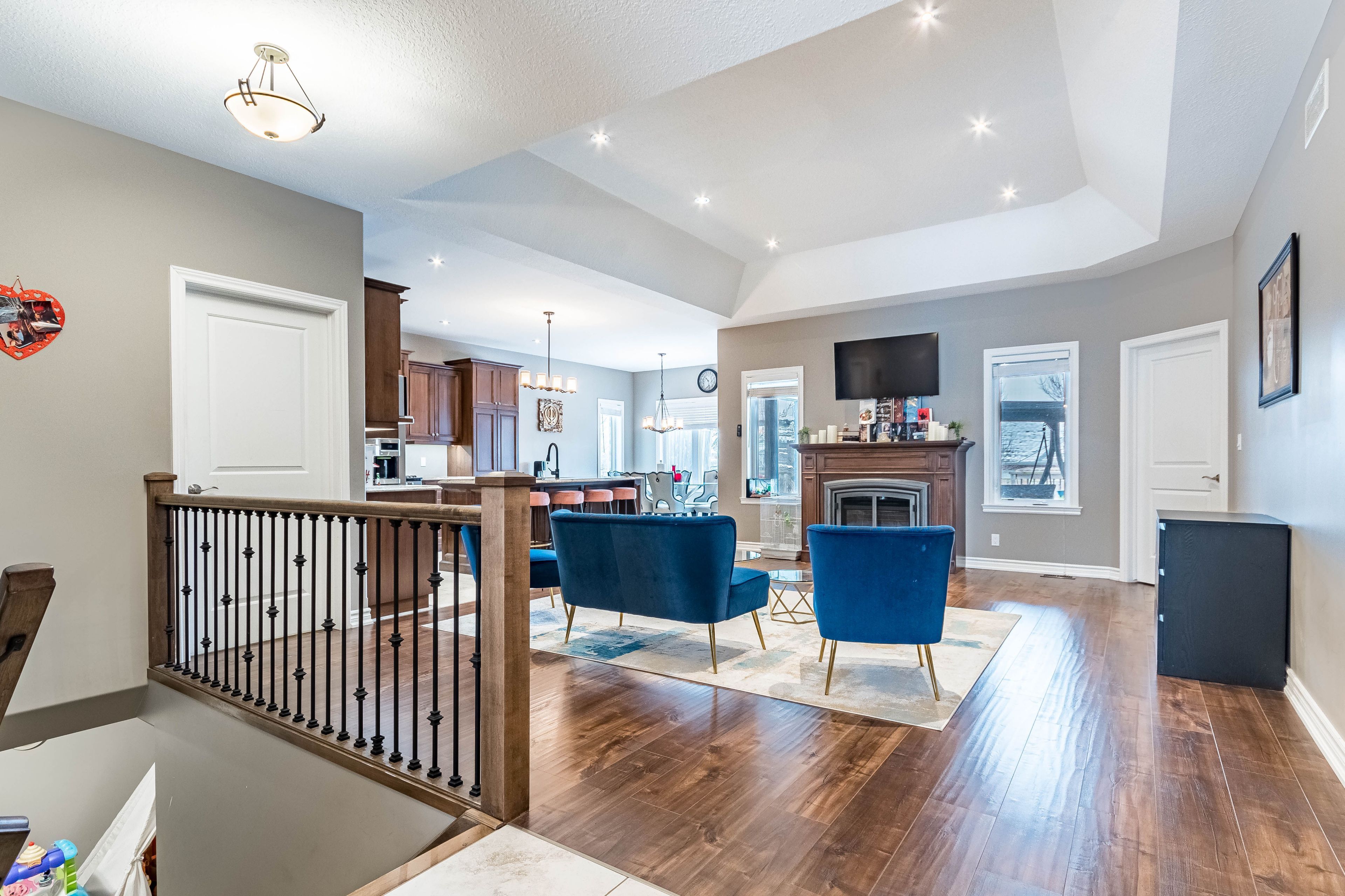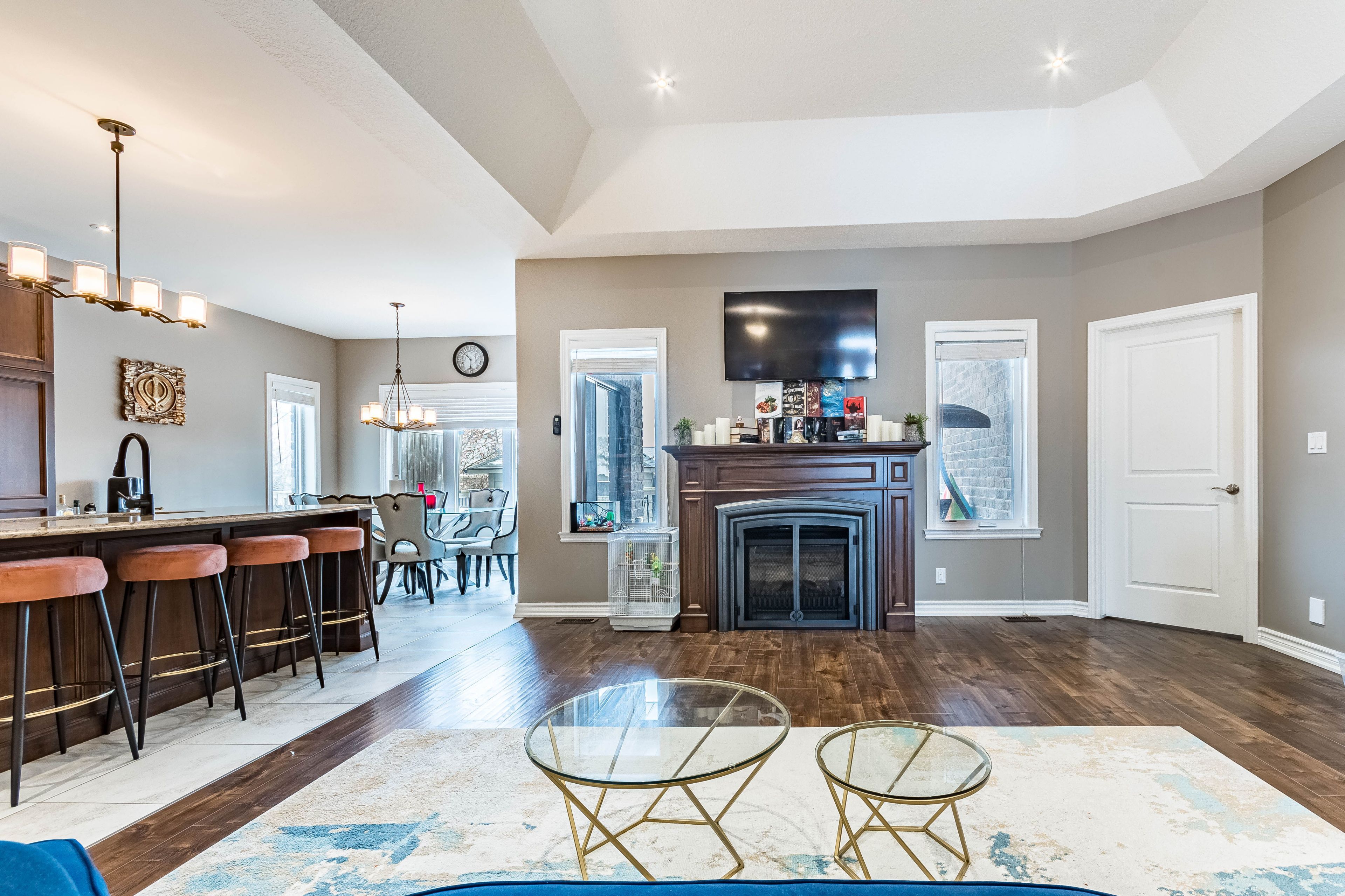 • Spacious open-concept living area with high ceilings and a fireplace.