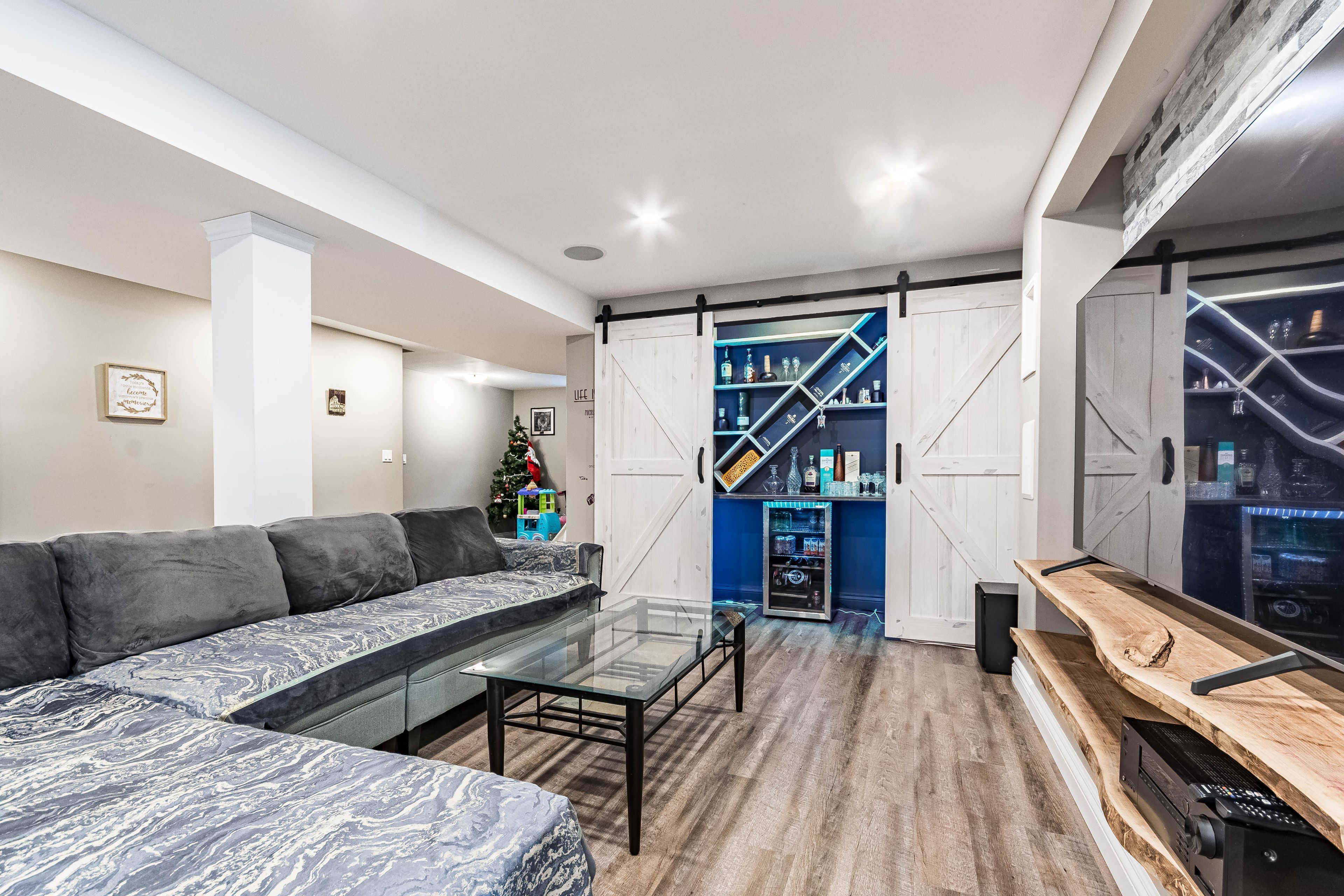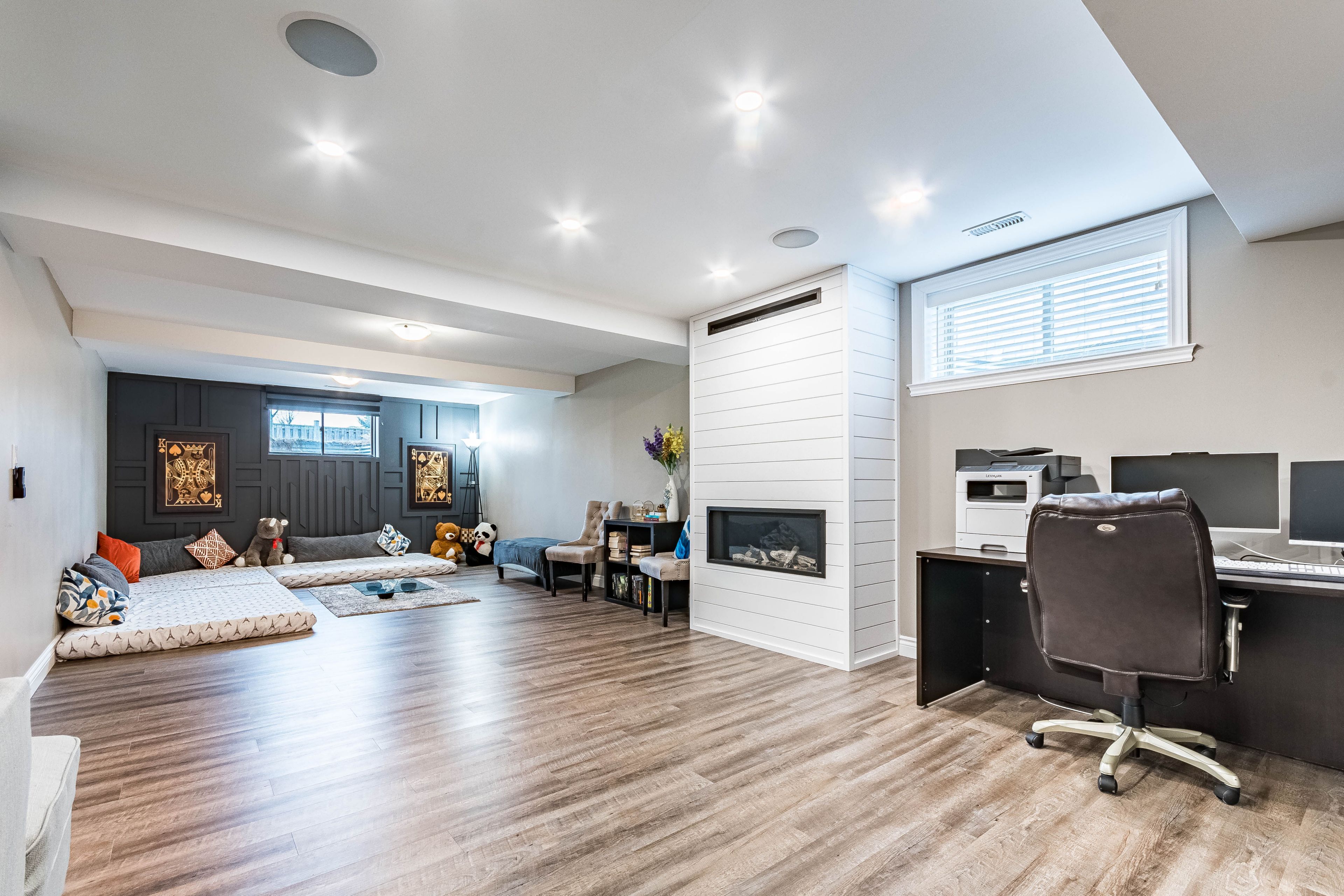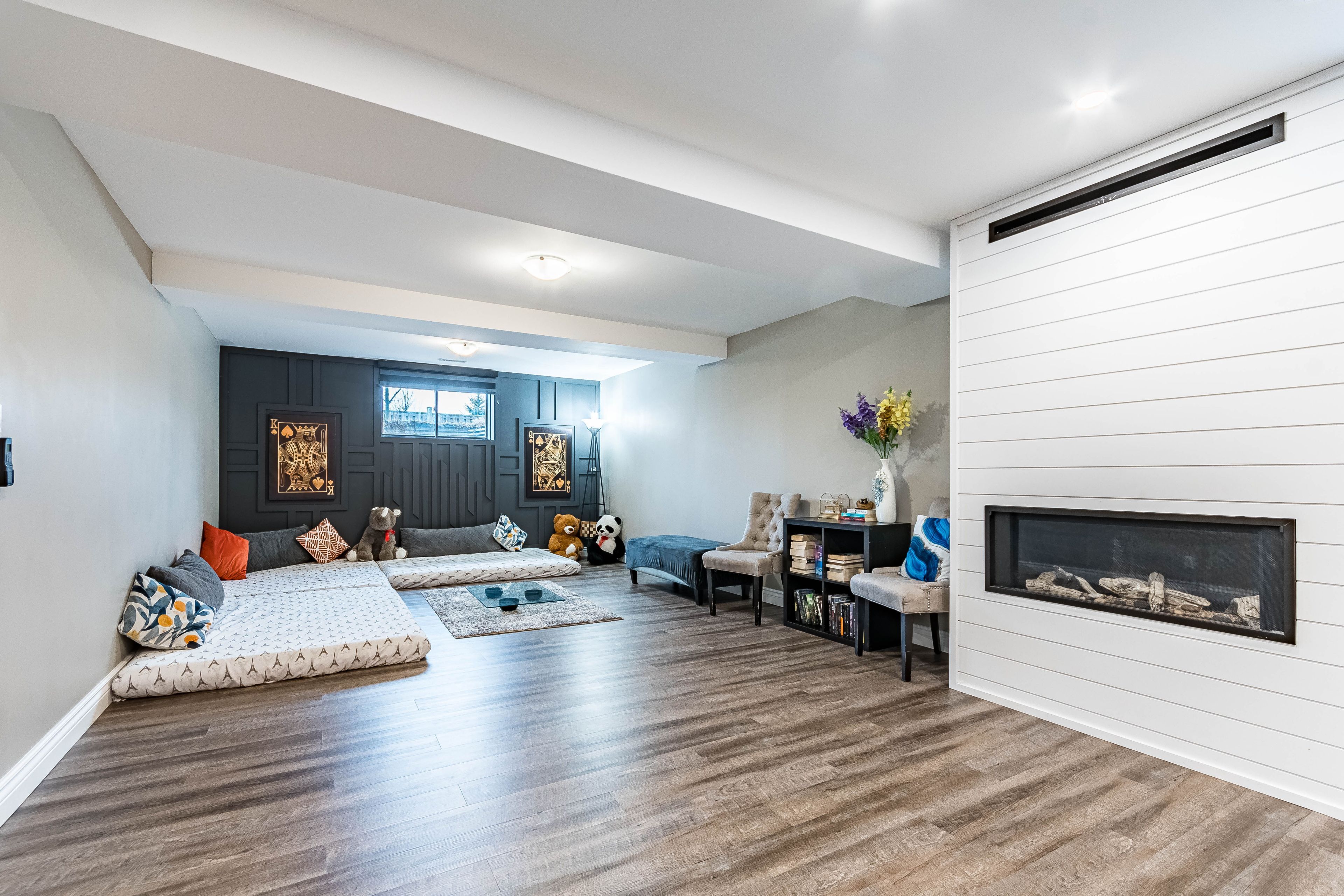 • Spacious open-concept living area with high ceilings and a fireplace.