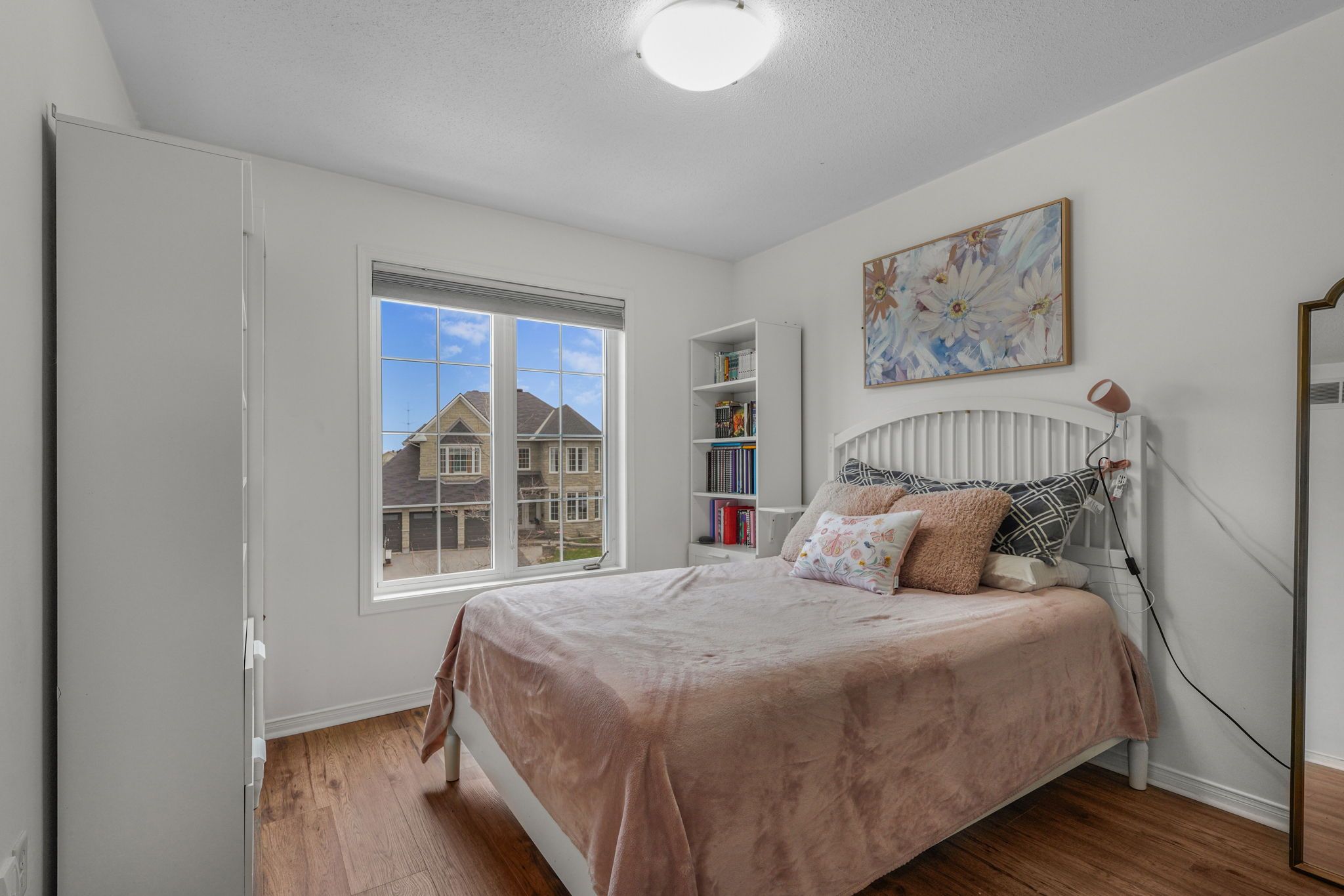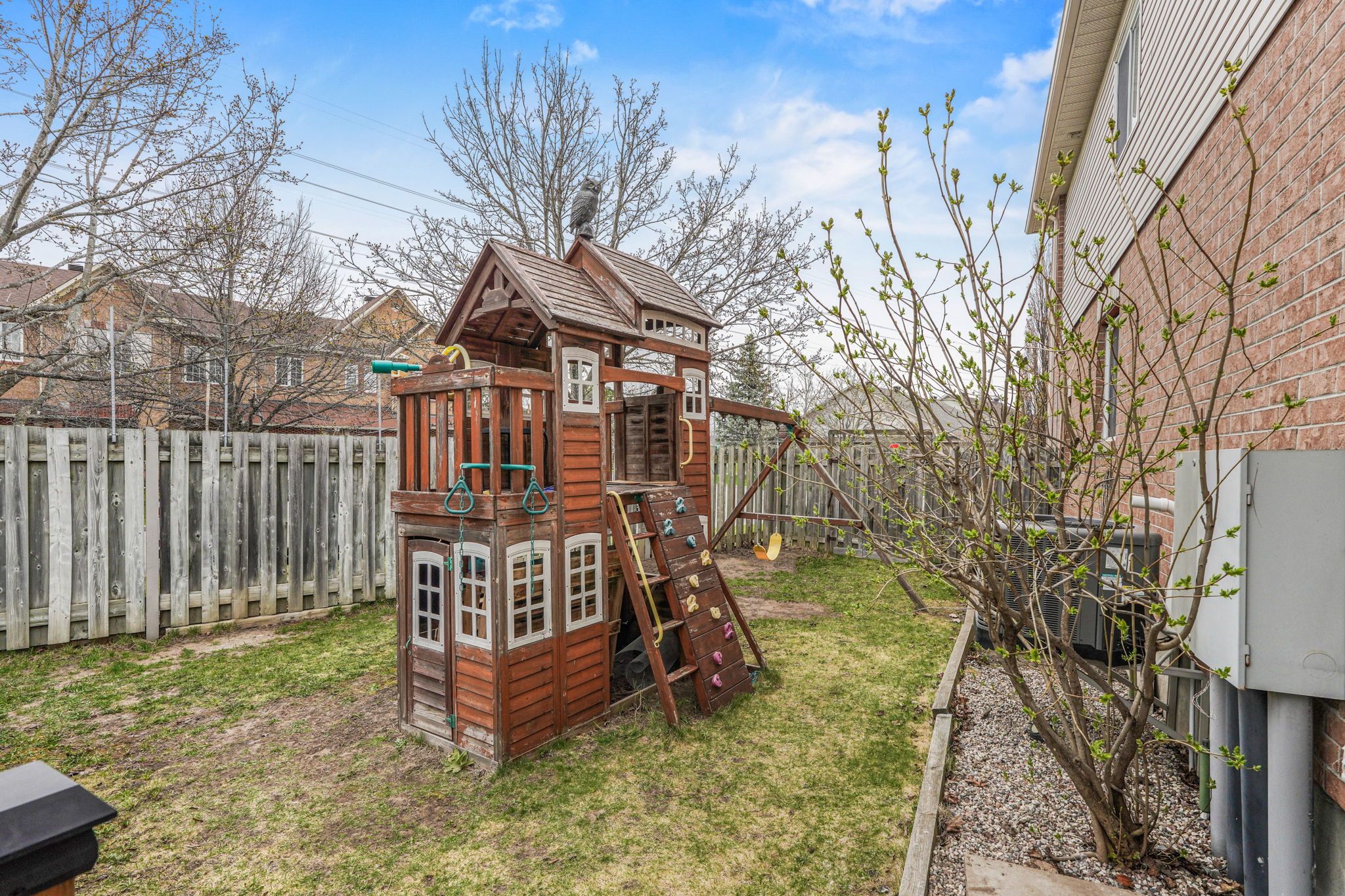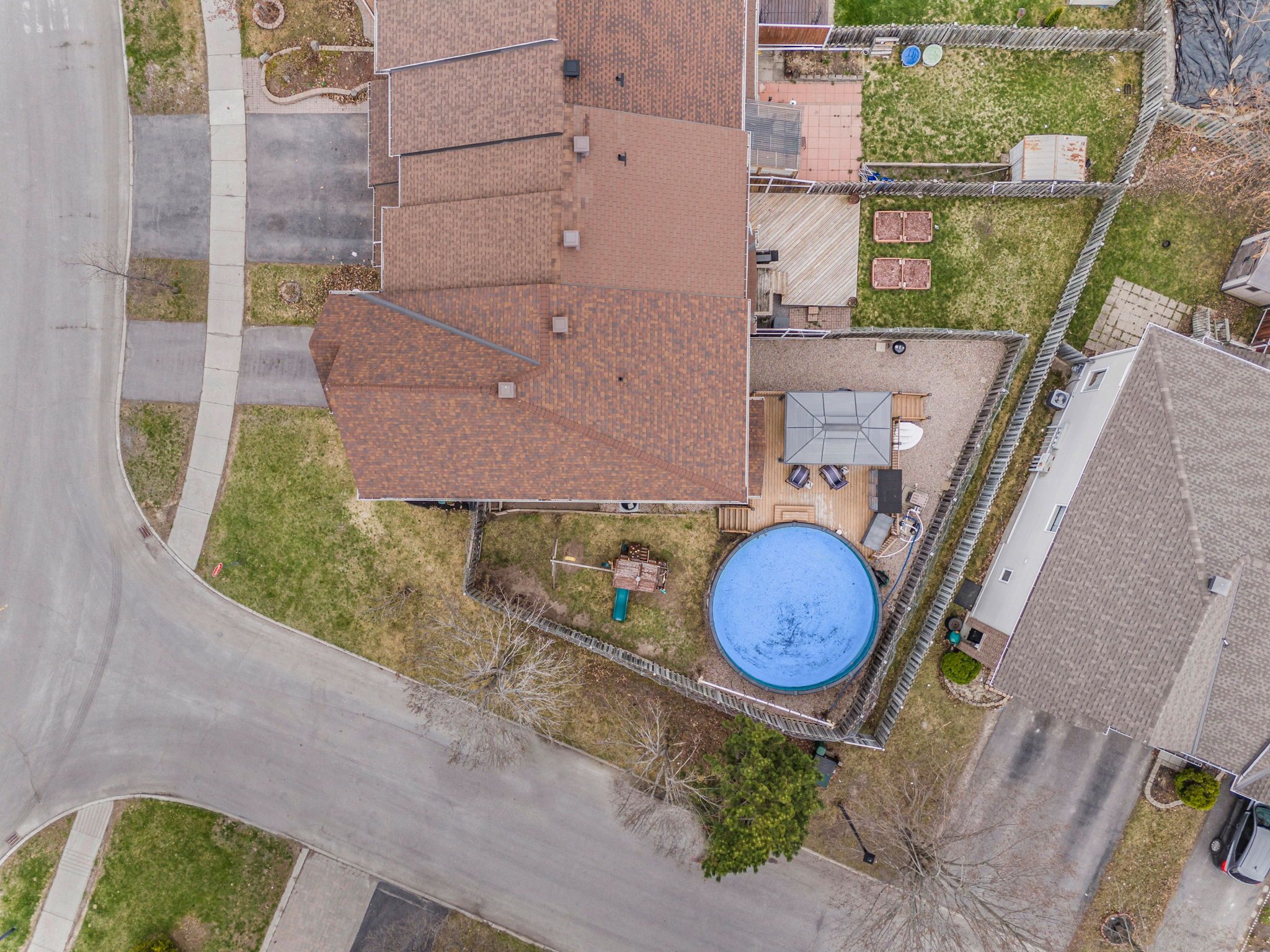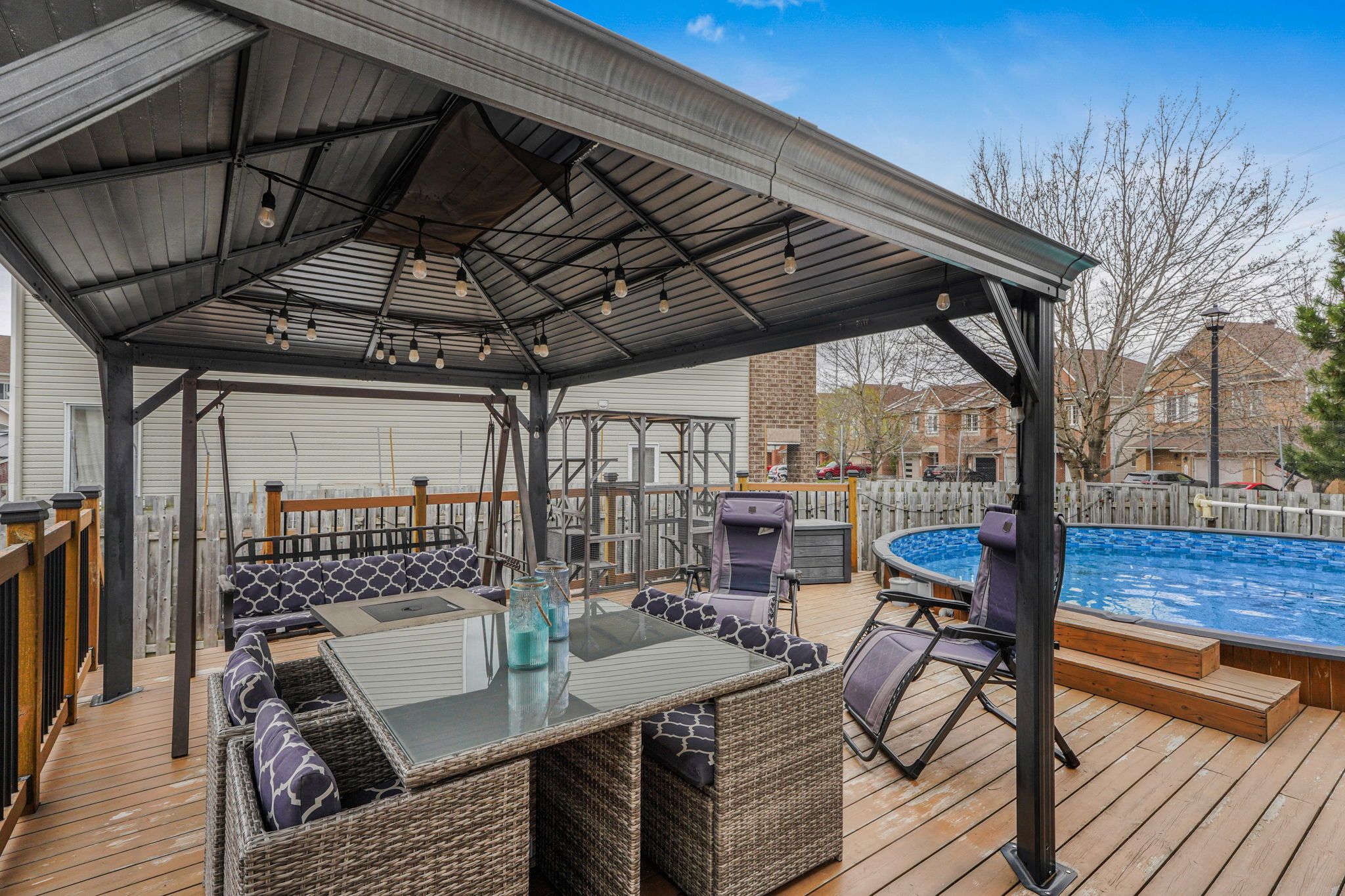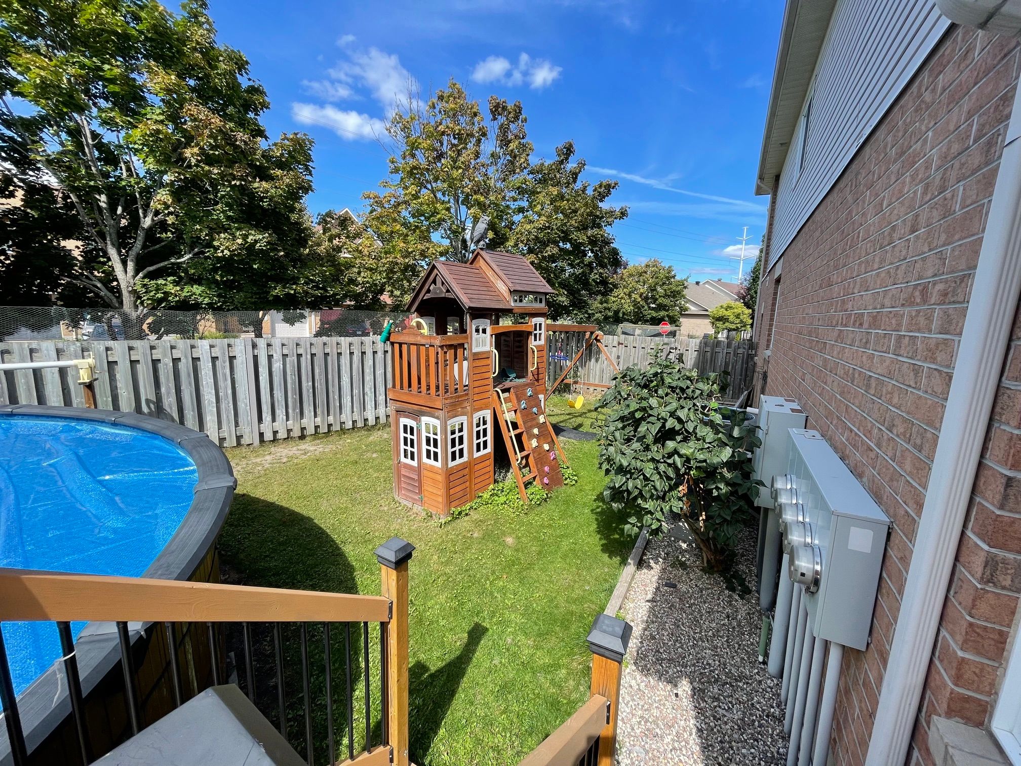 Welcome to this well-maintained end-unit home, set on a rare and expansive pie-shaped lot-offering incredible outdoor space and privacy. Perfect for entertaining, the fully fenced backyard features a pool, large deck, and side yard, creating the ultimate setting for summer gatherings and outdoor living. Inside, the main level offers a functional and inviting layout with laminate flooring throughout. The foyer includes a convenient built-in closet, while the bright dining room flows into a well-appointed galley-style kitchen complete with stainless steel appliances, quartz countertops, modern tile backsplash, breakfast bar, and ample storage. A comfortable living room and a stylish powder room complete the main floor. Upstairs, the spacious primary suite serves as a private retreat, featuring a walk-in closet and a 4-piece ensuite with a separate shower and relaxing soaker tub. Three additional bedrooms and a full 4-piece bathroom, including quartz vanity top, provide plenty of space for family or guests. The fully finished basement extends the living space with a large recreation room featuring a cozy fireplace, convenient laundry area, and plenty of storage. With its impressive lot, thoughtful layout, and move-in ready condition, this home is a fantastic opportunity in a desirable neighbourhood.