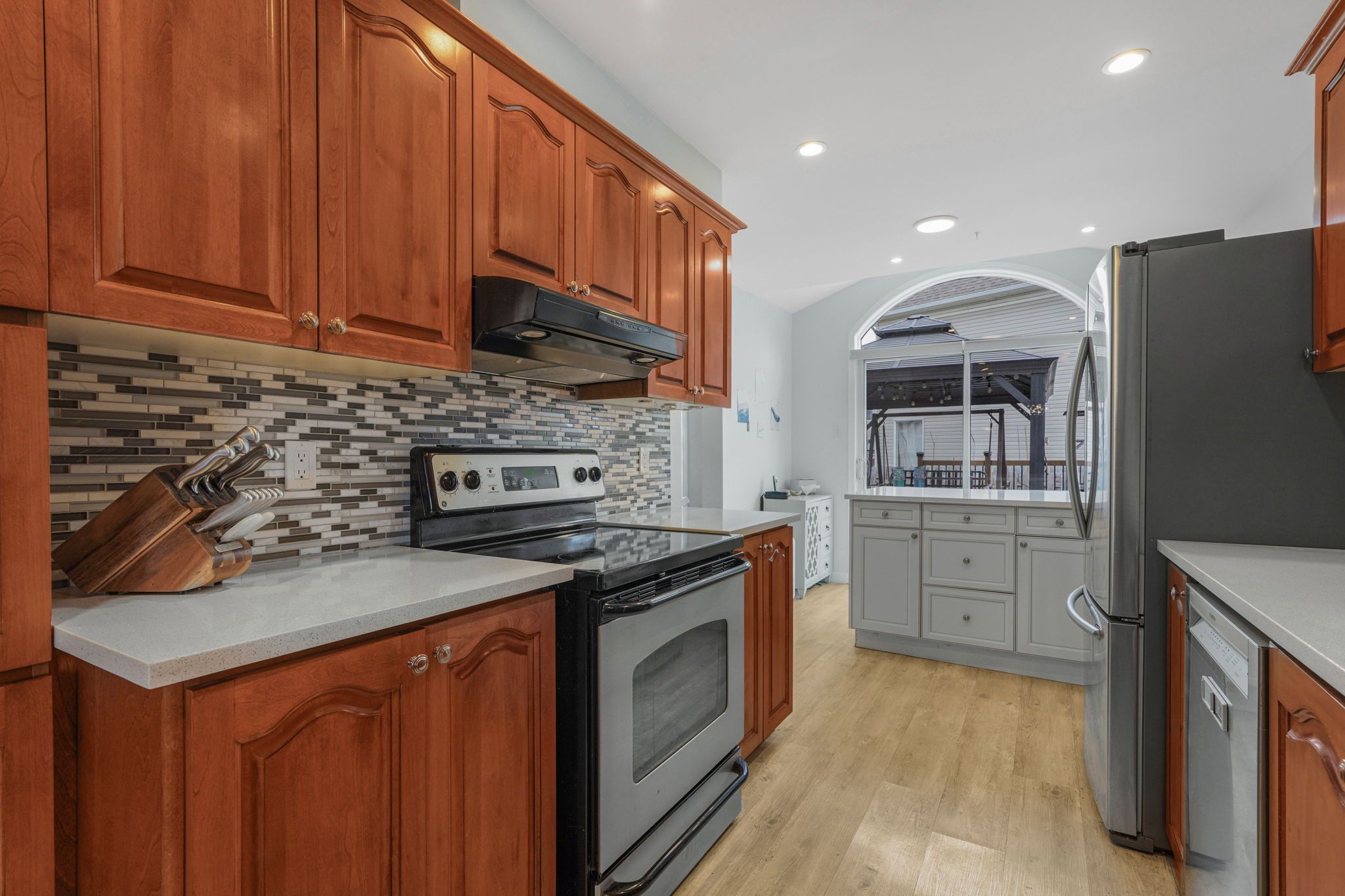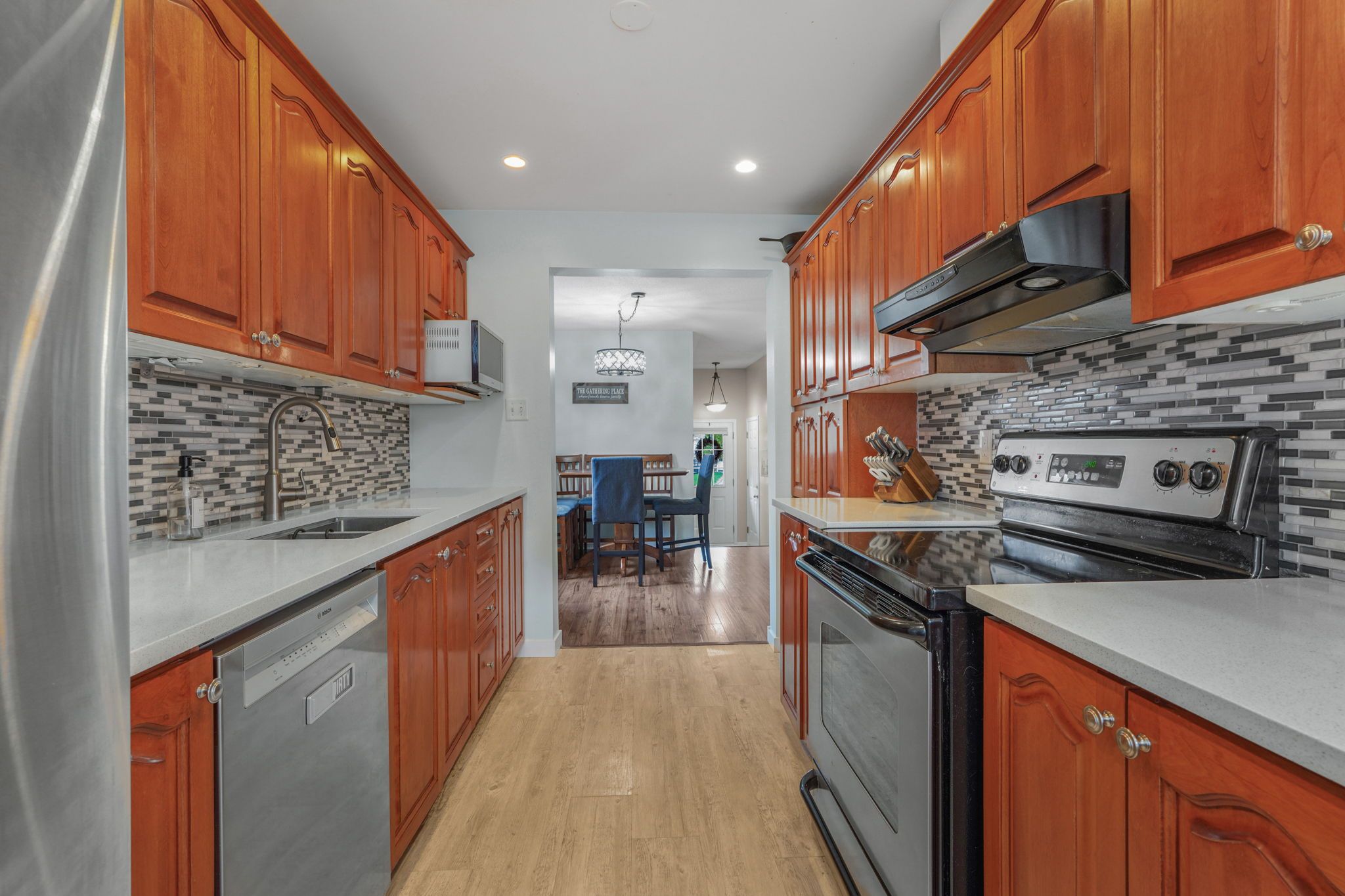 • Bright dining room flows into a modern galley kitchen with stainless steel appliances.