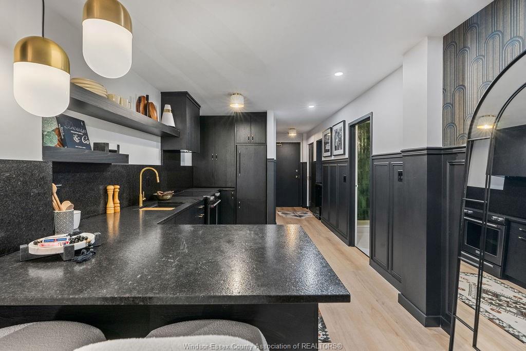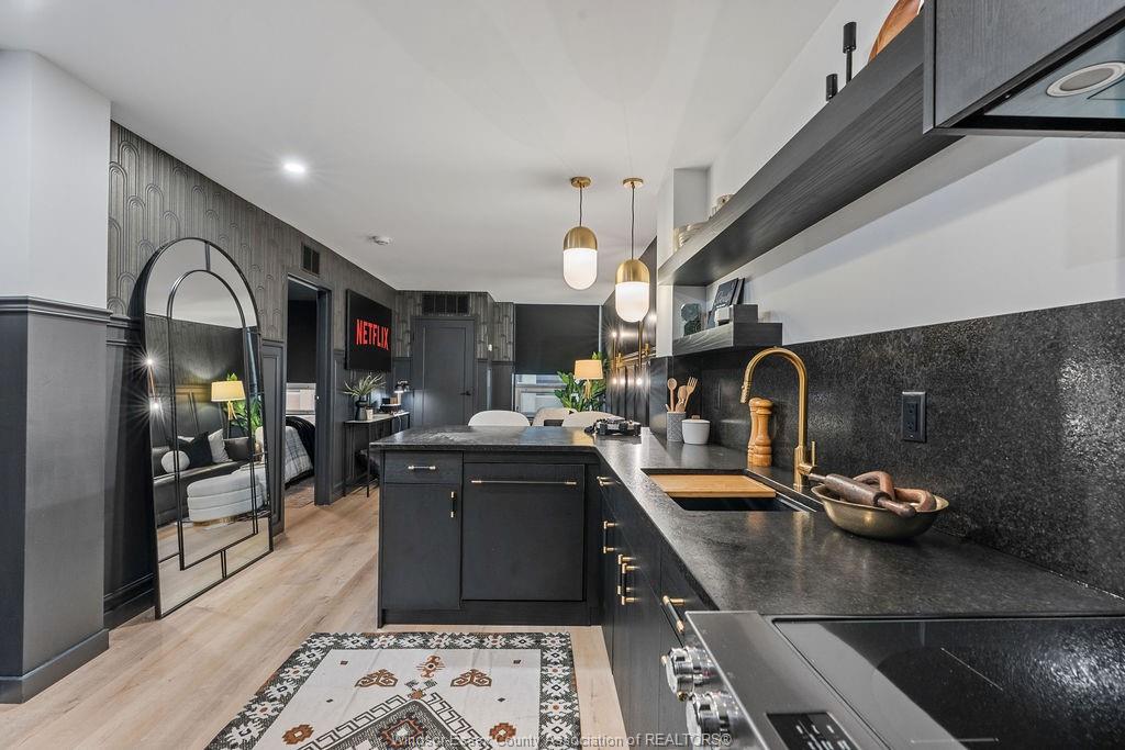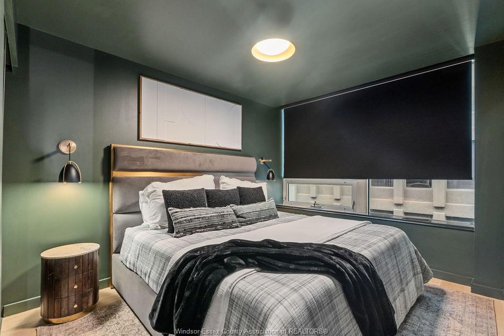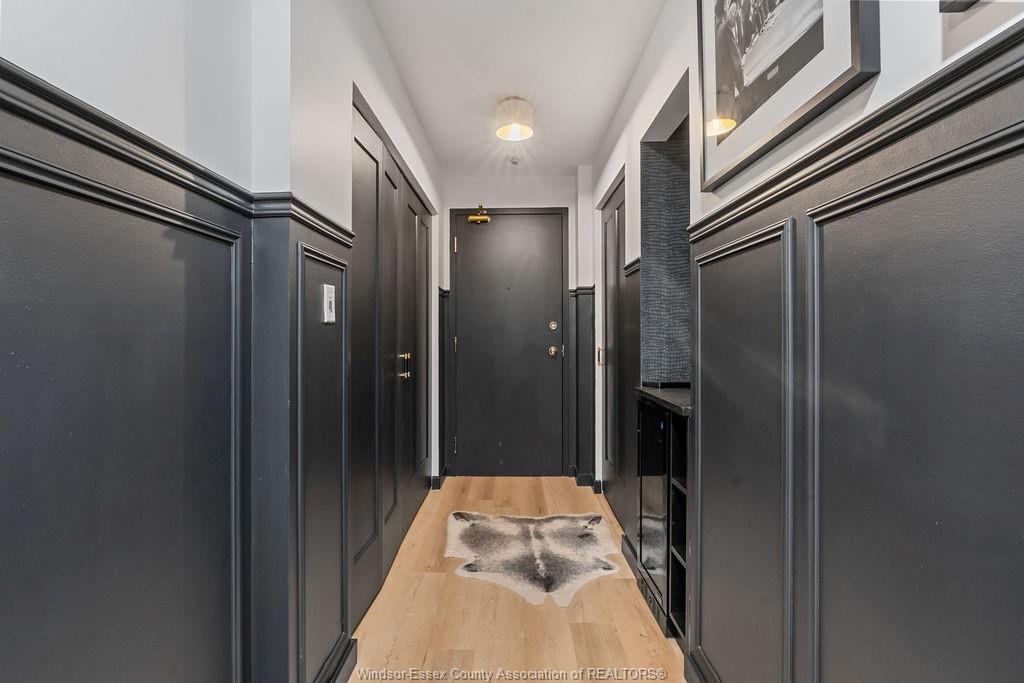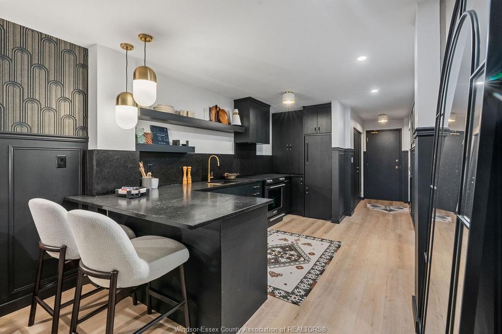 Step into a beautifully reimagined 1 bed, 1 bath condo where every detail has been thoughtfully curated. This fully renovated unit blends a dark, moody aesthetic with elevated finishes from ceiling to floor. Light engineered hardwood flows throughout, creating a striking contrast against rich tones, while custom wainscoting and designer sconces set a warm, sophisticated ambiance. The kitchen features high-end appliances and a stylish bar nook complete with a bar fridge—perfect for displaying your favourite whisky and books. Enjoy the added convenience and security of underground parking, plus the bonus of an owned hot water tank. Ideally located just moments from the tunnel and bridge, offering effortless access to the u. S. This unit can also be purchased fully furnished, offering a seamless turnkey opportunity. Whether you're a first-time buyer with an eye for design, an investor seeking a standout property, or a downsizer looking for refined living, this condo delivers. A truly unique space that must be seen to be fully appreciated.
