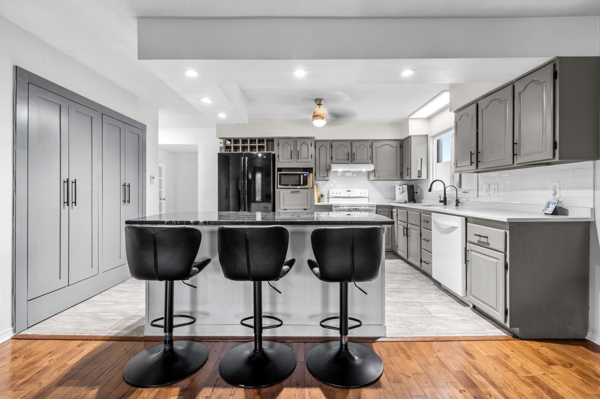 • Open concept kitchen features a large island and granite counters.