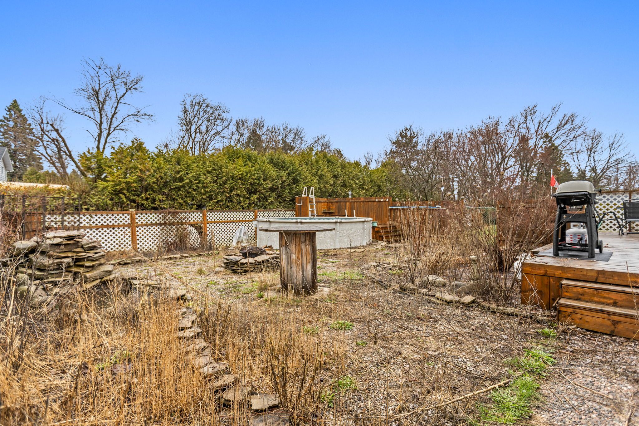 • Well-designed backyard with a pool, flagstone walkways, and separate pet area.