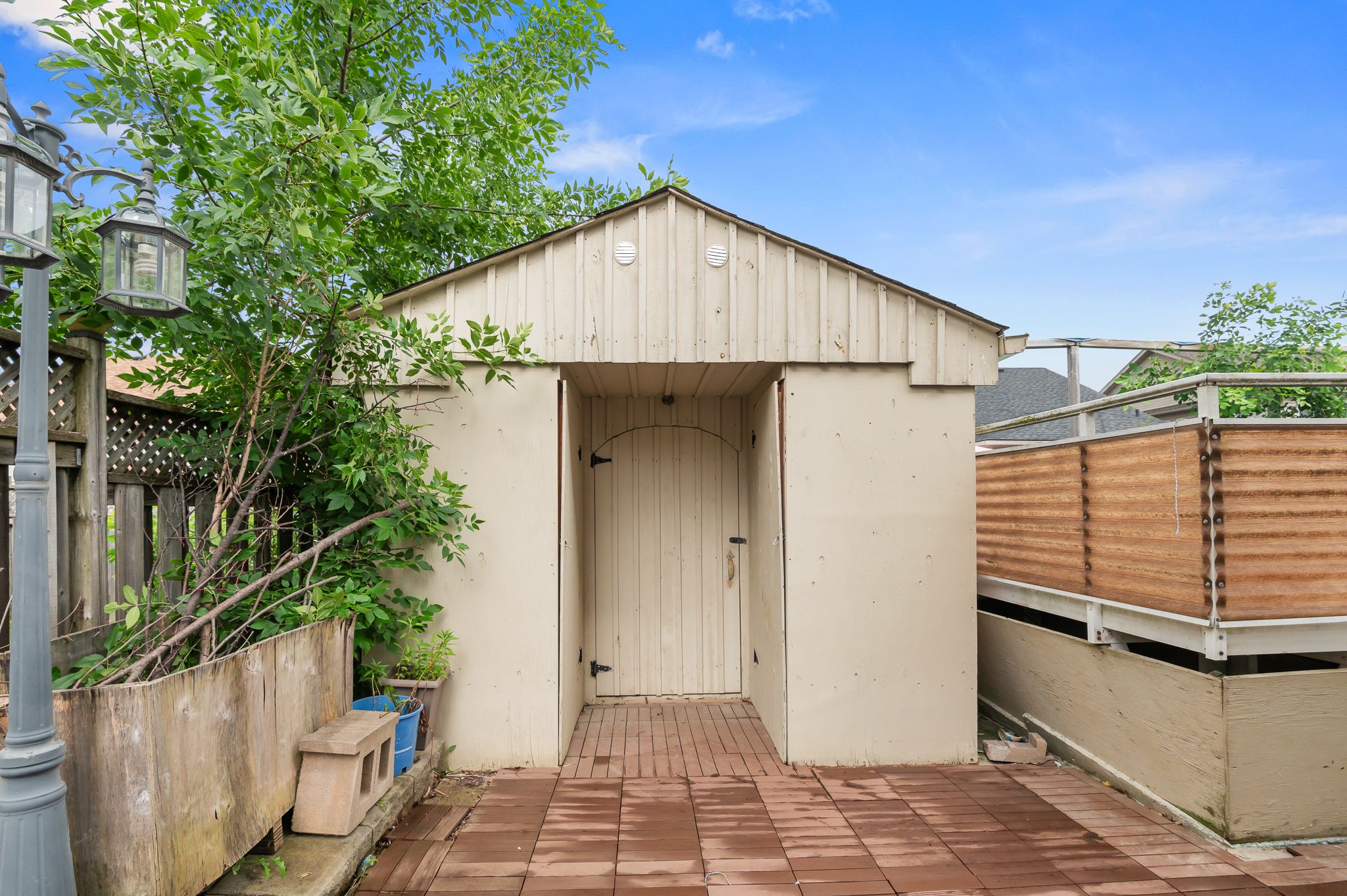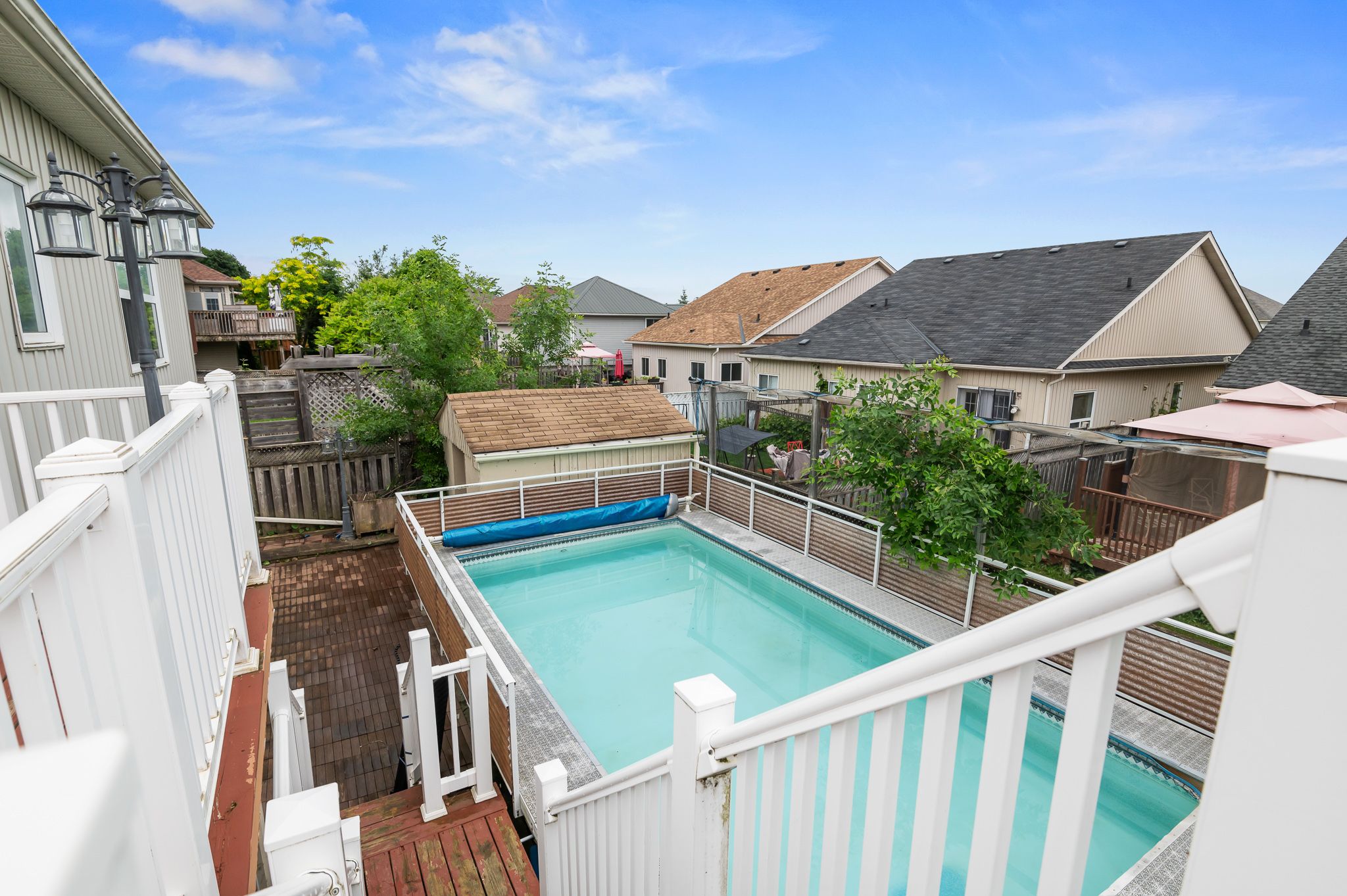 • Large backyard with an above-ground pool, patio, and second-story deck.