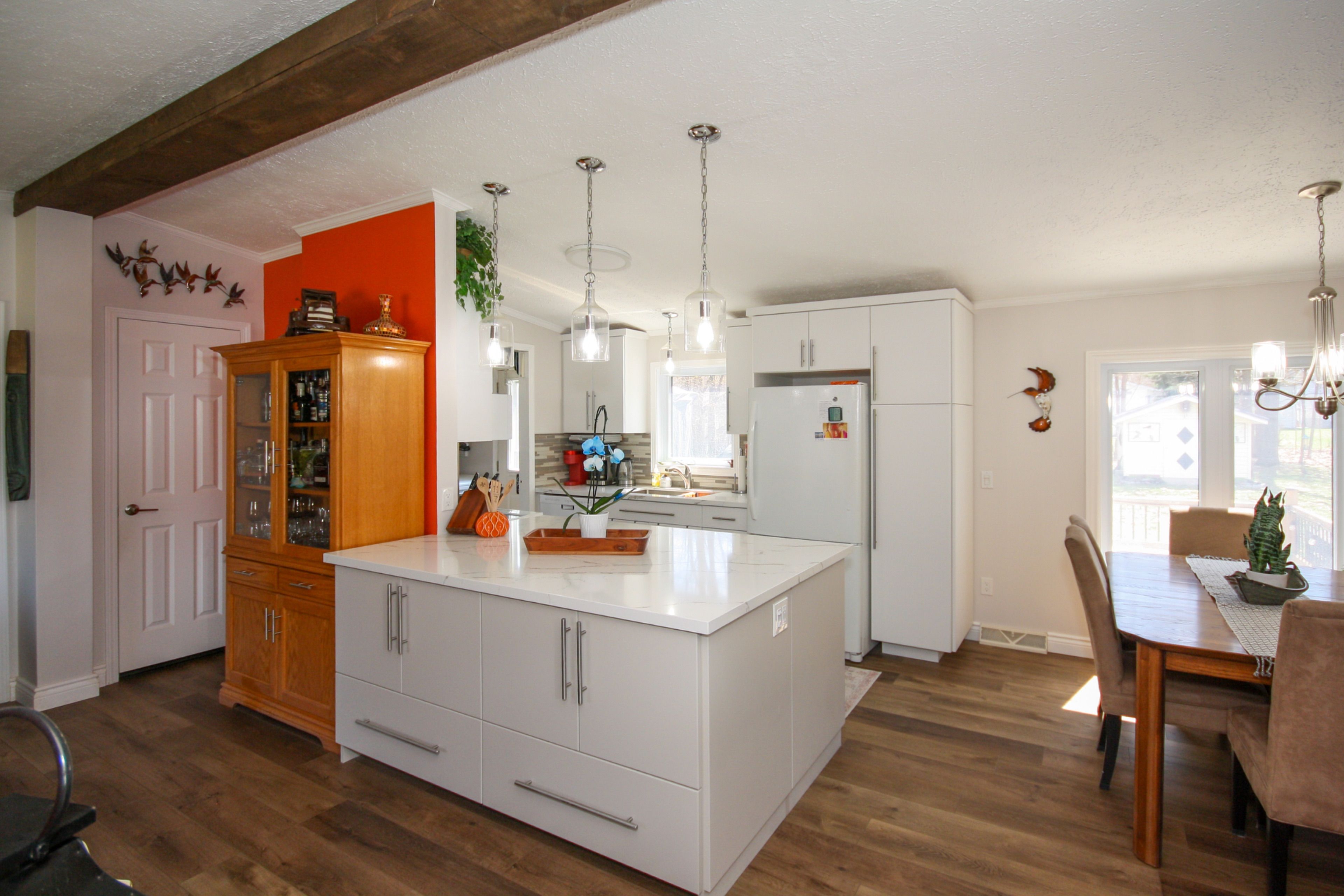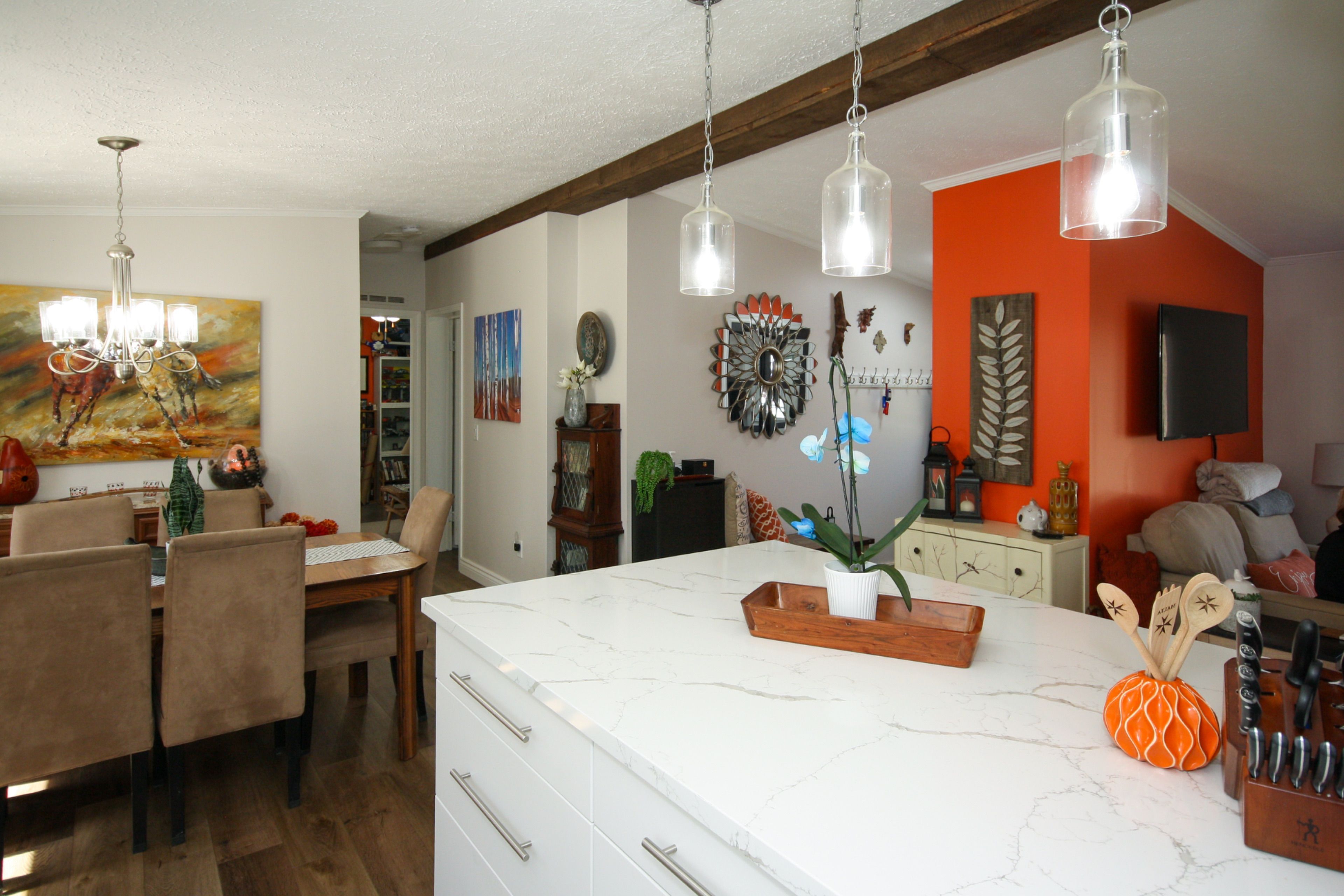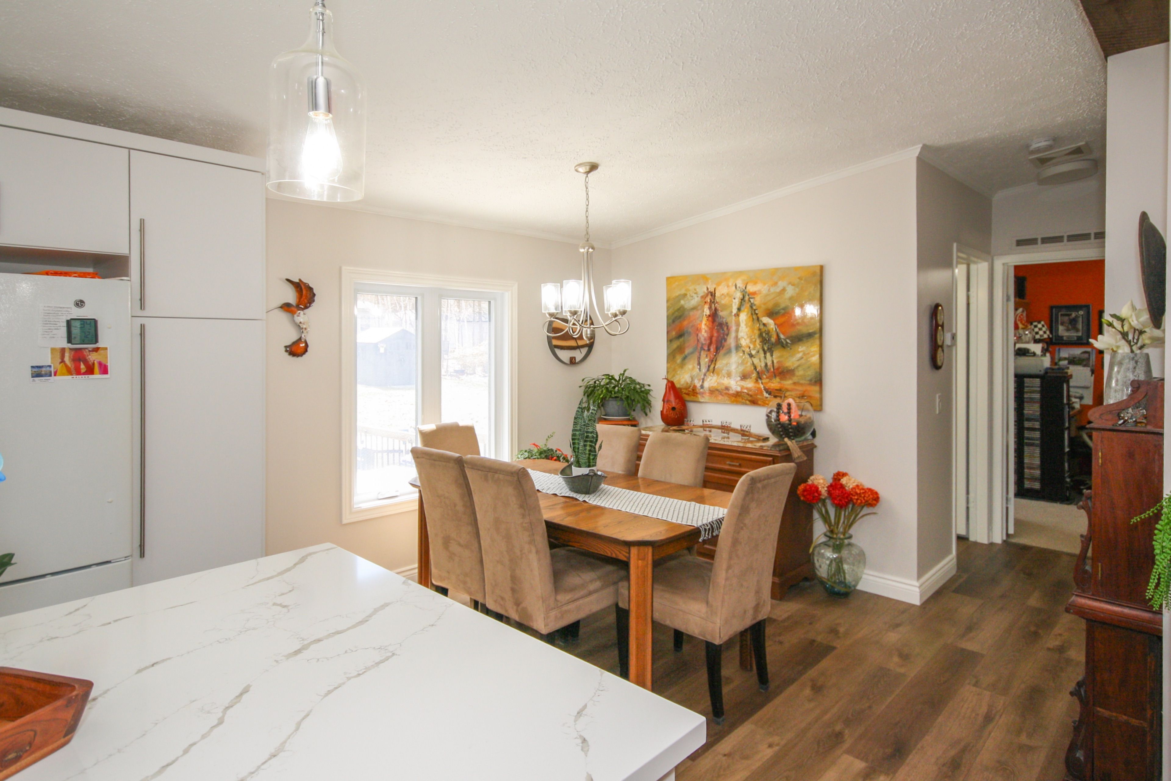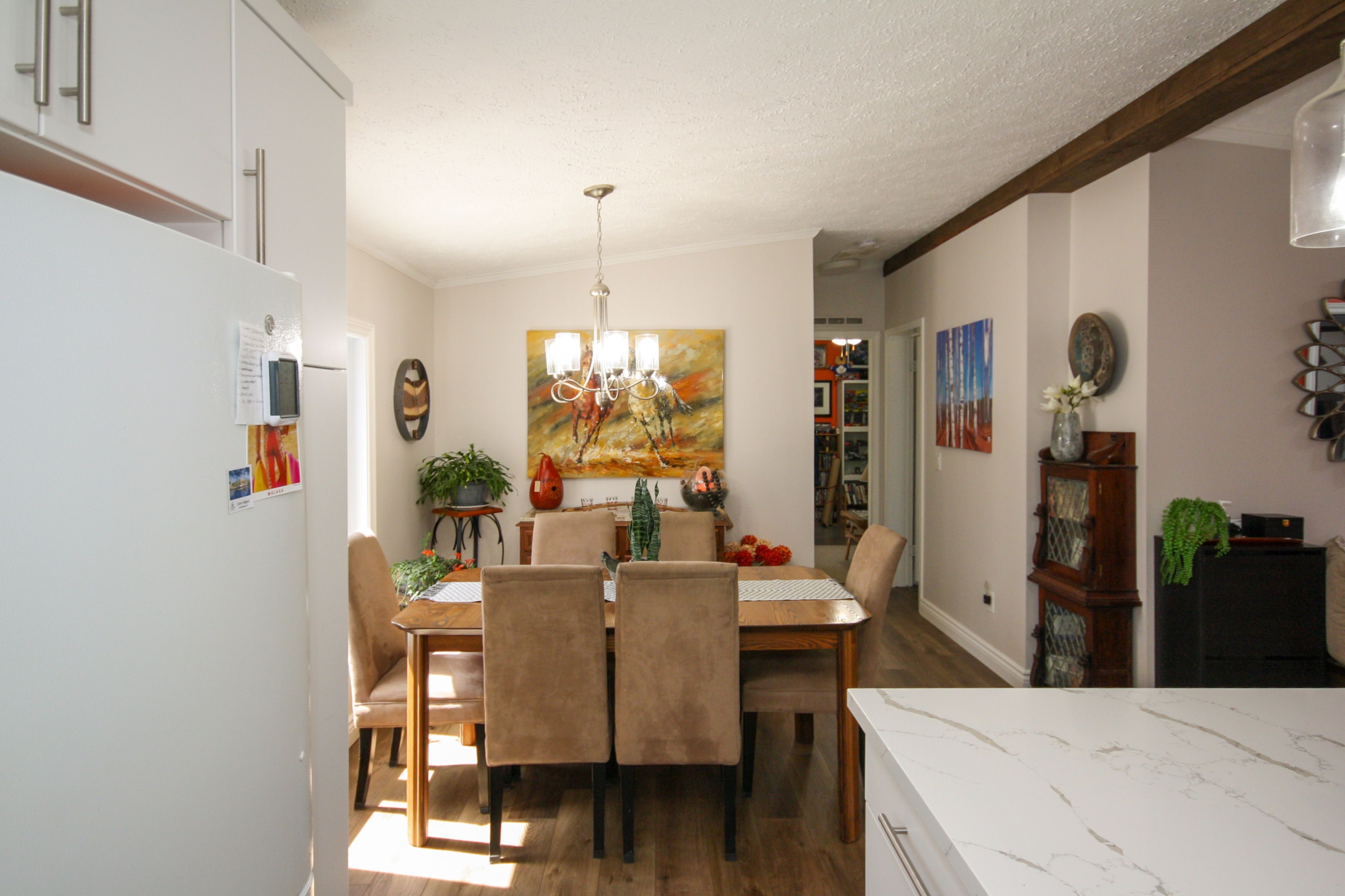 • Modern kitchen with quartz countertops and updated appliances.