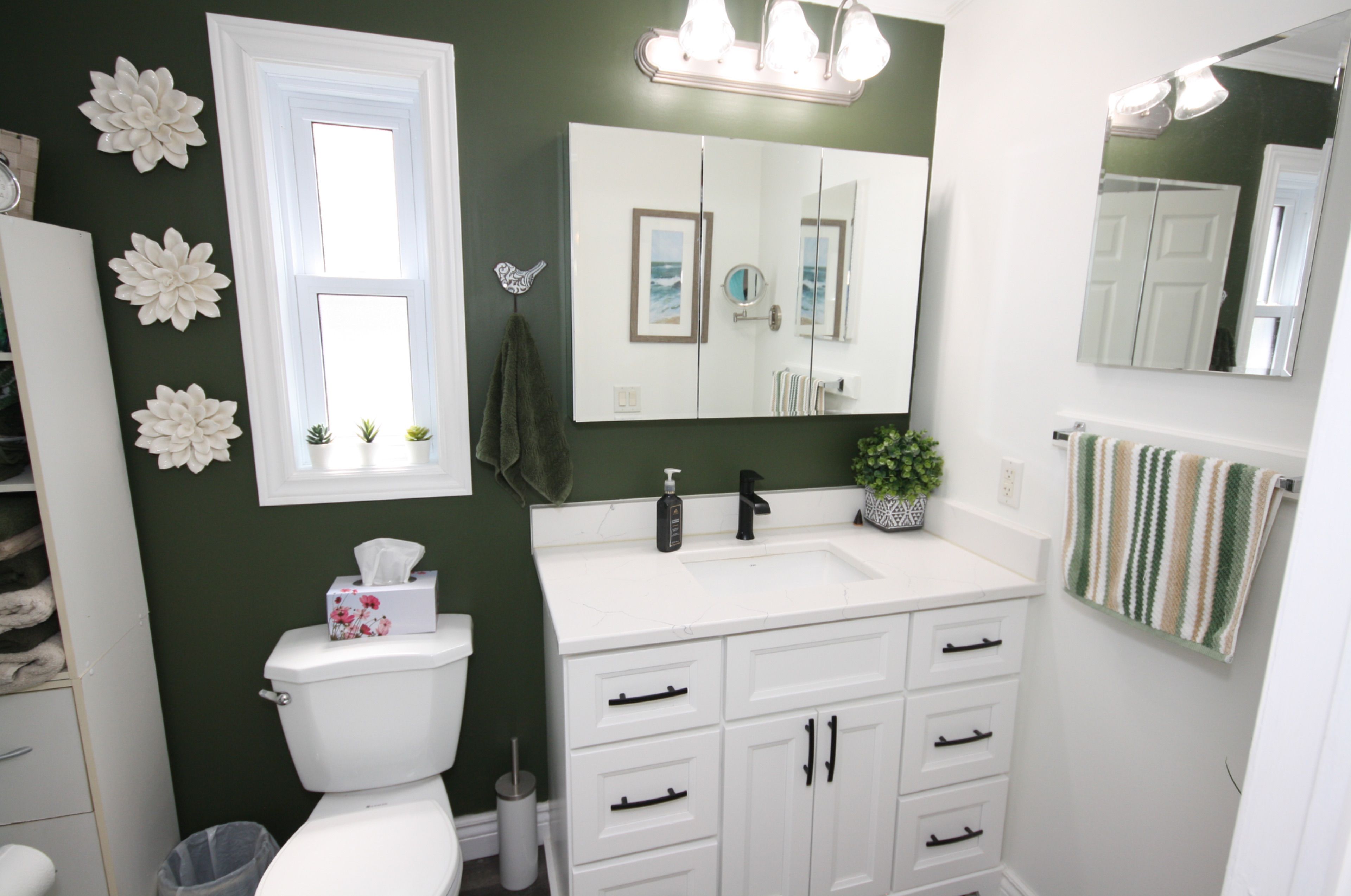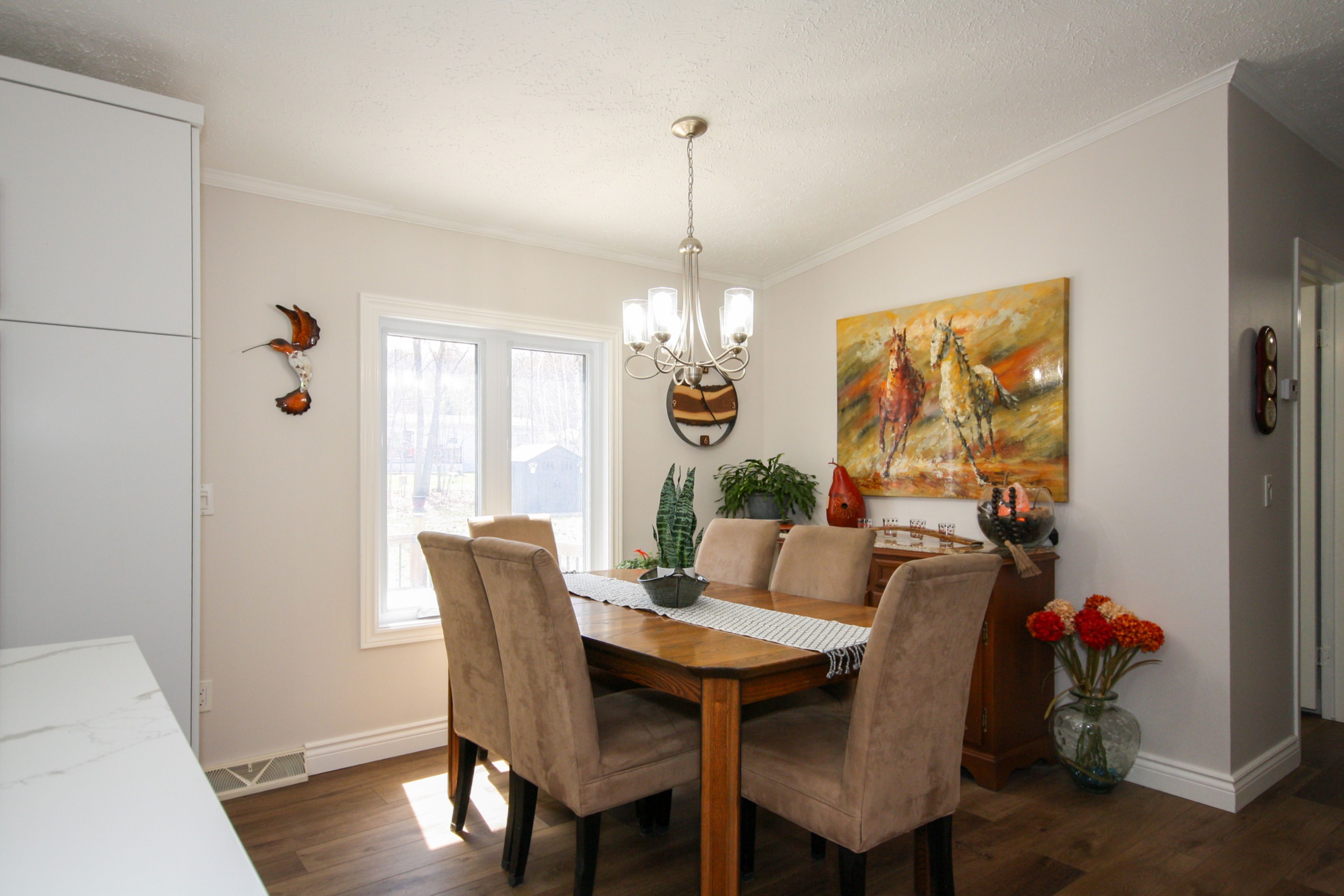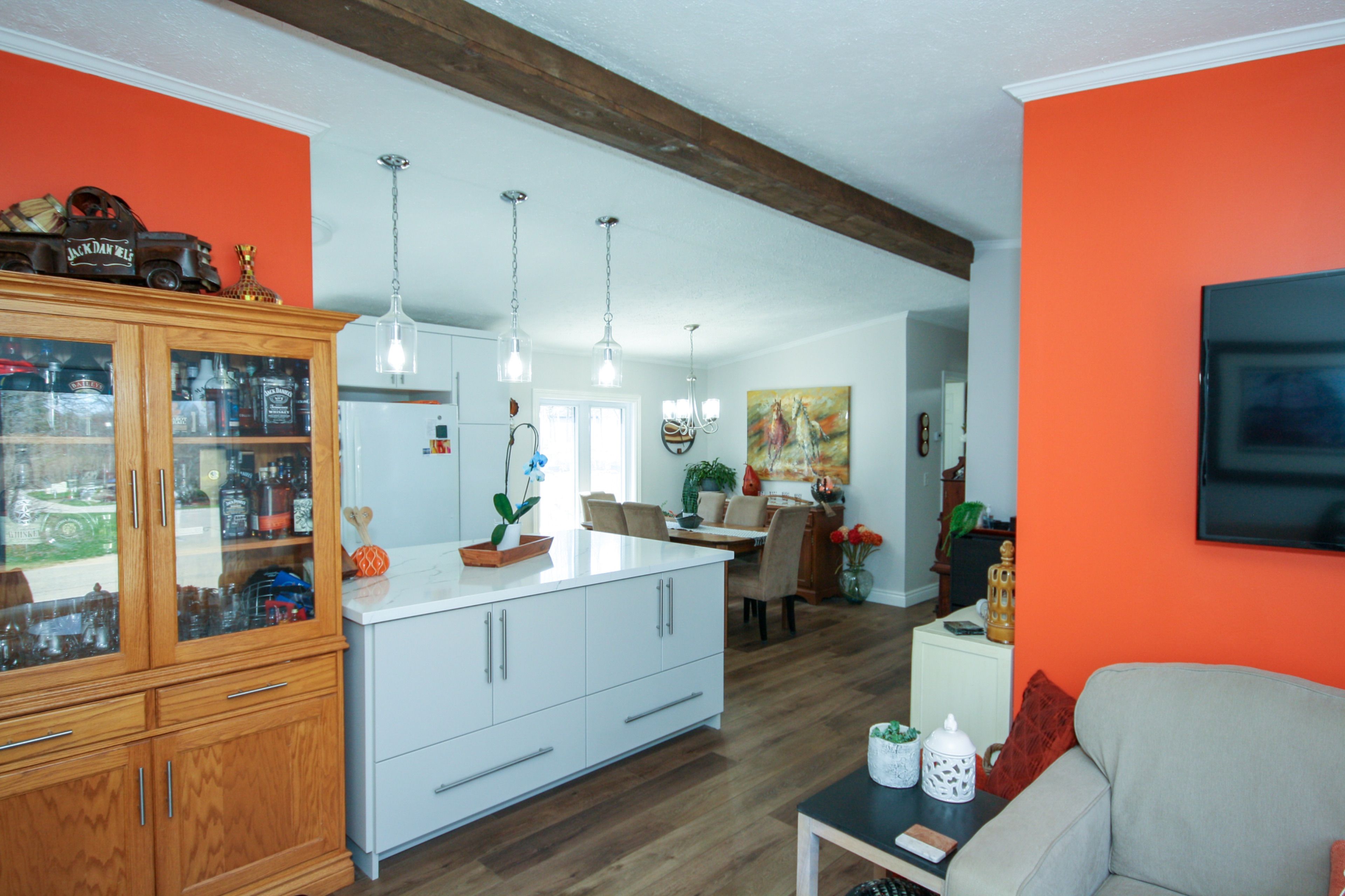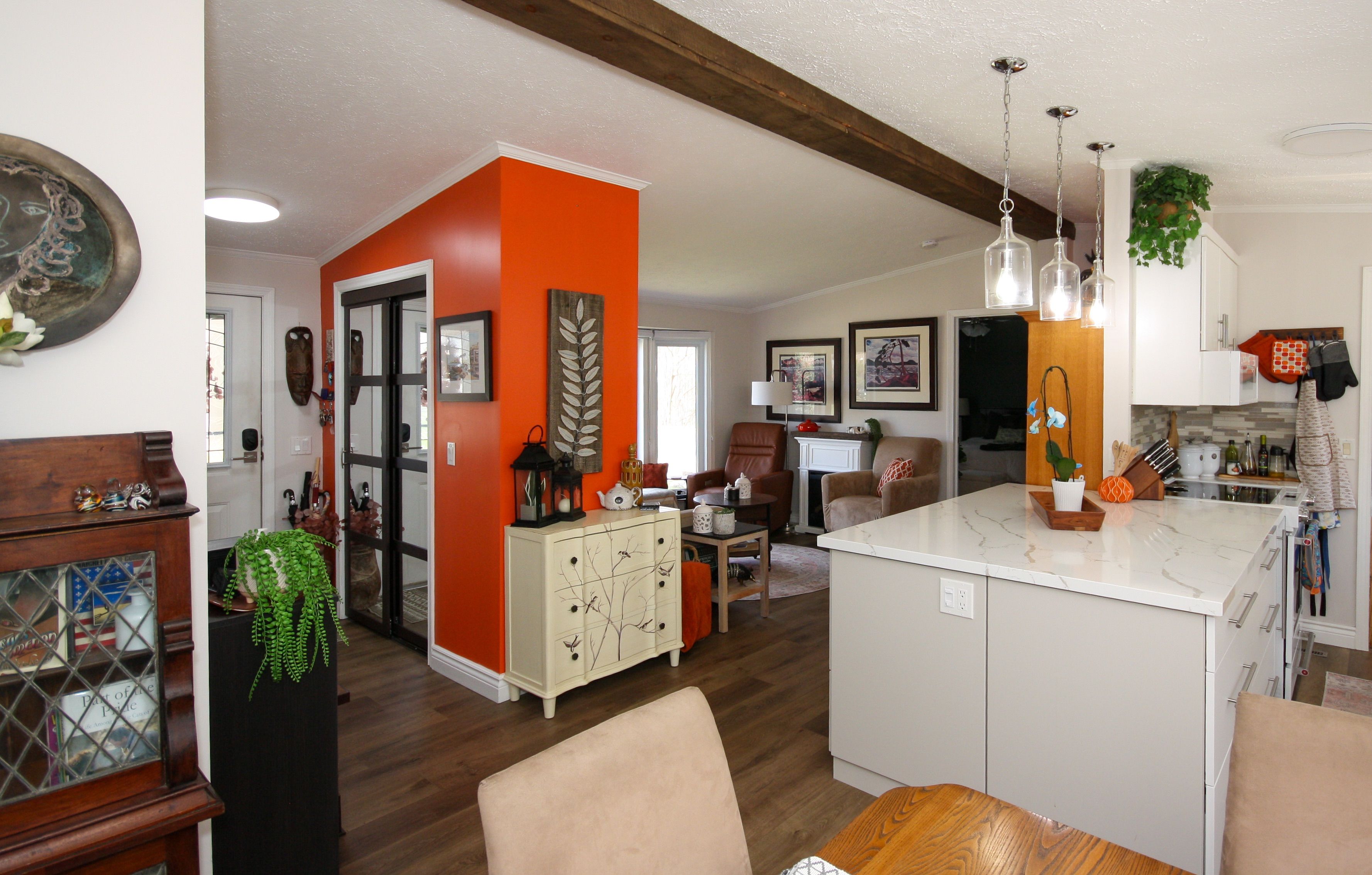 • Modern kitchen with quartz countertops and updated appliances.