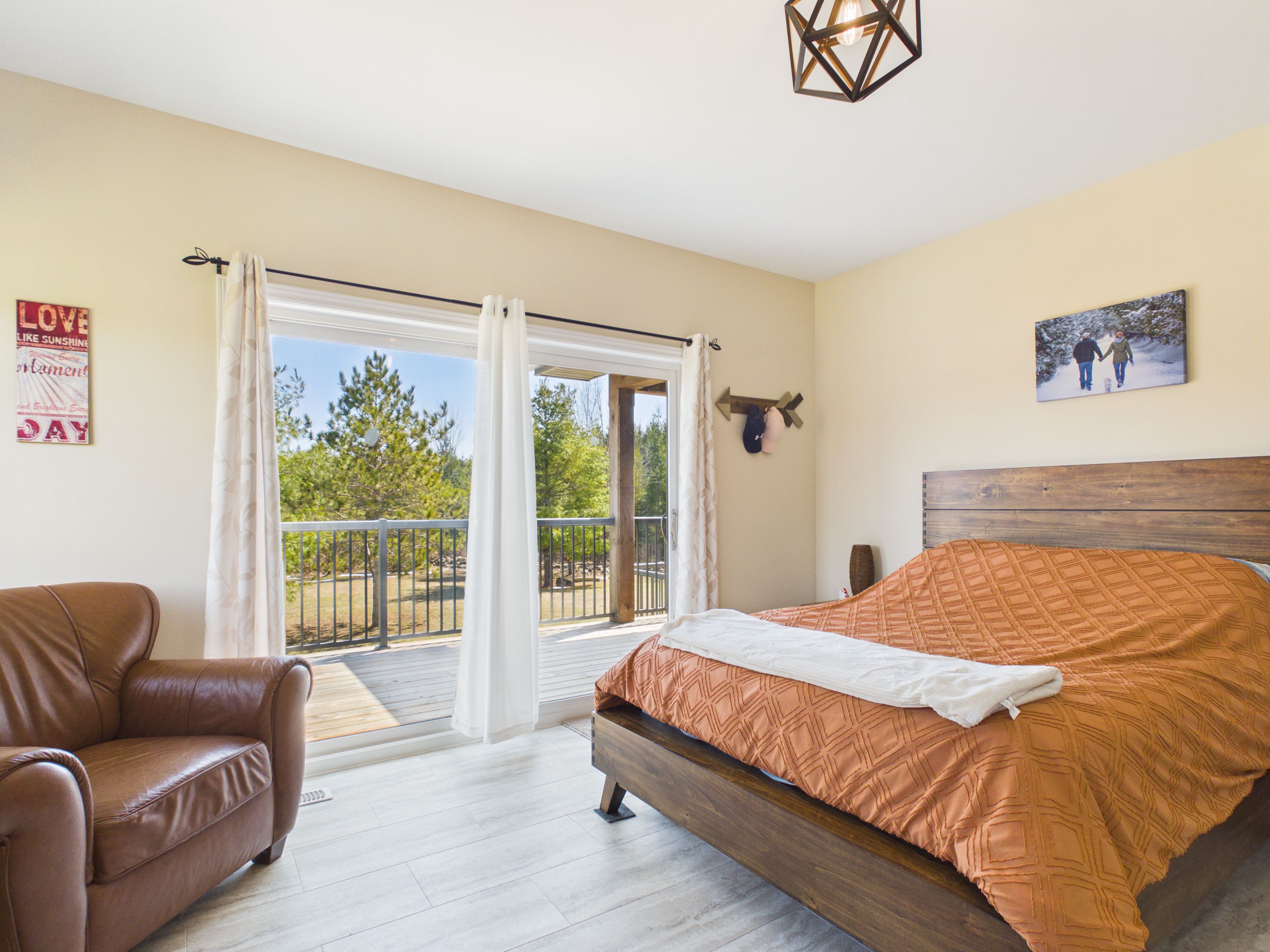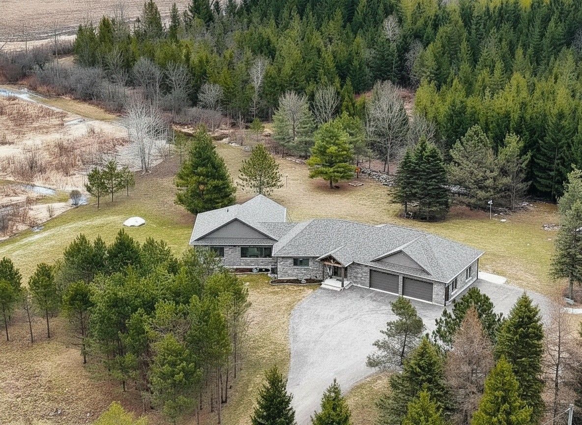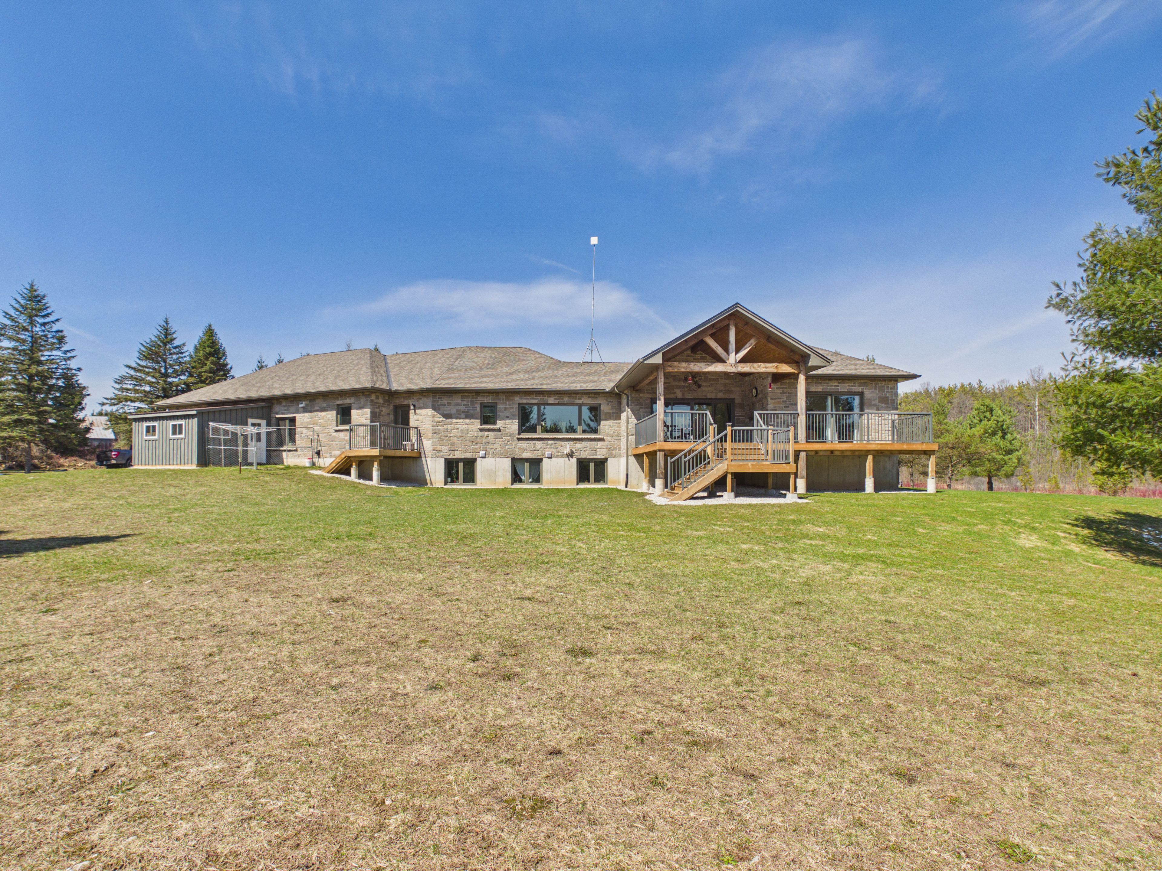 Tucked at the end of a winding lane, this custom-built 2022 shouldice stone bungalow offers the perfect blend of privacy, elegance, and nature. Set on fifty mostly treed acres, including twenty acres of planted pines, ten acres of hardwood bush separated by deer creek, this property is a scenic haven for outdoor enthusiasts. Step inside to a welcoming foyer and bright open-concept main floor, with oversize windows framing the natural surroundings. Or enjoy the landscape from the generous covered timber frame deck. The main floor primary bedroom offers a 4 pc. Ensuite, expansive walk-in closet, and private deck access. A 2 pc. Powder room and laundry room complete this level. The 9 ft. Ceilings on the lower level enhance the sense of openness and space. Features include an open concept second kitchen and living room, with large windows to let in the sunshine and a heat pump to regulate temperatures. A comfortable bedroom and 3 pc. Bath, utility room with additional laundry facilities makes this level in-law friendly and can be accessed by a separate entrance through the garage. A second bedroom is a bonus on this floor, as is the abundance of storage space. The heated double garage is finished with trusscore and has its own heat exchanger keeping vehicles and floors dry in winter months. The adjacent dog grooming room (also finished with trusscore) is a moveable shed! House is heated by f/a propane, has central air, air exchanger, and generator. Several charming outbuildings complete this property making it a hobbyist paradise! They include a workshop, storage shed, and an adorable bunky with covered porch and loft. Raised garden beds are convenient and when you're not trail hiking, engage in a friendly game of horseshoes! Indulge in the serenity of country living while being a short drive from hanover, walkerton, and chesley. This property is truly a rare combination of luxury, functionality, and natural beauty.