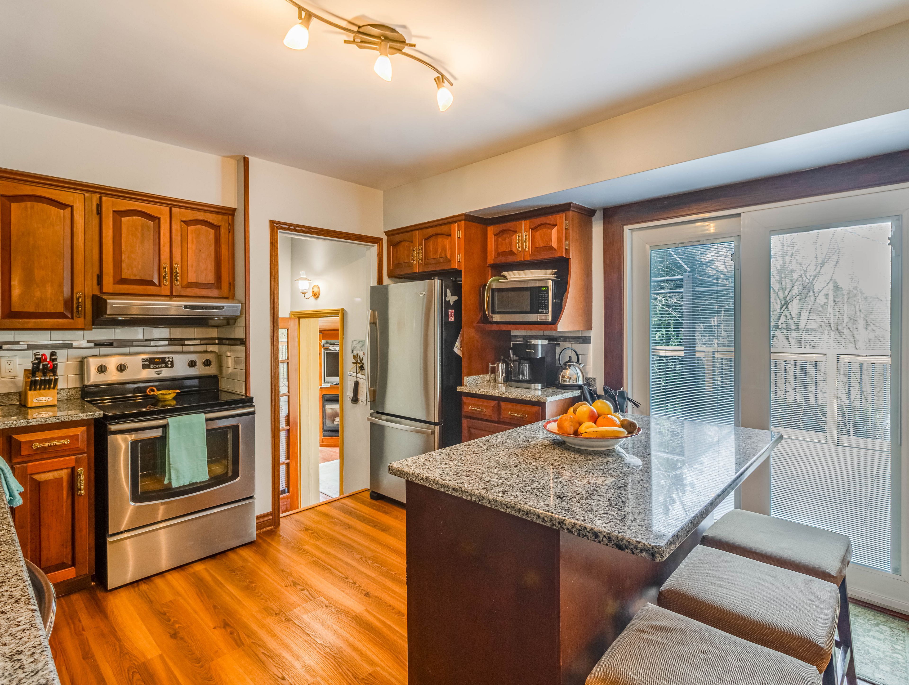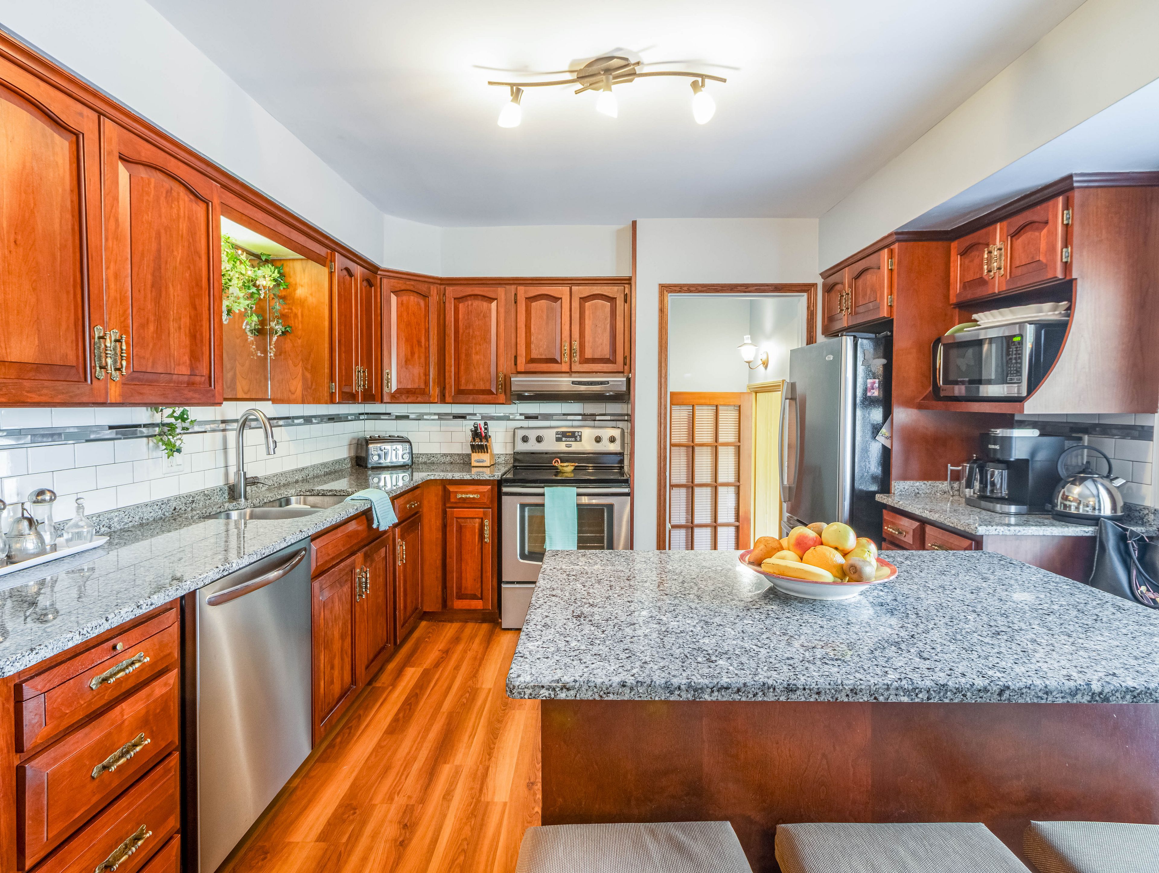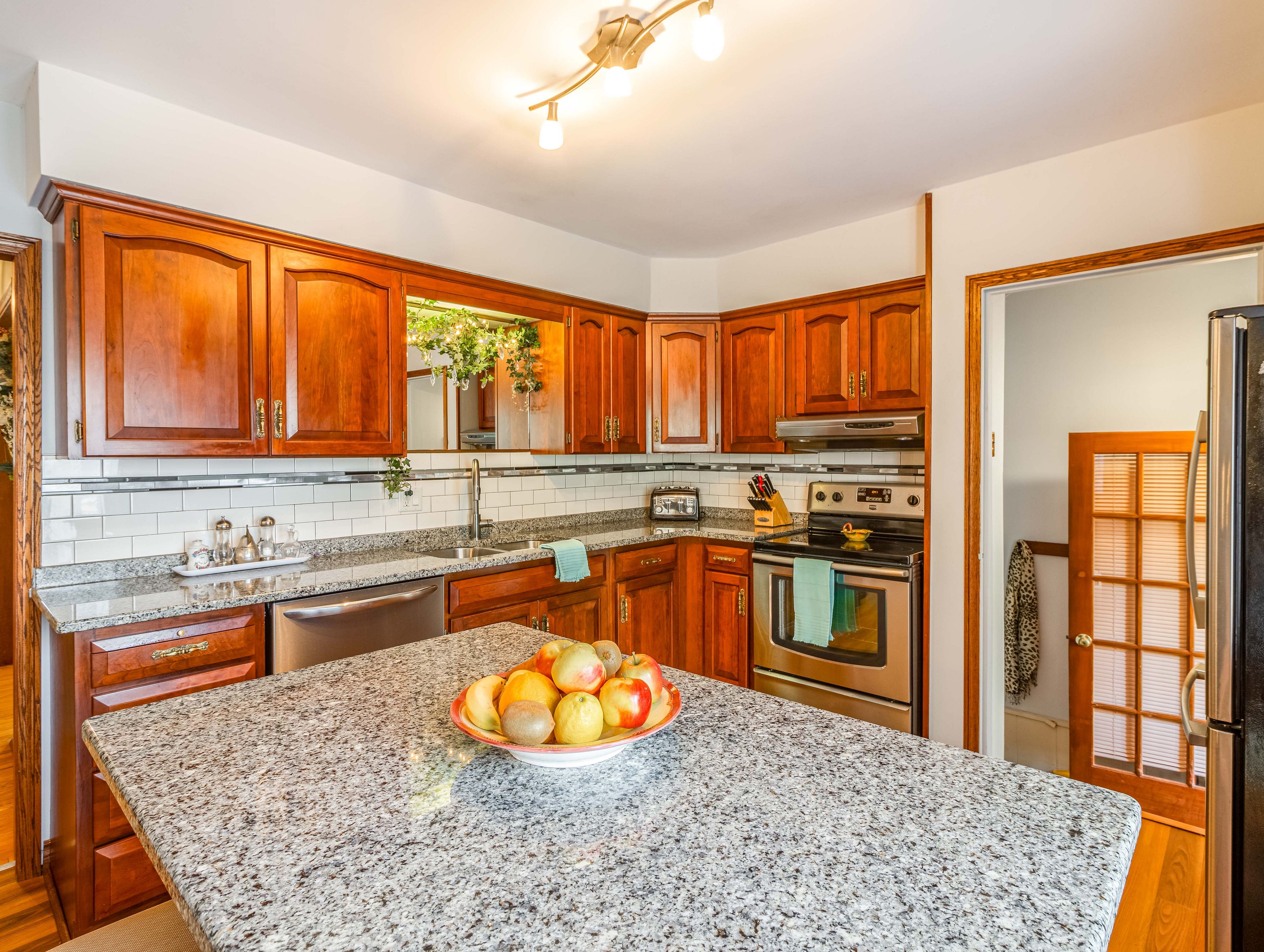 • Updated kitchen features modern finishes, granite counters, and stainless steel appliances.