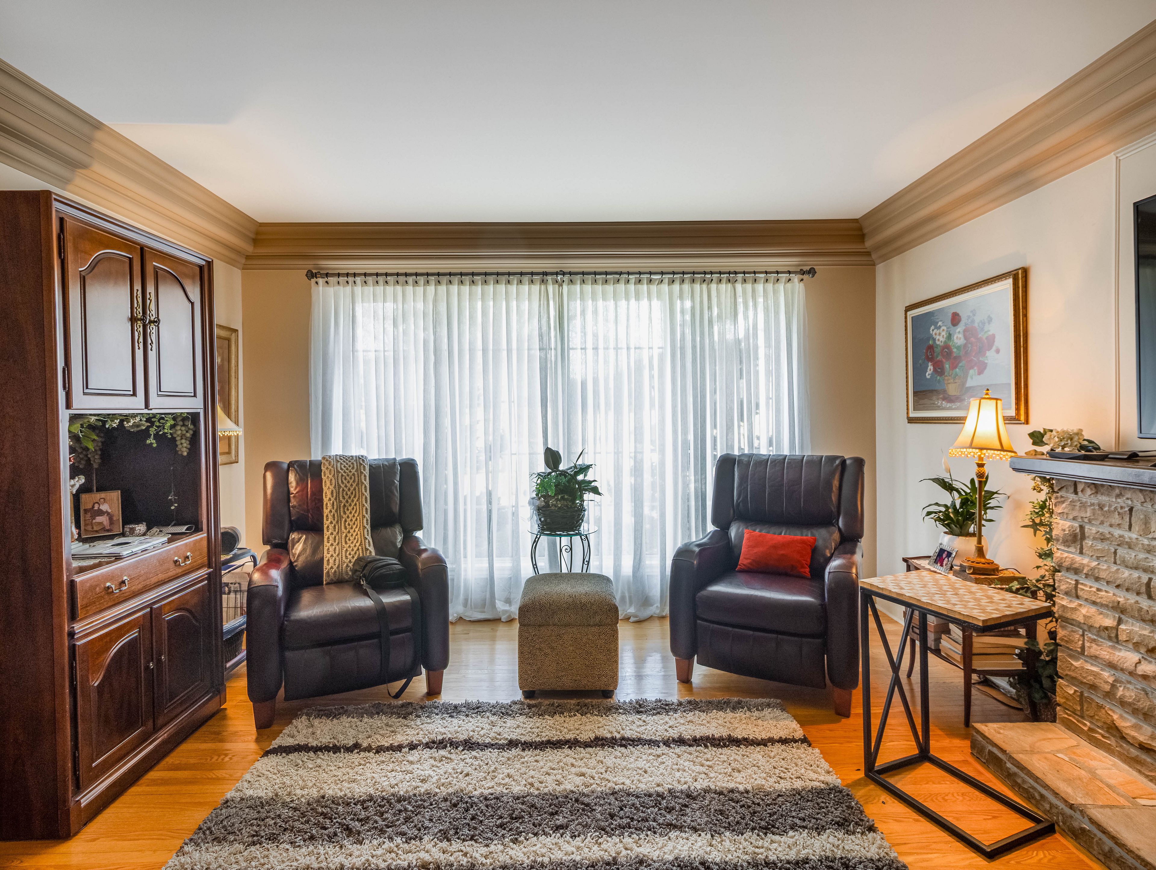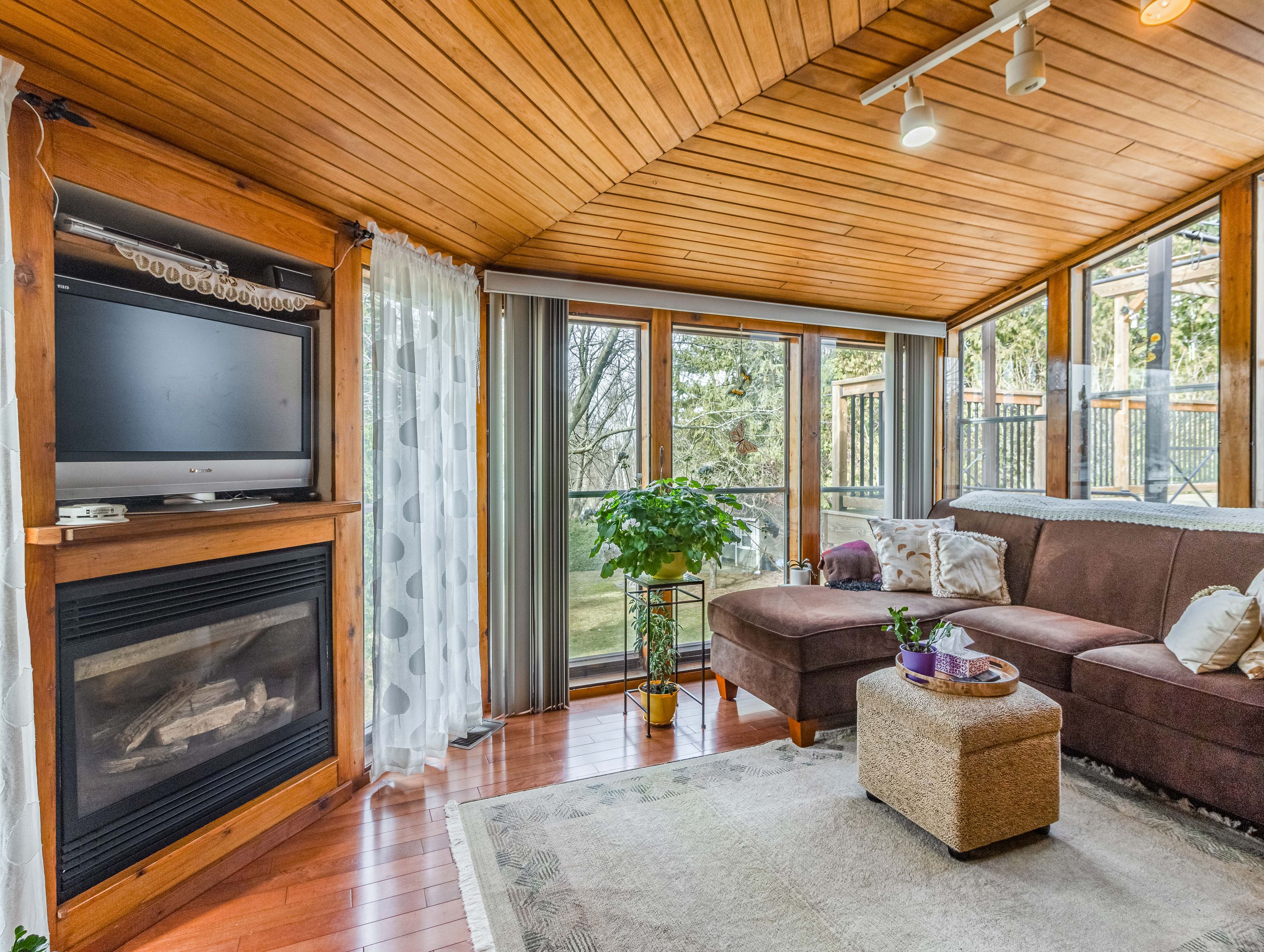• Bright sunroom with gas fireplace for a cozy retreat overlooking greenspace.