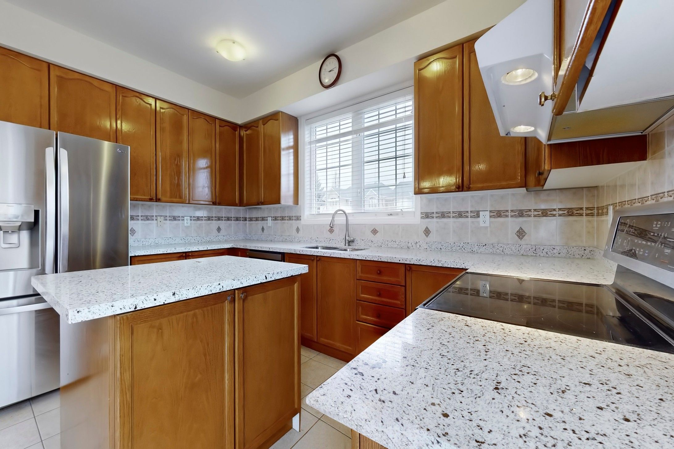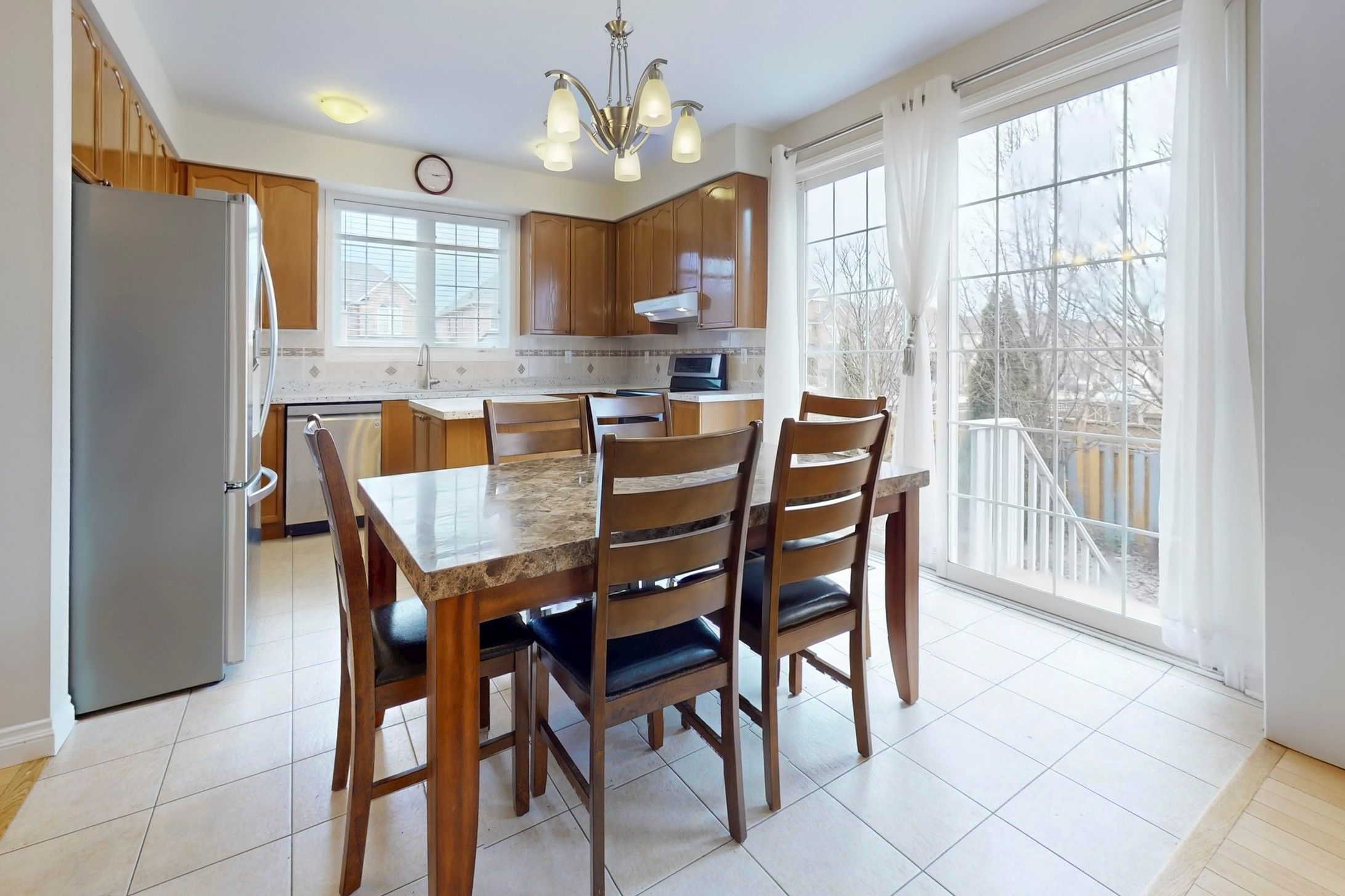 • Bright kitchen overlooking the family room with a cozy gas fireplace.
