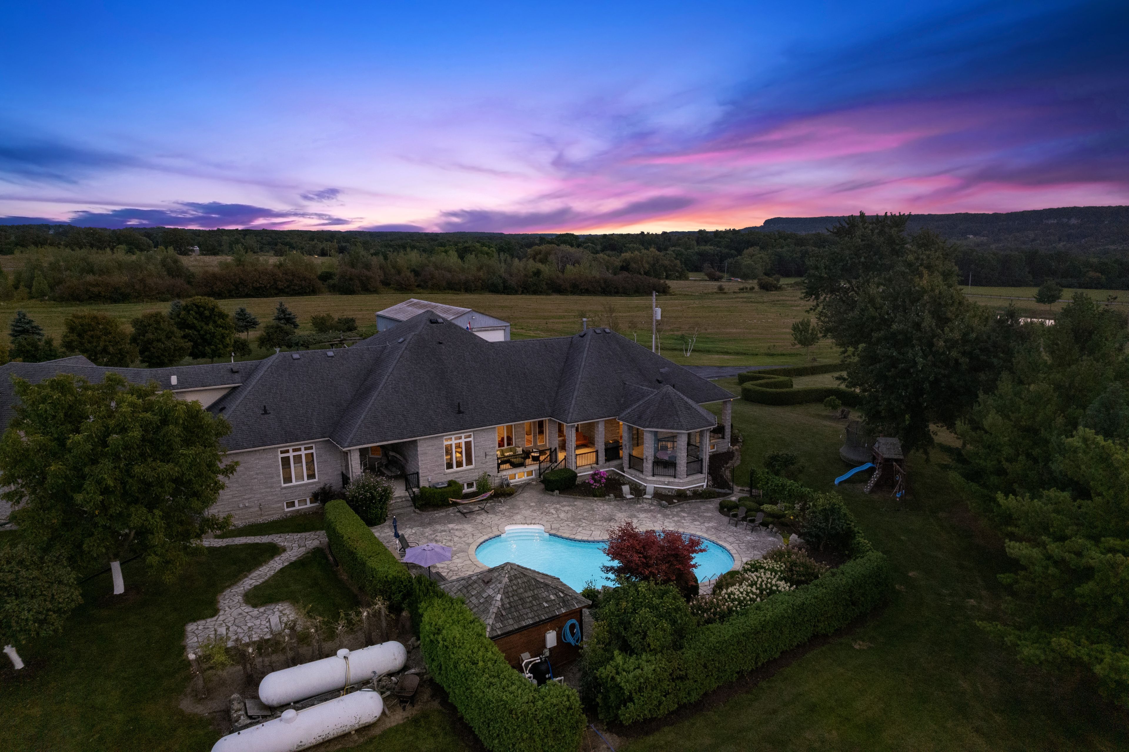 Welcome to 5431 appleby line, a sprawling 87-acre estate and one of the few remaining large parcels in rural burlington outside the niagara escarpment protection area. Offering road access from both appleby line and bell school line, the land is flat, mostly cleared, and highly functional. Just minutes to city amenities, you're 15 minutes to downtown burlington, 20 minutes to oakville, and under 30 minutes to toronto pearson international airport. Zoned ra, the property permits equestrian operations, veterinary services, boutique farming, and select agri-tourism uses. Its scale and location support immediate lifestyle or business pursuits while offering strong long-term land-banking potential. As regional planning evolves and infrastructure expands, properties of this size and positioning may become increasingly rare and valuable. With close proximity to burlington airpark, the cn intermodal yard, and major highways including the 407, with connections to the 403/401 and qew, this is a rare opportunity to secure an exceptional land asset in a corridor of ongoing growth and infrastructure investment. Surrounded by mount nemo conservation area, prestigious golf courses, seasonal camps, and renowned equestrian centres, the estate offers an immersive countryside lifestyle. The grounds include three scenic ponds, a large work shed, and expansive open space ideal for vision-driven owners. A custom-built 9,300+ sf residence sits at the heart of the property, offering five bedrooms, six bathrooms, soaring ceilings, a chef's kitchen, and a walk-out lower level with second kitchen, bar, gym, and recreation space, ideal for multi-generational living or entertaining. Outdoors, a 19-foot custom entry gate, mature landscaping, and a saltwater pool with stone waterfall complete the setting, transforming the property into a private, resort-style sanctuary. A legacy property that blends location, lifestyle and offers long-term value and enduring appeal.