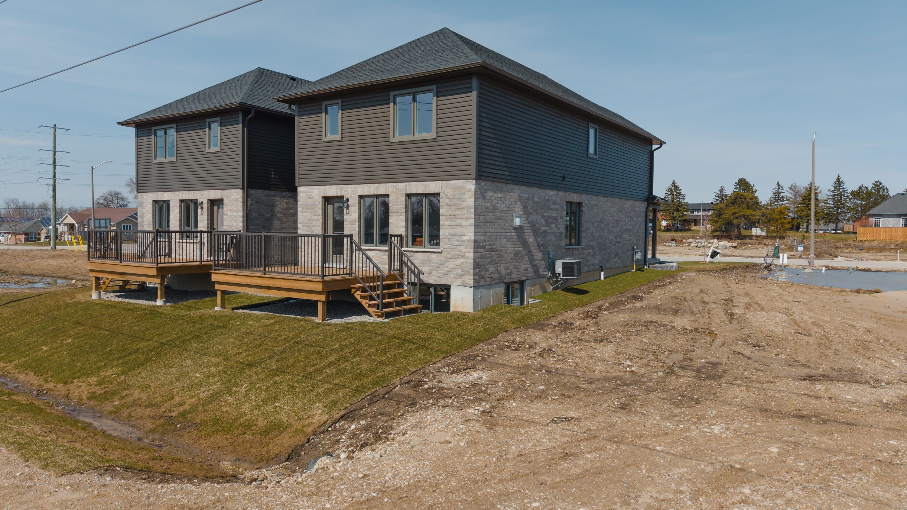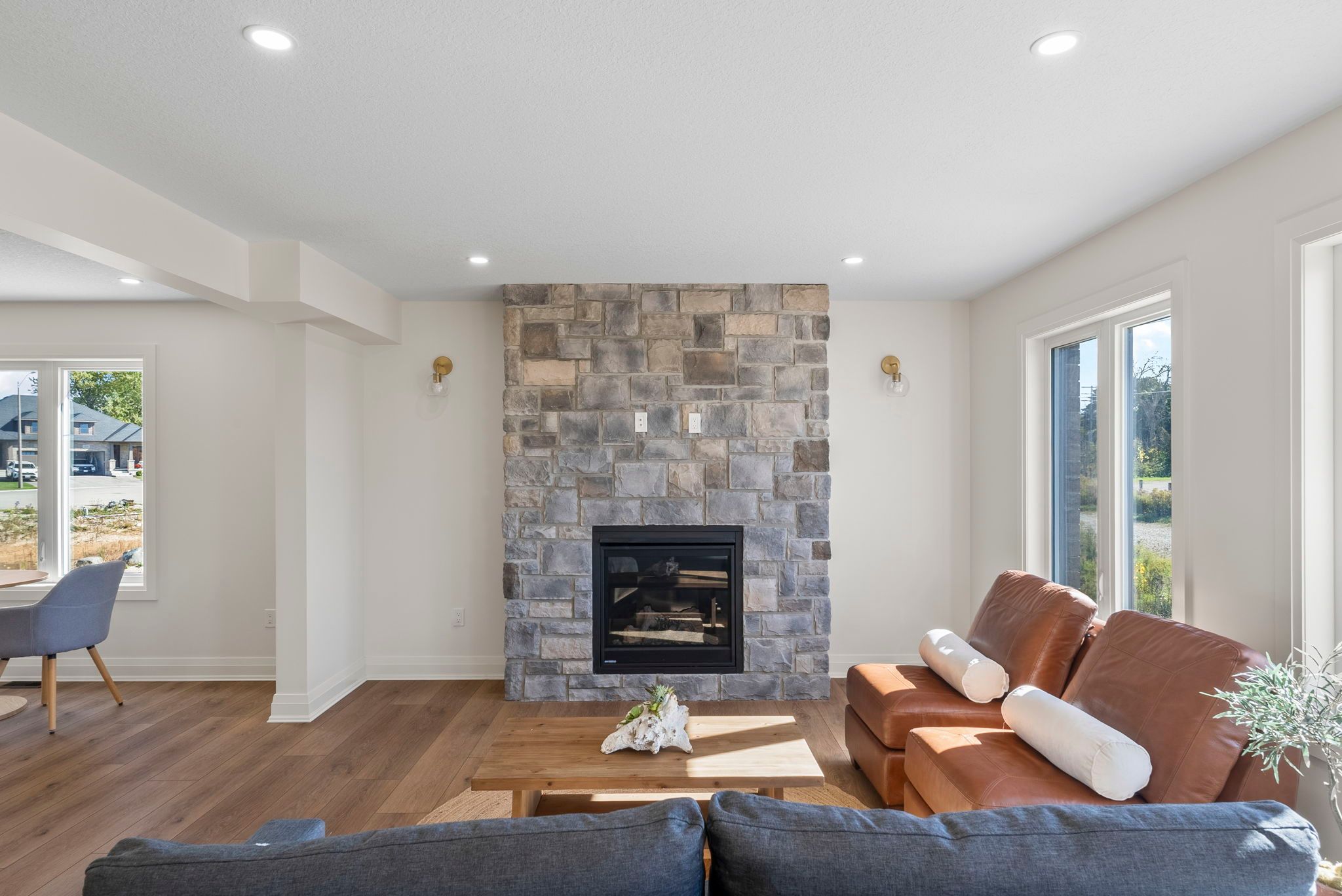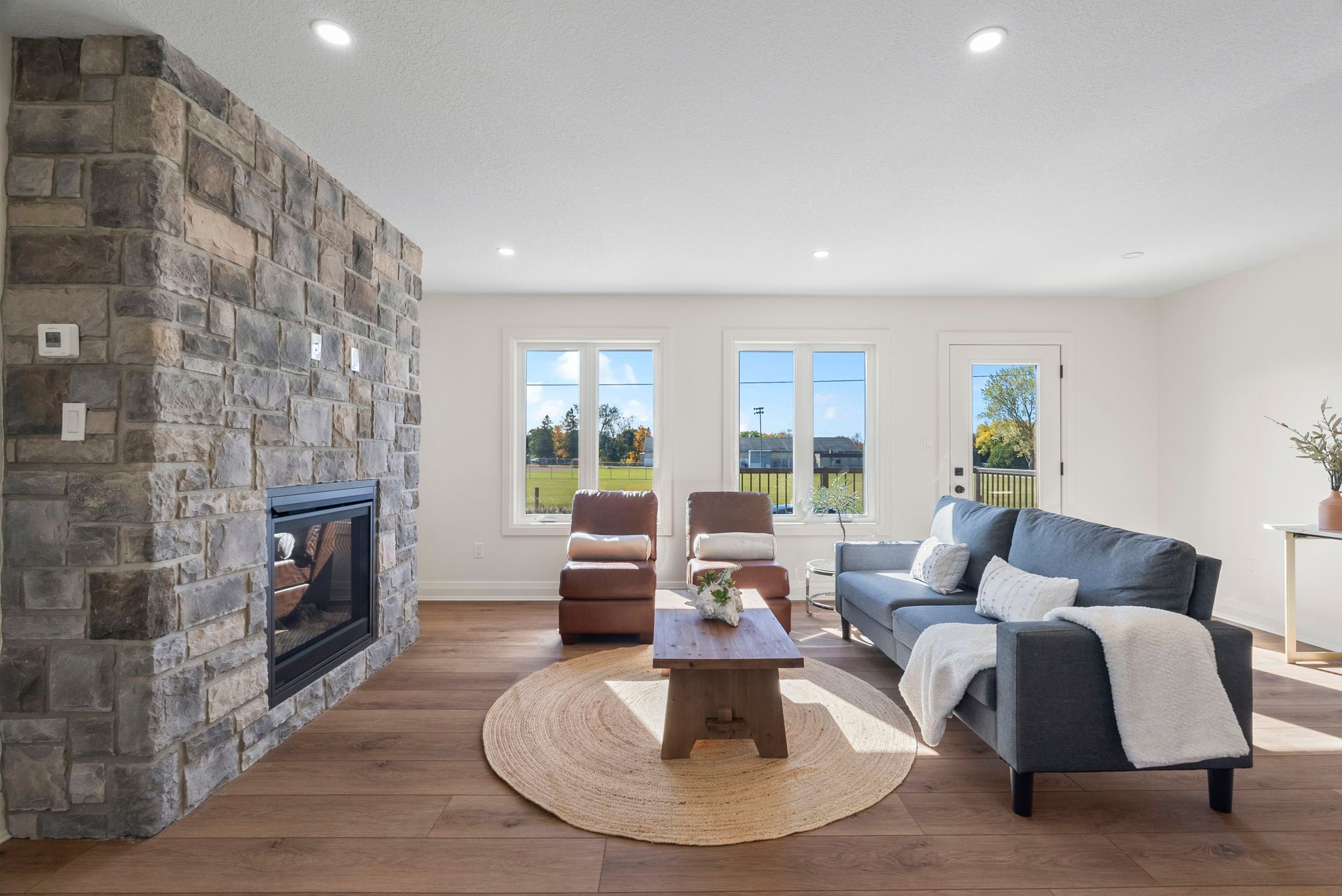 Baseball season is just around the corner, and here, the games are practically in your backyard! Tucked away on a quiet cul-de-sac in mount forest, this marlanna homes semi-detached new build offers a level of privacy that's hard to find. Connected only by the garage, which is finished in clean trusscore, you'll enjoy convenient access to both the home and backyard while still feeling nicely set apart. One of the standout features of this property is the view from the back deck, perfect for catching local ball games and soaking in those evening sunsets! Inside, the main floor is open, bright, and thoughtfully designed. A stunning stone fireplace anchors the living room, adding warmth and character. The kitchen is a true highlight, custom-built by barzotti with quartz countertops, a functional island for extra seating, with all appliances included. Luxury vinyl plank flooring runs seamlessly throughout, creating a cohesive and modern feel. Upstairs is ideal for family living, with three bedrooms and a dedicated laundry room, which means no more hauling baskets up and down stairs! The primary suite offers a peaceful retreat, complete with a walk-in closet and a deep soaker tub. Downstairs, the fully finished basement adds even more versatile living space-perfect for a rec room, home gym, or both, and includes an additional full bathroom. With immediate possession available, tarion warranty coverage, and a 50-year shingle warranty, this home is truly move-in ready. Modern comfort, quiet surroundings, and no waiting, just unpack and enjoy!