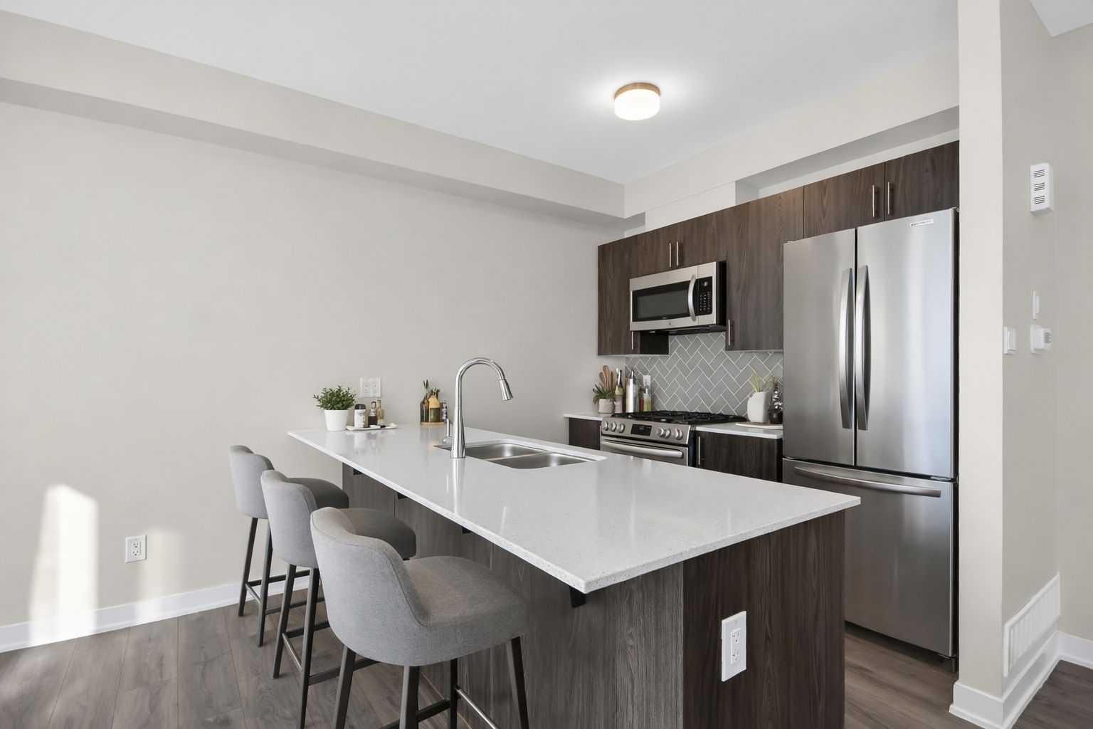• Open concept layout with a modern kitchen and granite countertops.