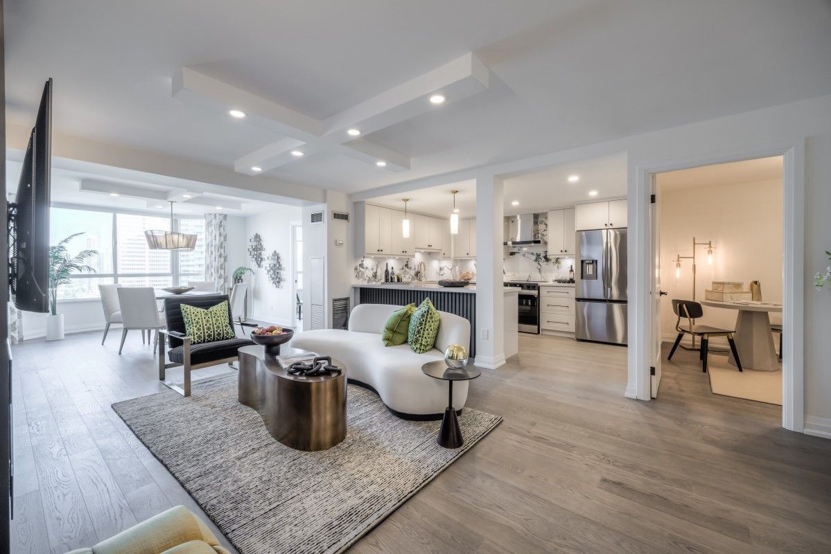 Welcome to suite 1810 at 5444 yonge st, an expansive, fully renovated 2+1 bed, 2 bath, 1429sf residence in the heart of north york city centre. Perfect for those rightsizing from a detached home or moving up from a smaller condo, this thoughtfully designed home combines spacious proportions, modern finishes, and everyday convenience. Set just off yonge and finch, the building enjoys a rare balance of city energy and neighbourhood calm. Inside, wide sightlines and an open layout connect the living, dining, and kitchen areas. A striking paneled feature wall with integrated fireplace anchors the living room, while dimmable lighting and expansive windows create a warm, inviting atmosphere for both lively gatherings and quiet evenings at home. The kitchen combines function and style with abundant counter space, custom cabinetry, and a striking backsplash, perfect for preparing meals or lingering over morning coffee. The dining room, framed by a bay window and custom drapery, sets the stage for elegant entertaining or family dinners. The versatile second bedroom and spacious den provide flexibility for guests, a home office, or hobbies, each with generous storage. Tucked away in its own wing, the primary suite is a true retreat with serene views, blackout drapery, a walk-in closet, and a beautifully finished ensuite bath. A dedicated laundry room with full-sized appliances and sink adds comfort and practicality. From every window, enjoy a choice of views: vibrant cityscapes to the east, or treetop horizons and open skies to the west. Here, you never have to compromise between energy and tranquility. Residents also enjoy a wide range of amenities including indoor/outdoor pools, fitness centre, tennis, squash & pickleball courts, billiards, bbq area, walking paths, visitor parking, car wash, concierge, party room, guest suites, and 24h security. This is turnkey luxury living at its best: spacious, refined, and perfectly connected to everything you need.
